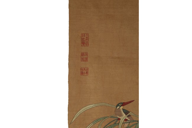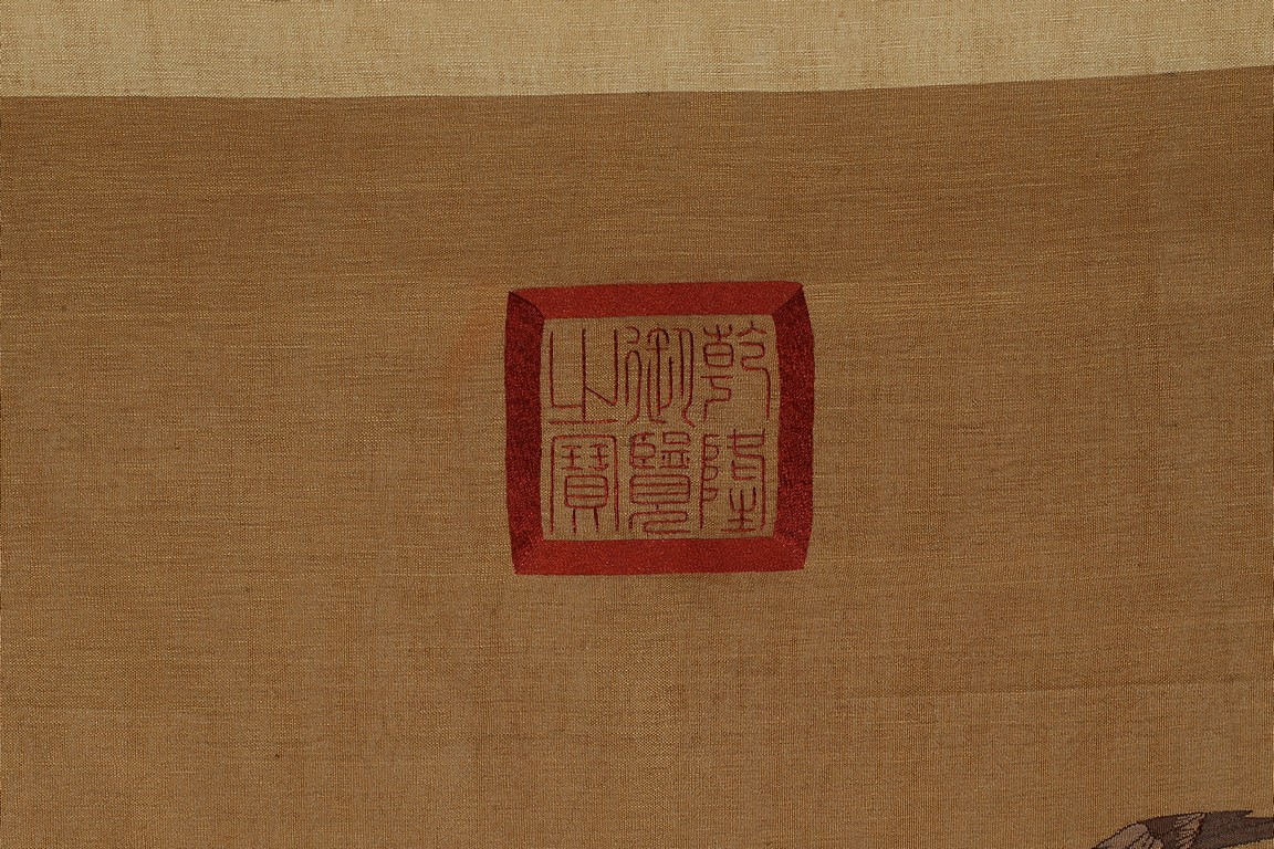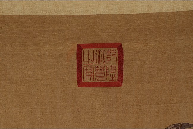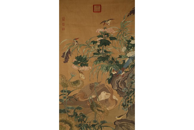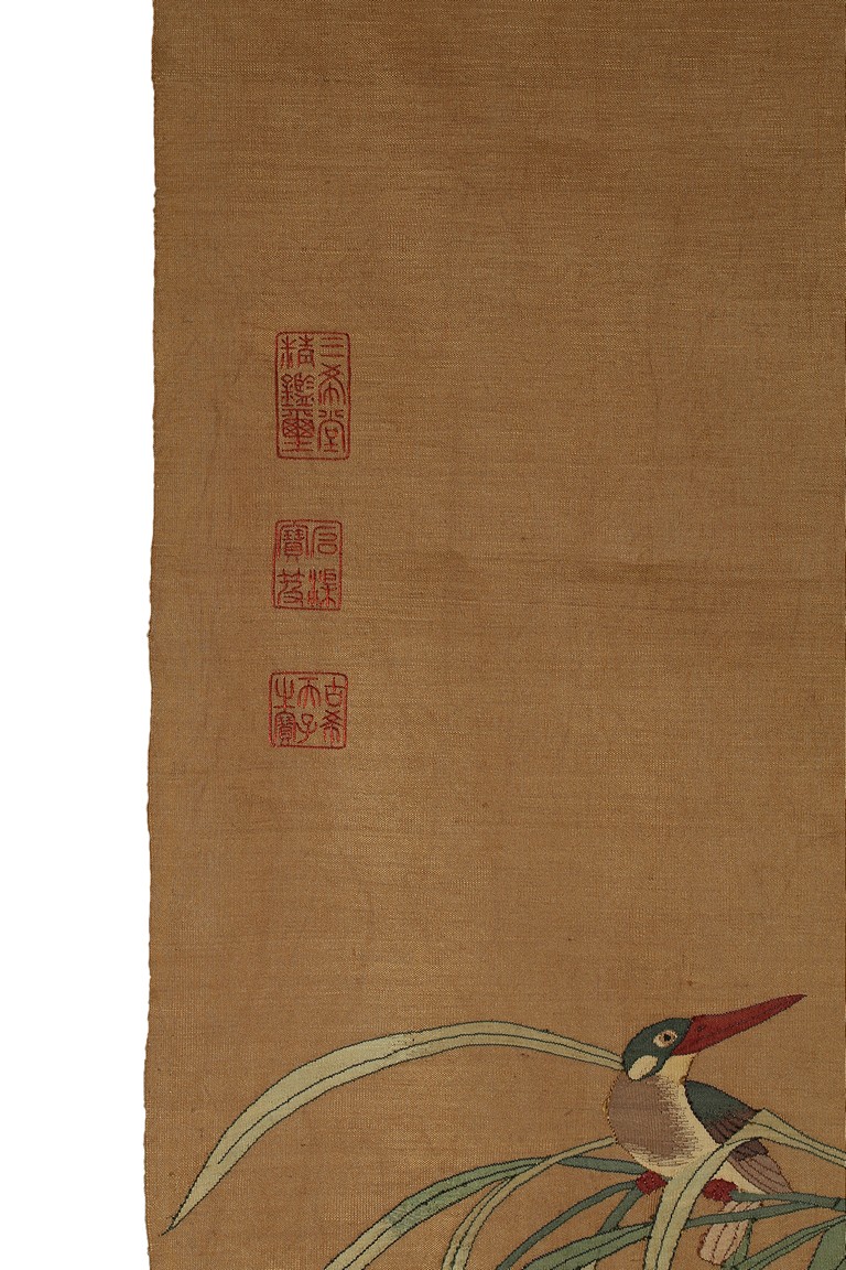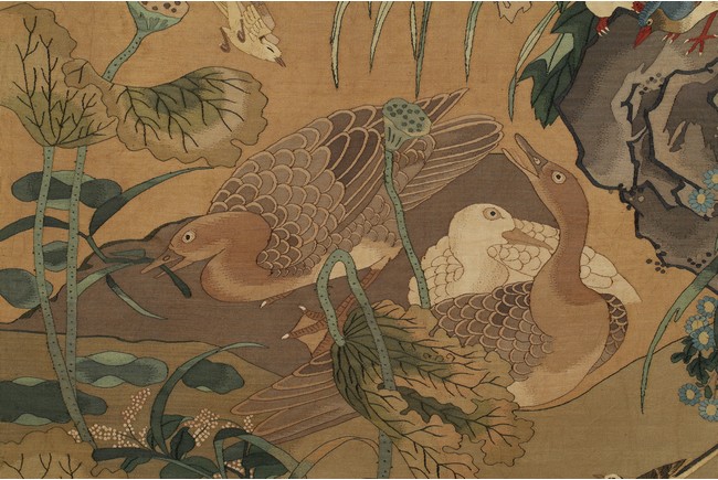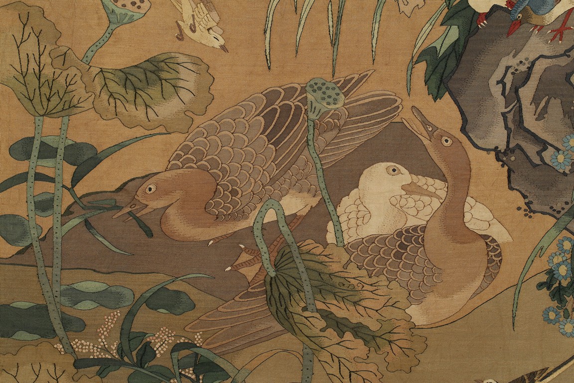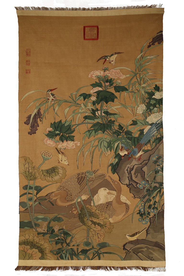 Richly embroidered in bright colors with swimming ducks in pond among lotus, all below a rocky outcrop with birds perching on top and peonies issuing from the side, all against a beige background, with woven seal marks.