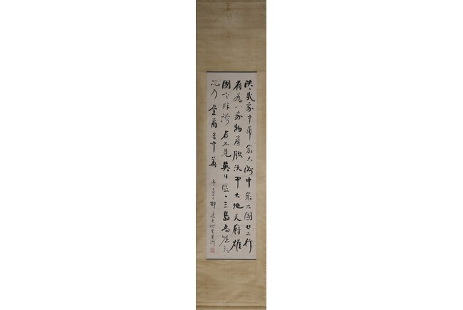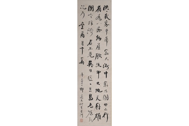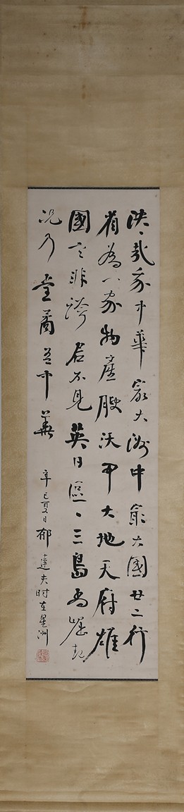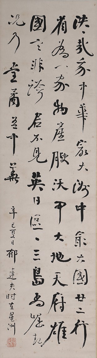 Ink on paper. Running script calligraphy. Hanging scroll. Signed Yu Dafu and with one seal, dated summer of 1941.