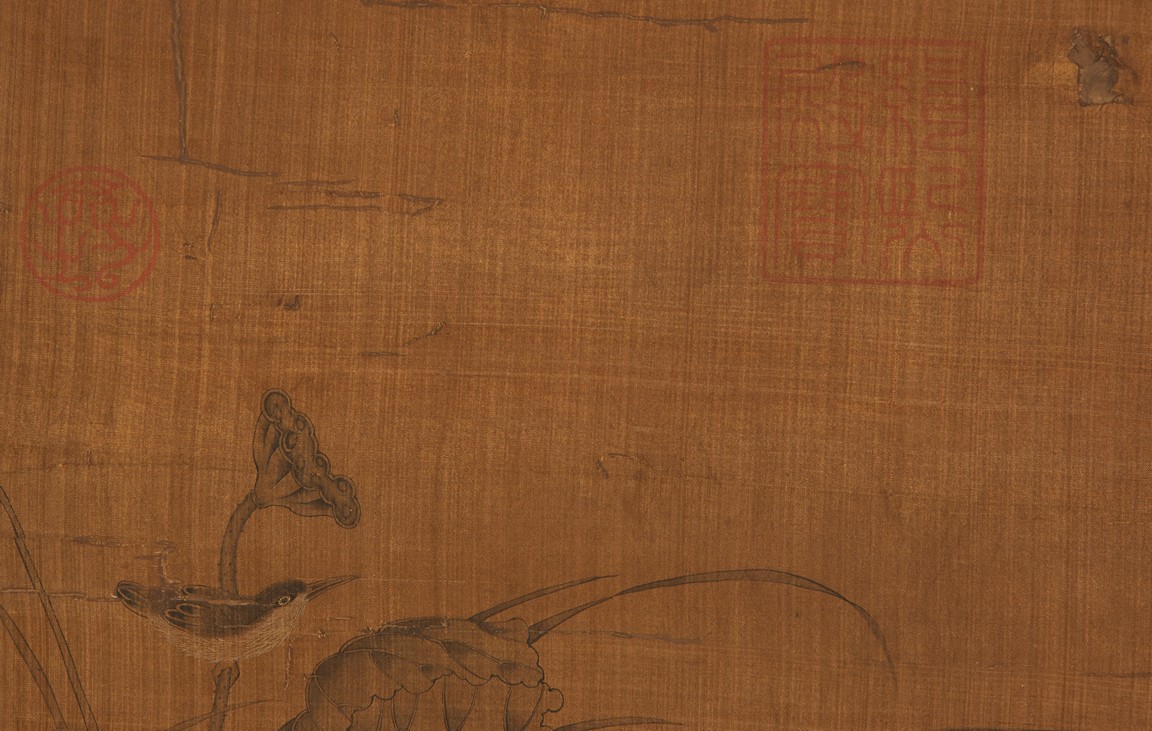 Color and ink on silk. Goose and Lotus. Hanging scroll. Anonymous. With three seals of collectors.