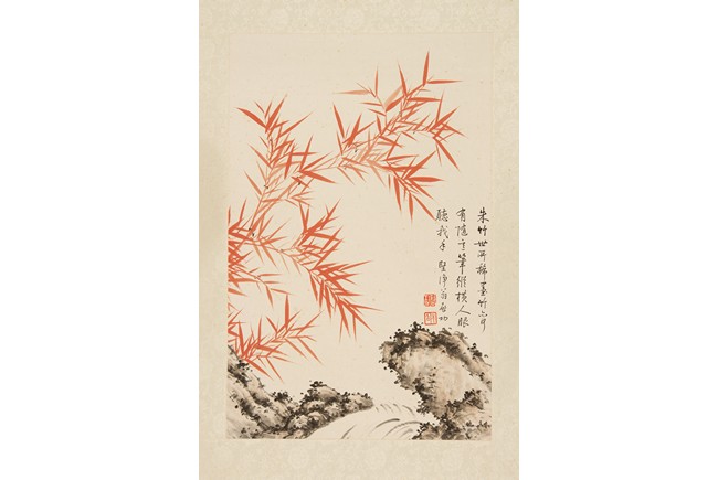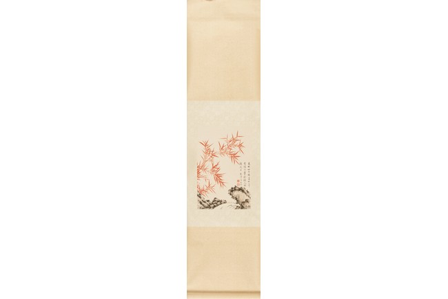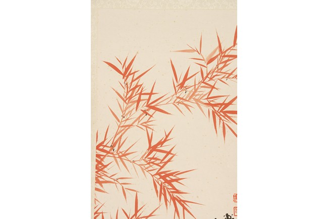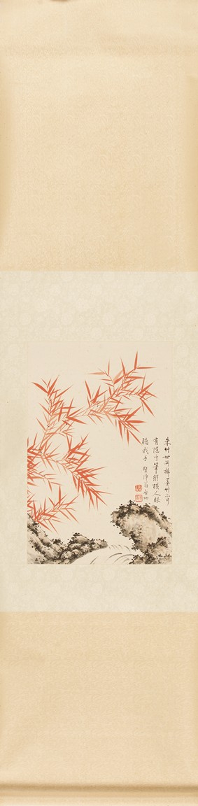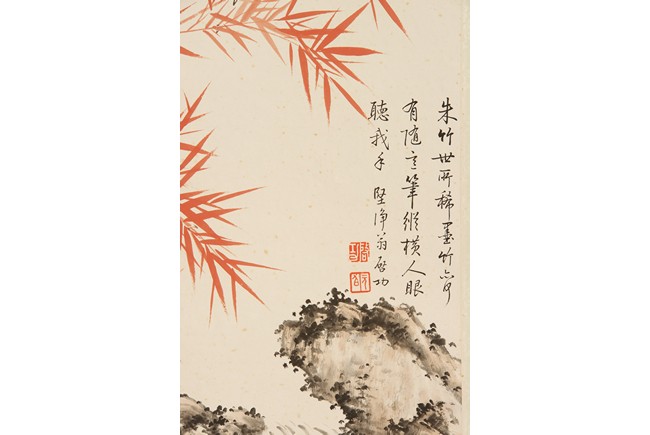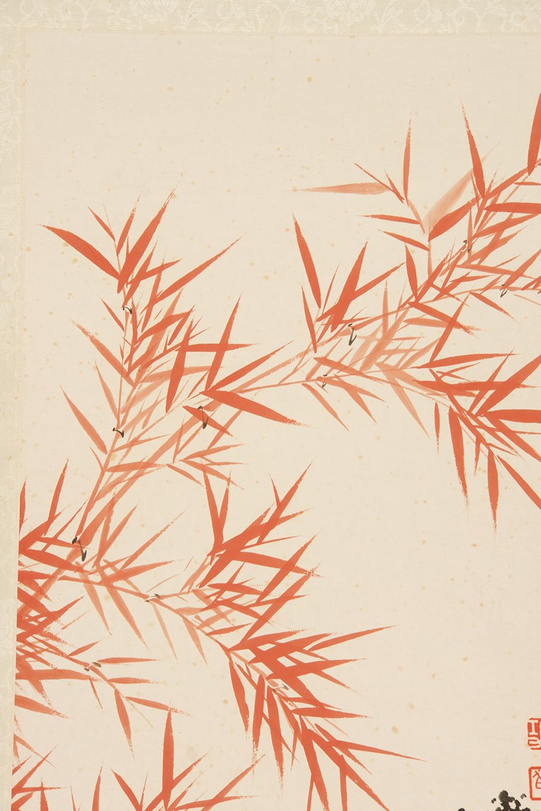 Color and ink on paper. Bamboo. Hanging scroll. Inscribed and signed Qi Gong, with two seals of the artist's.