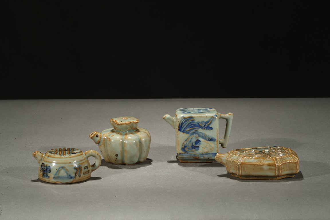 Consisting of four miniature ceramic ewers in different forms and designs. Ming/Qing Dynasty period.