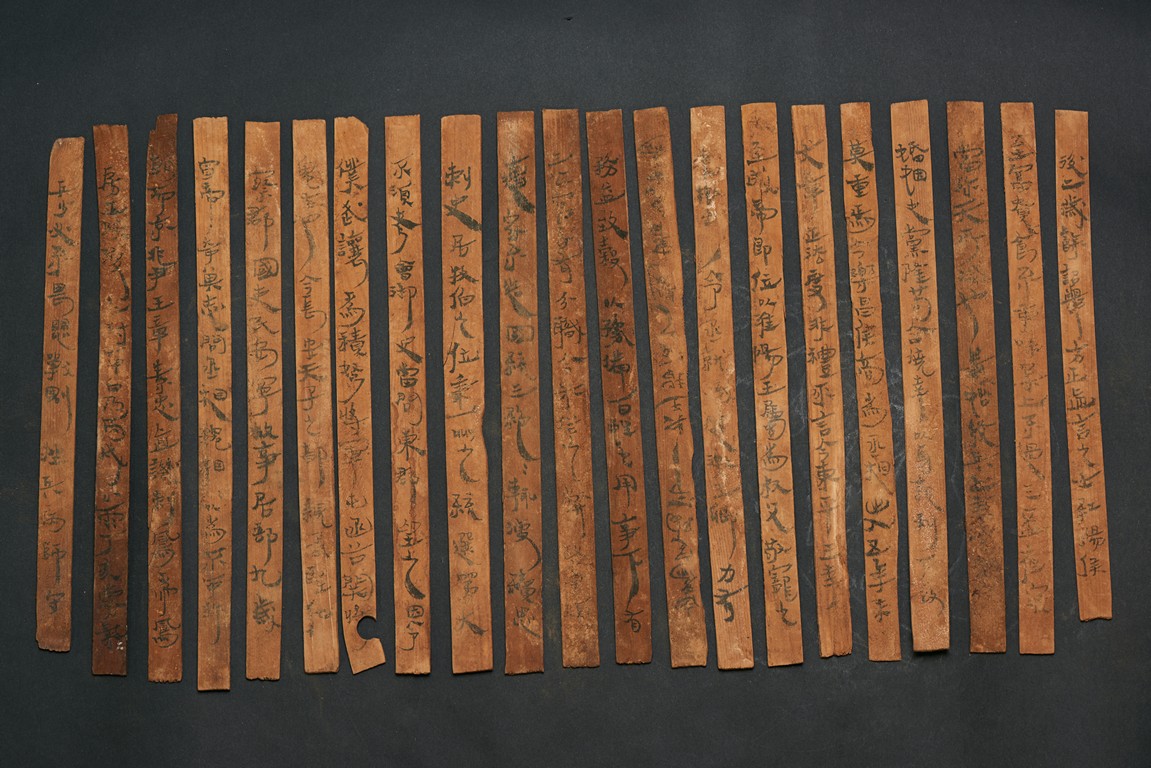 Composed of twenty one long rectangular bamboo slips, each with archaic inscription.