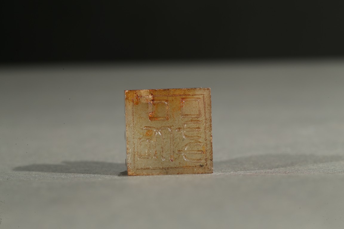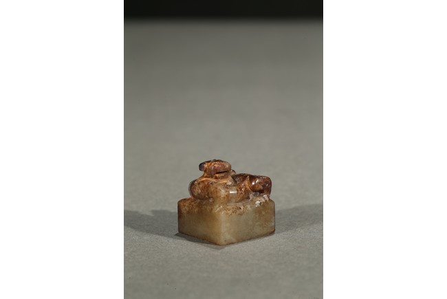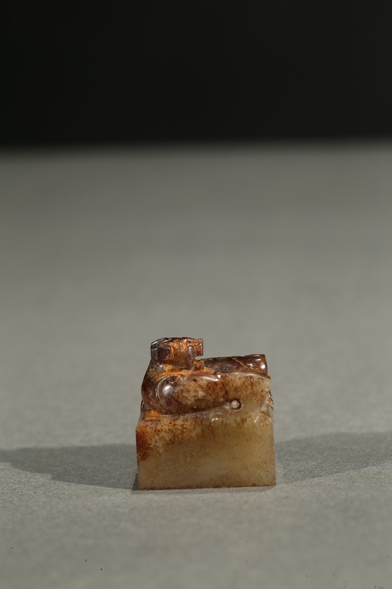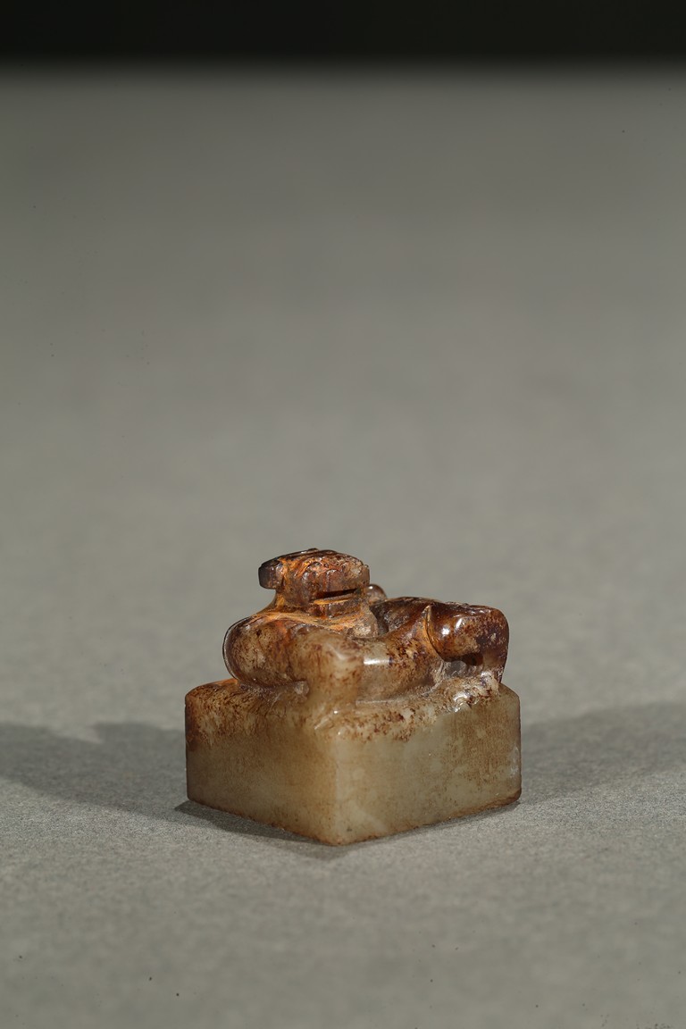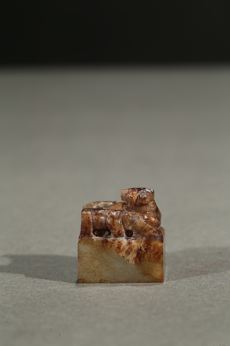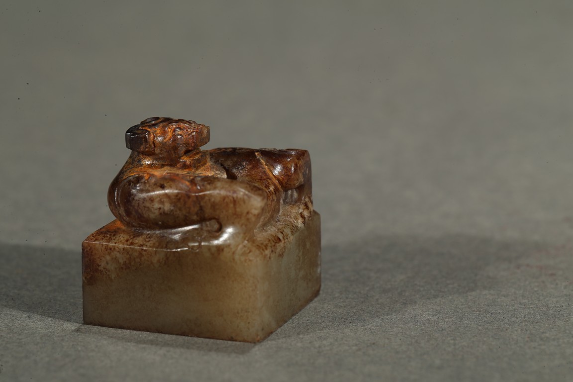 Of square section, the jade seal surmounted with a curled mythical beast, the seal face with archaic inscriptions.