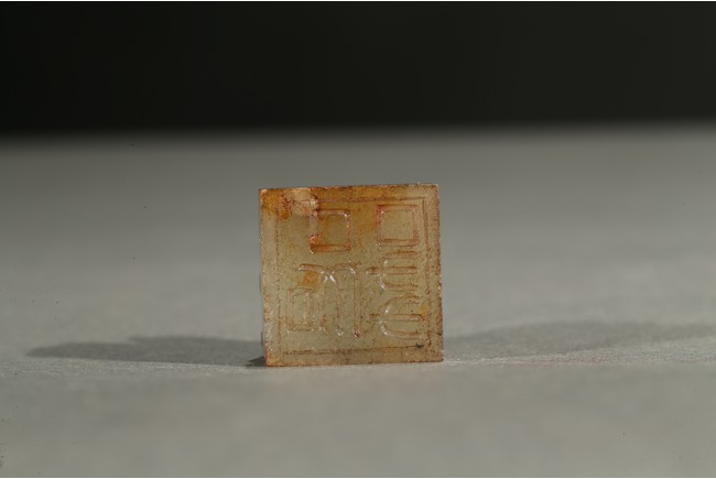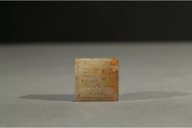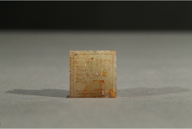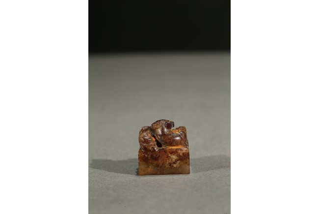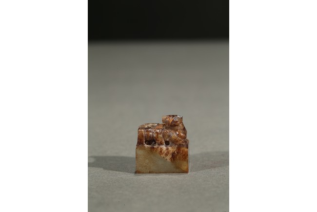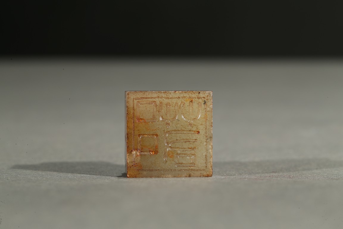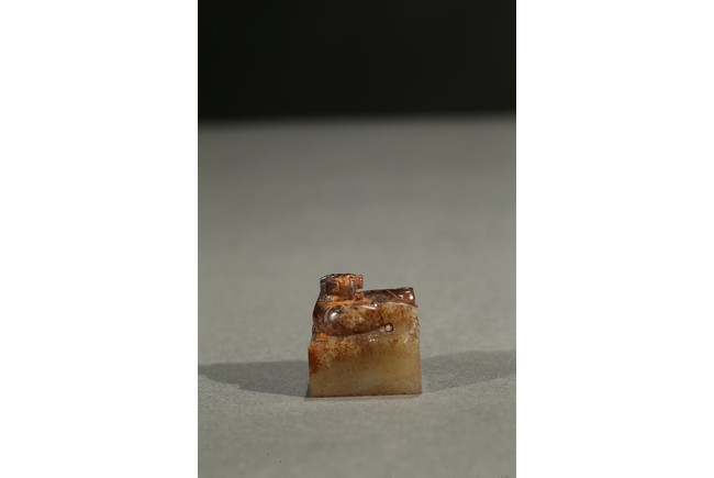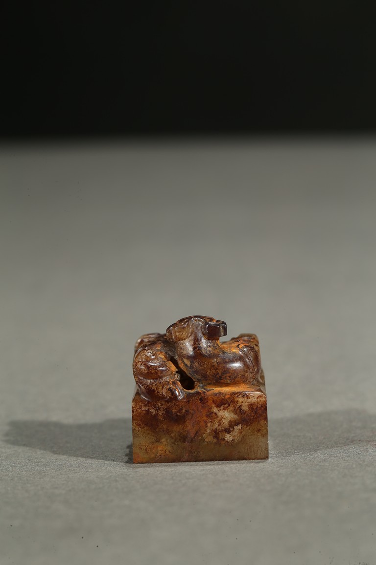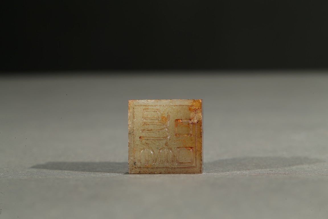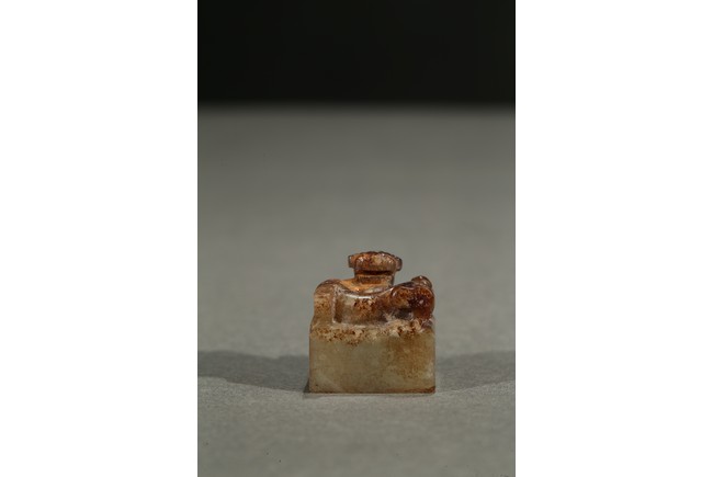 Of square section, the jade seal surmounted with a curled mythical beast, the seal face with archaic inscriptions.