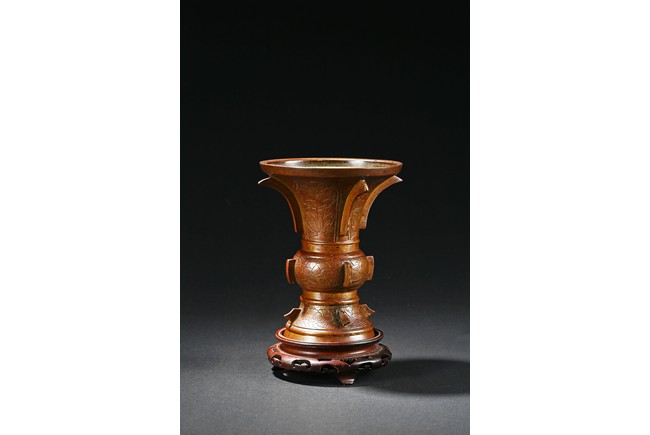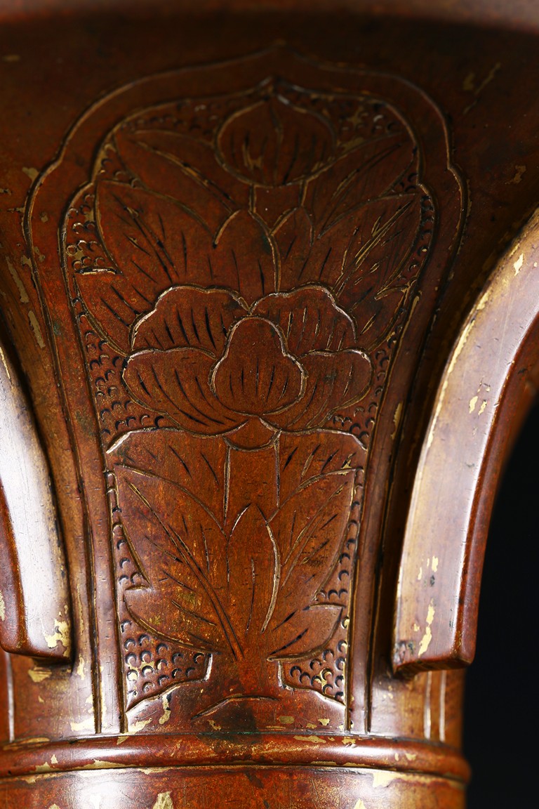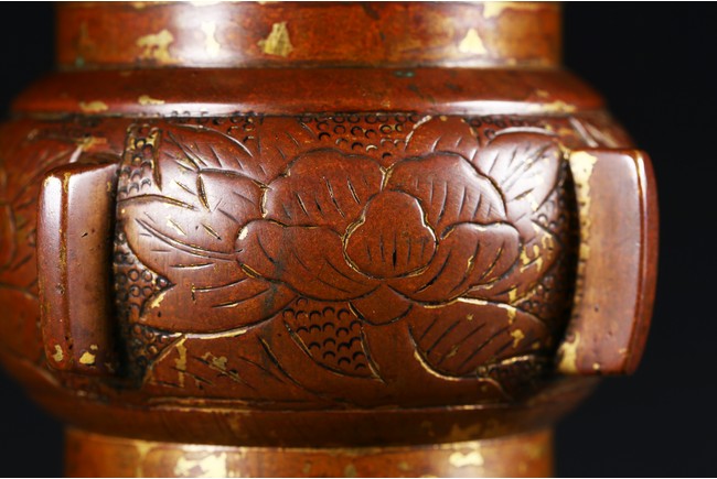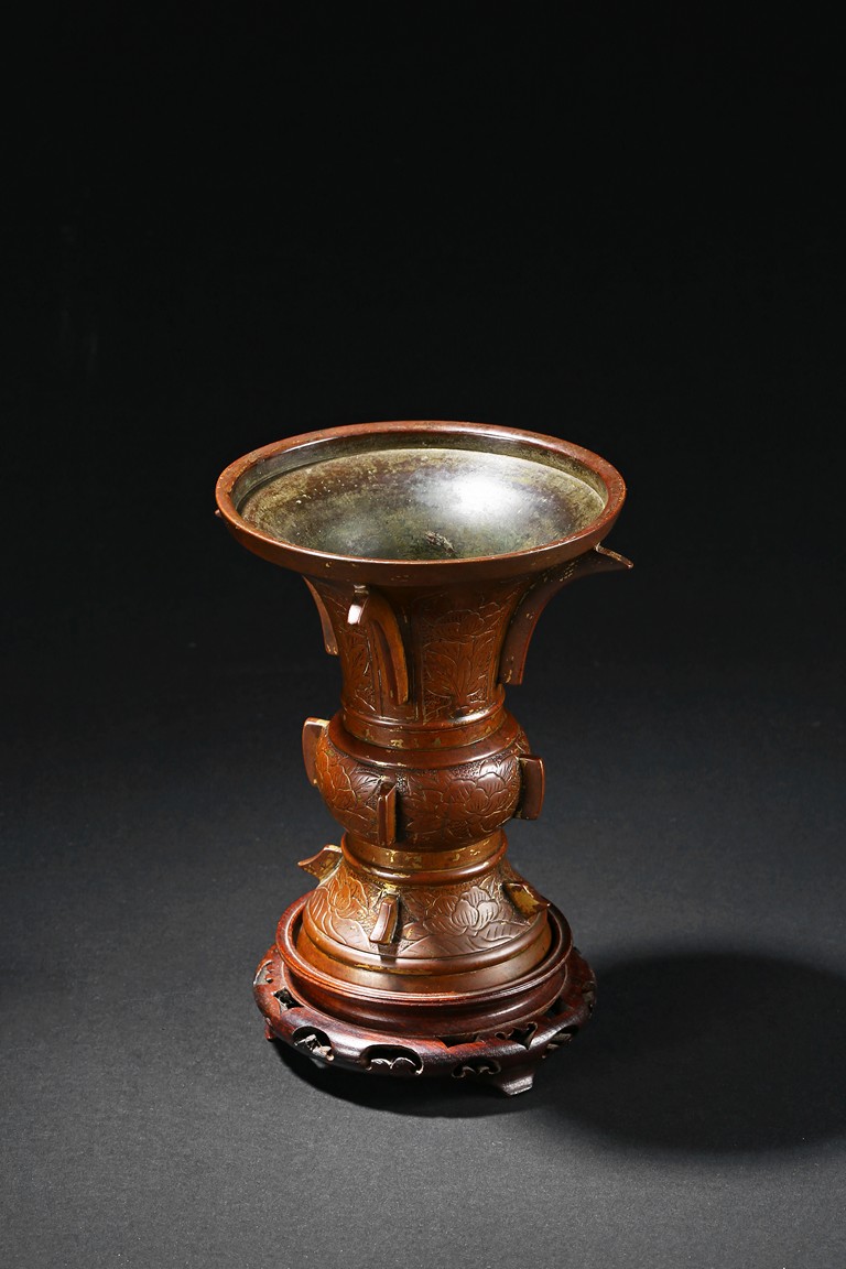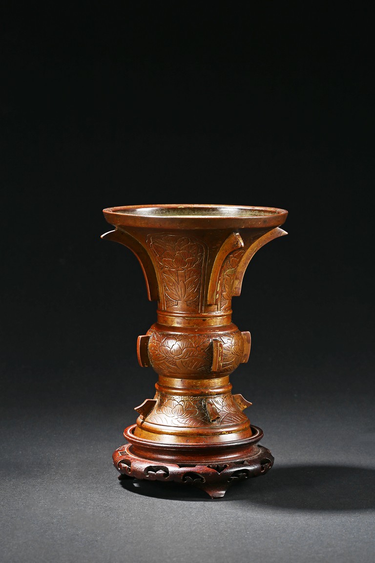 The well-proportioned bronze-form body is applied with flanges that accentuate its shape. The bulbous mid-section is finely incised with leafy lotus decoration. The trumpet-shaped neck is similarly decorated with lotus scene. Republic period.