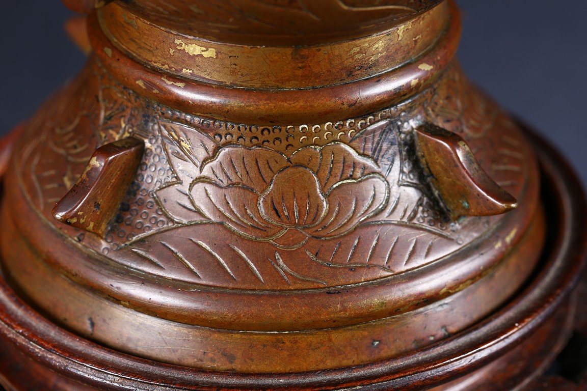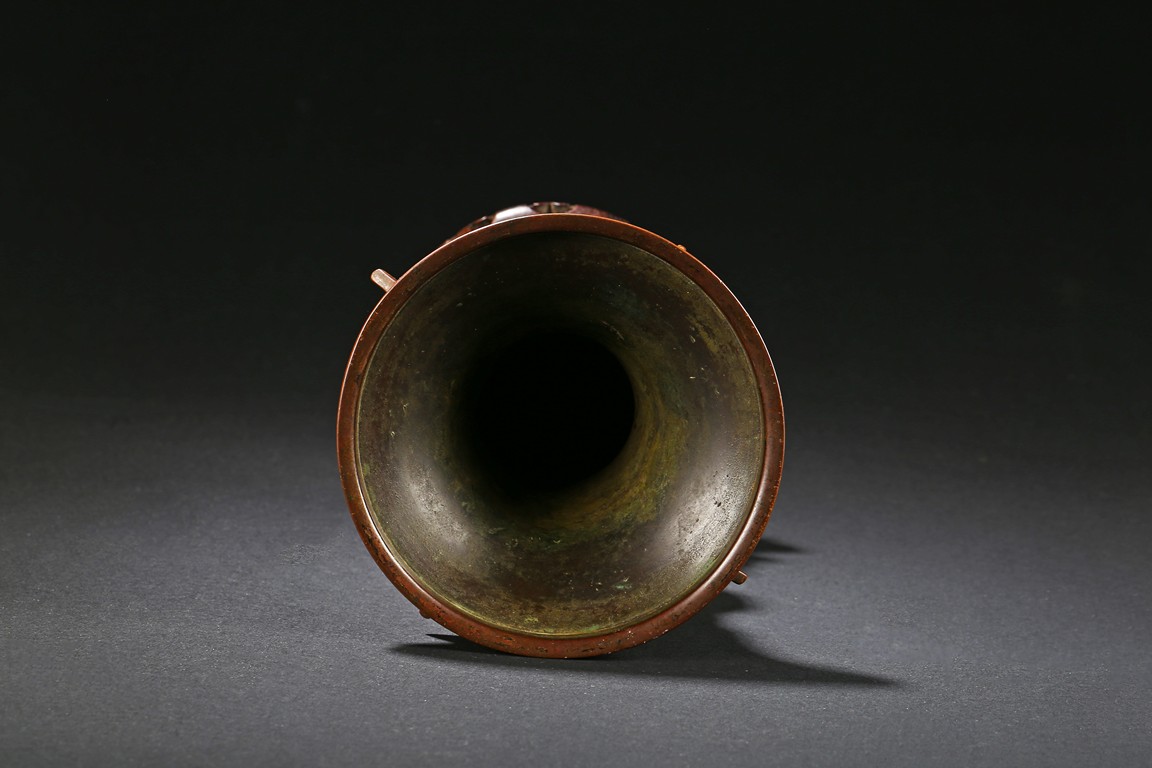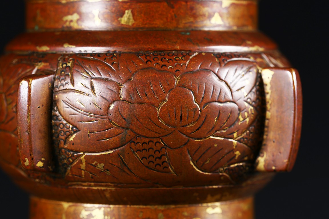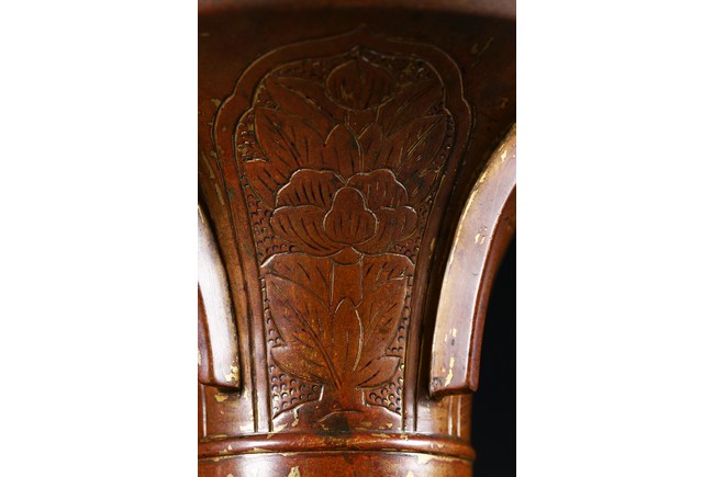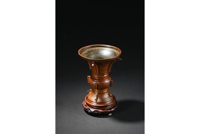 The well-proportioned bronze-form body is applied with flanges that accentuate its shape. The bulbous mid-section is finely incised with leafy lotus decoration. The trumpet-shaped neck is similarly decorated with lotus scene. Republic period.