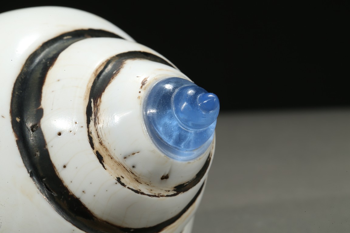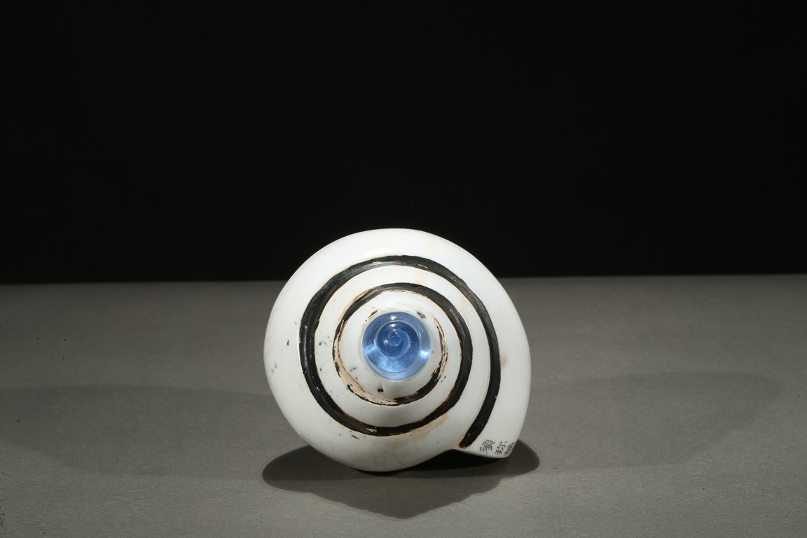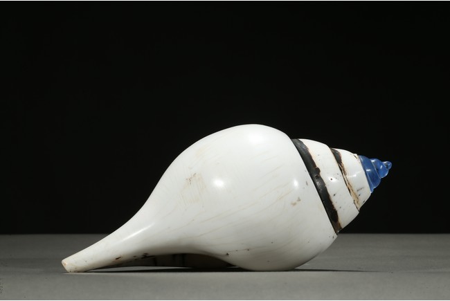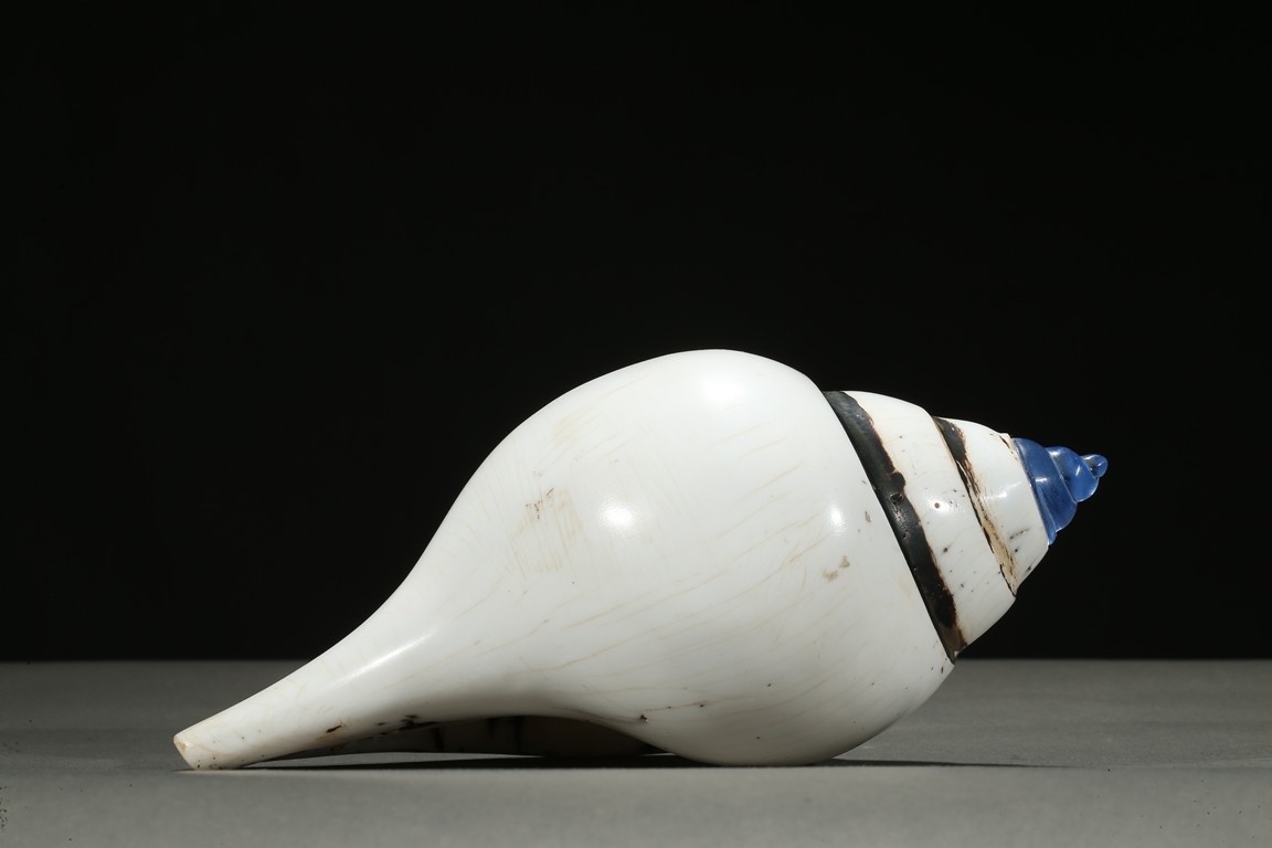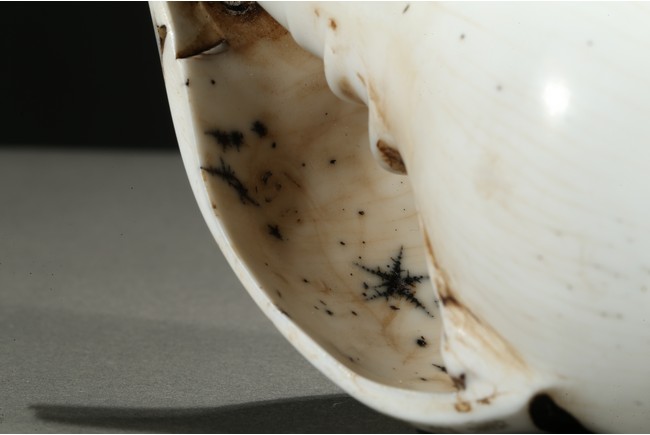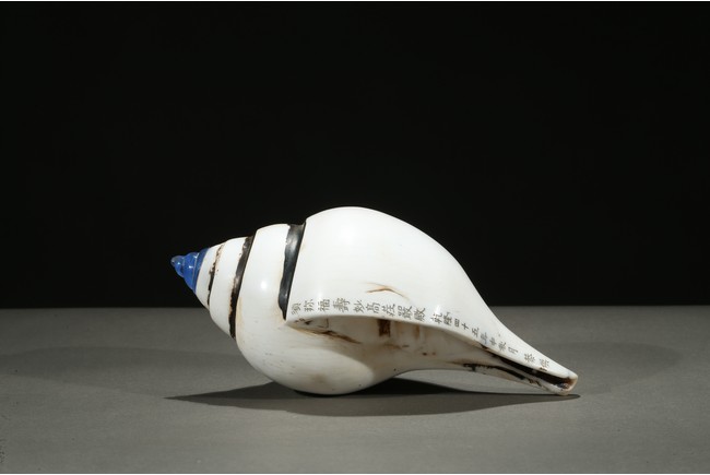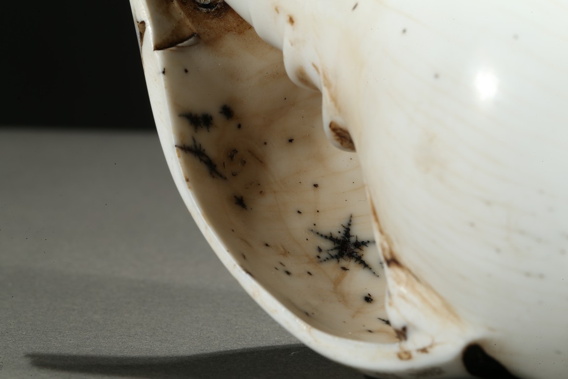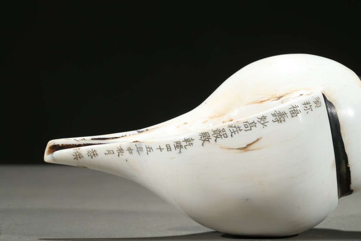 The white conch shell is finely incised with inscriptions to the mouth rim dated to the forty-fifth year of Qianlong reign.
