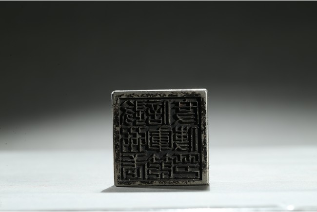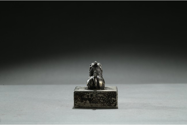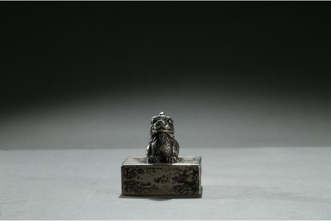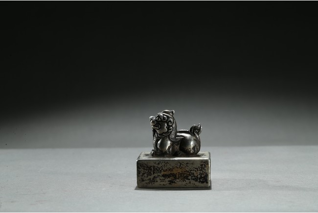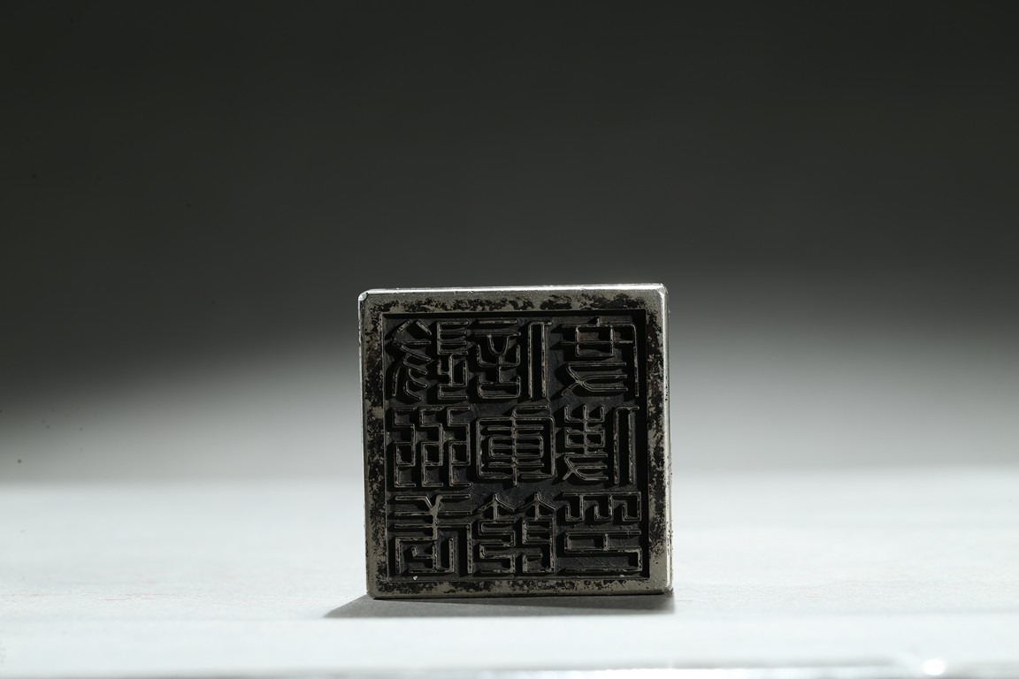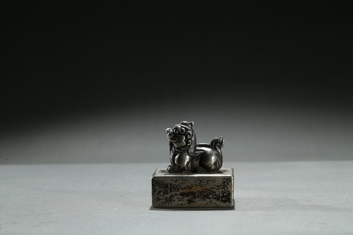 Of square section, top surmounted with a recumbent mythical beast with incised mane and tail, the base with nine character. Qing Dynasty period.