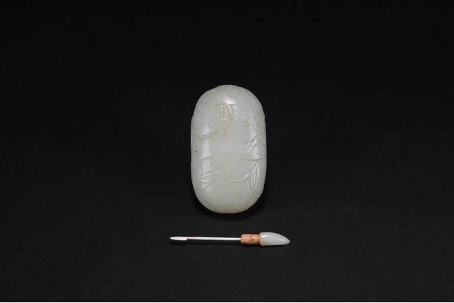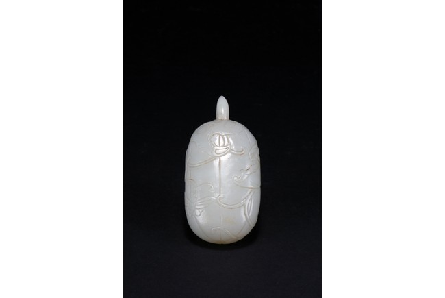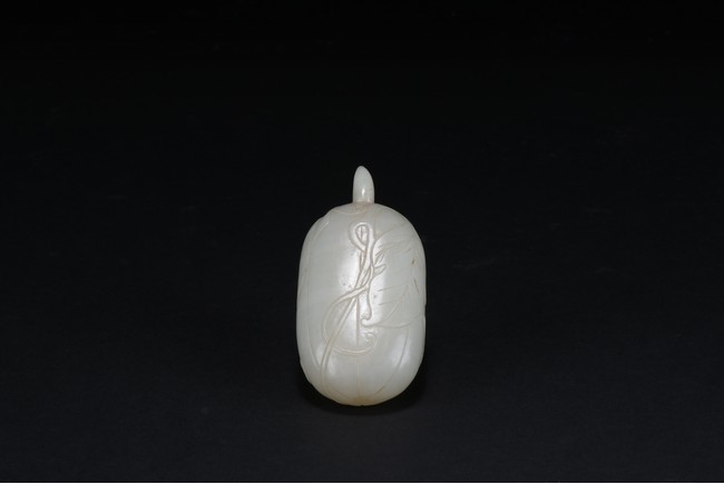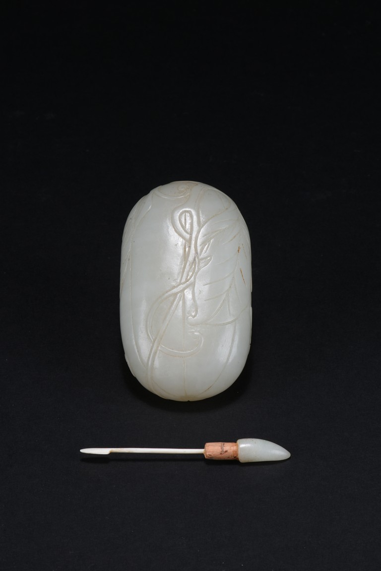 Of ovoid form, one side incised with leaf pattern, the other with scrolled branches and a butterfly. Qing Dynasty period.