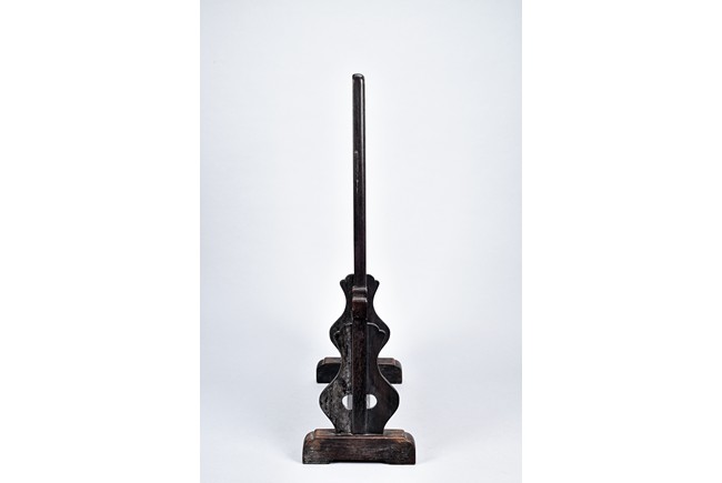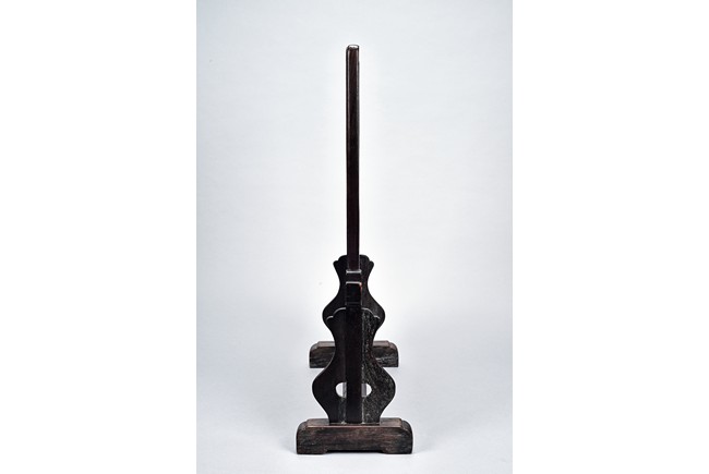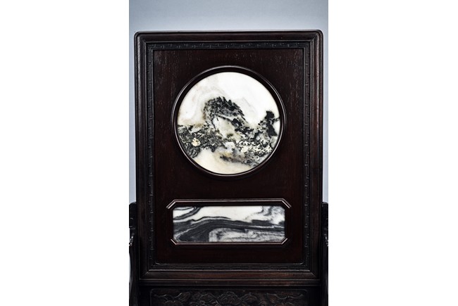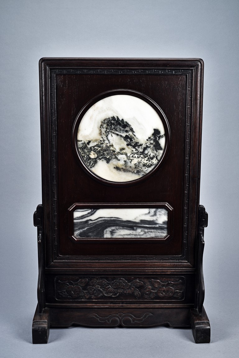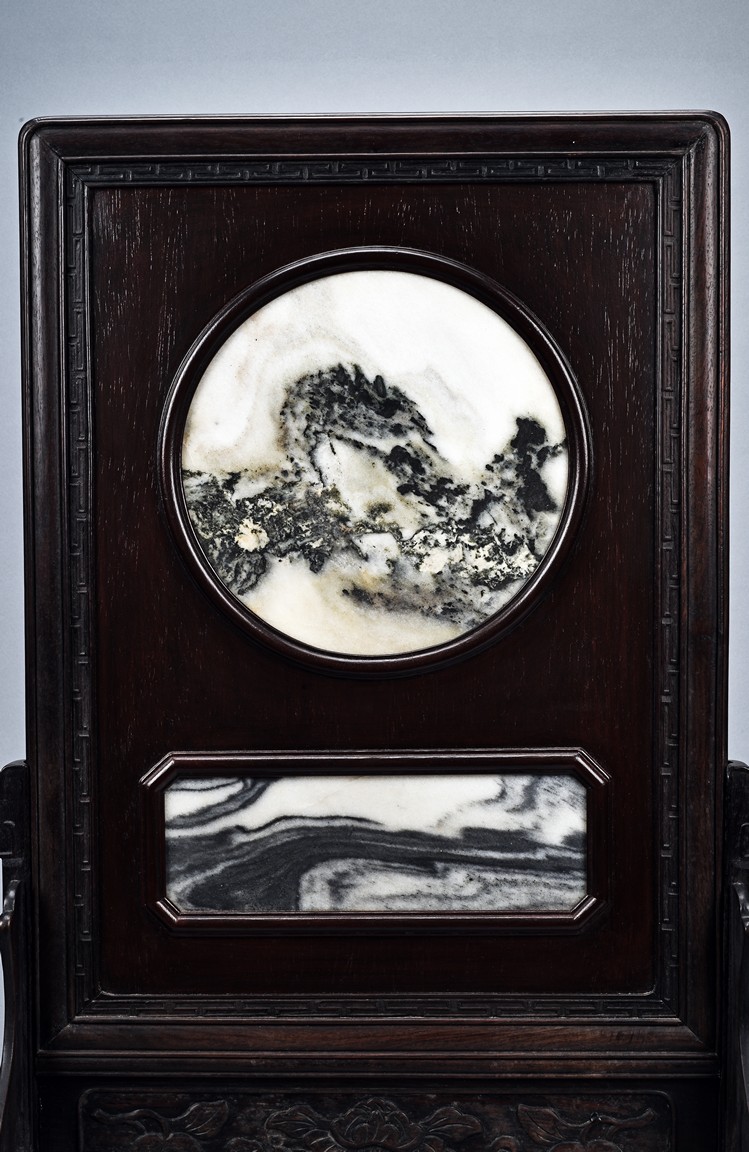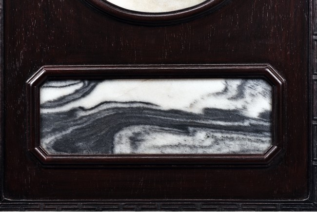 Of rectangular form, the circular and rectangular 'cloud' marble plaques with grey and dark brown striations set within wood frame, the stand carved with scrolling fruits and leafy flowers in shallow relief. Republic period.