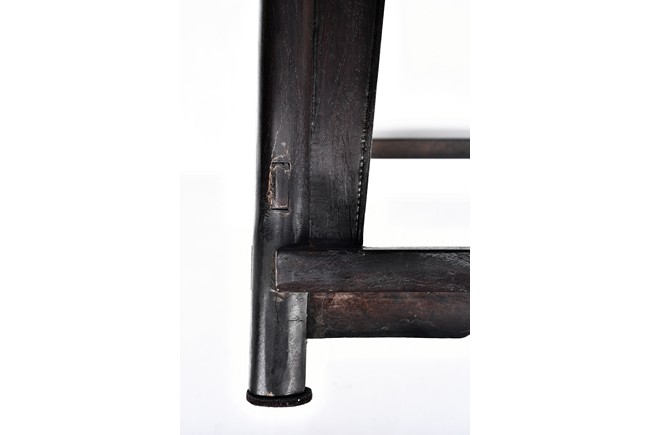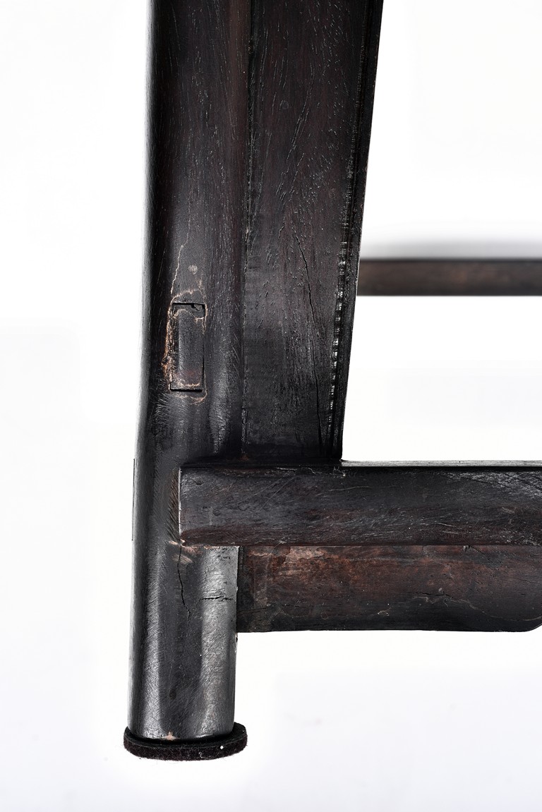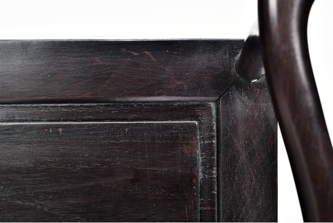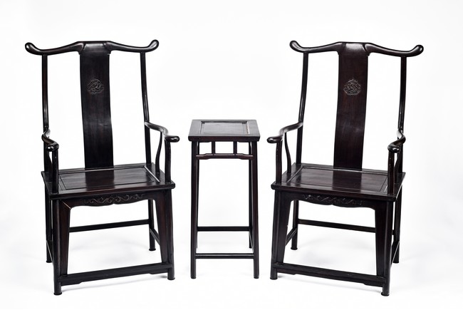 Including a pair of chairs, each with gently curved top rail, the S-curved rectangular splat carved with chilong medallion, flanked by upper extension of rear legs forming the corner posts, the arms supported on complex lattice-like side posts and raised on goose-neck supports at the front, the rectangular seat framed with 'ice-plate' edges, above stepped base stretchers and foodrest; and a stand with square upper surface raised upon four tall round-section legs joined by humpbacked stretchers. Republic period.