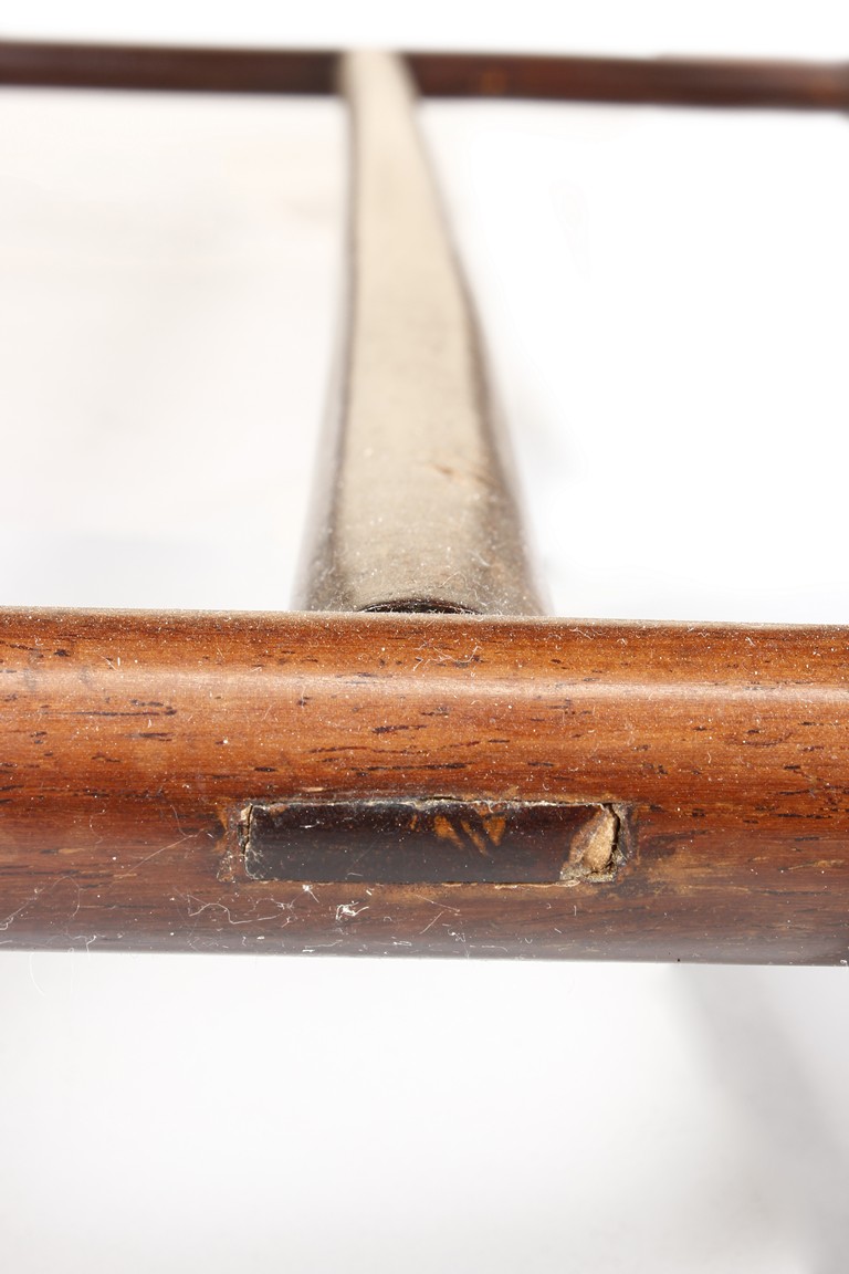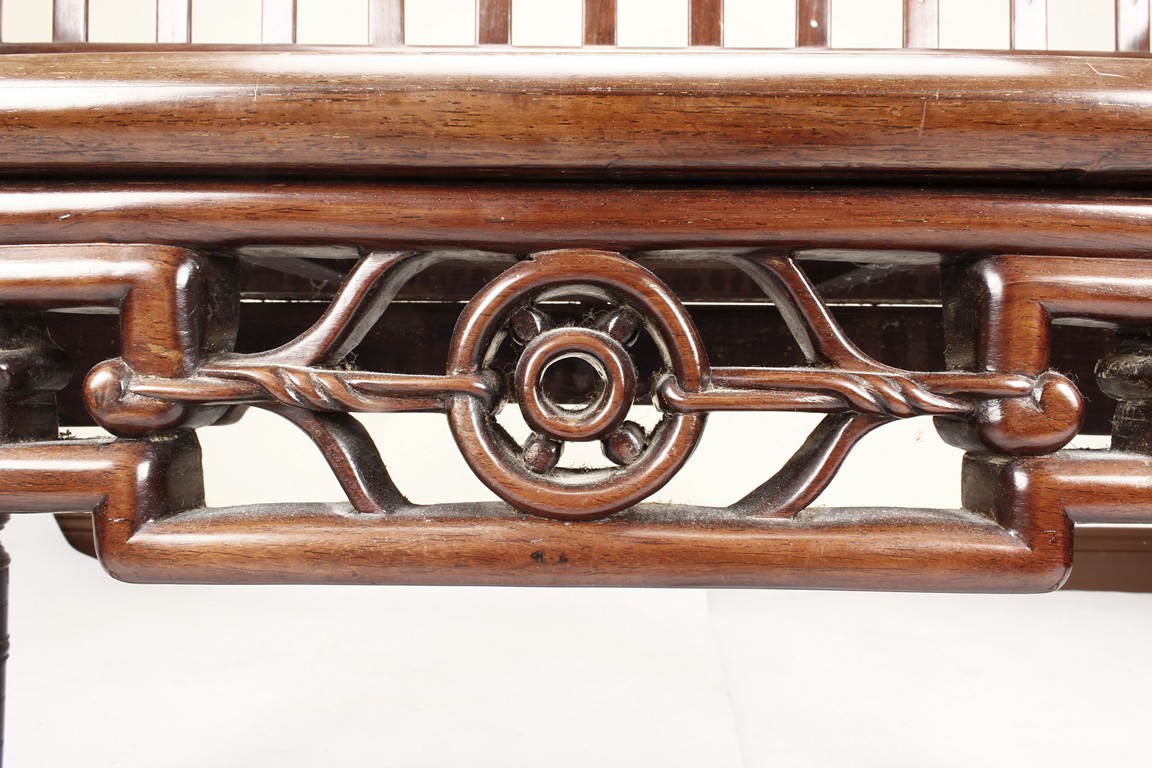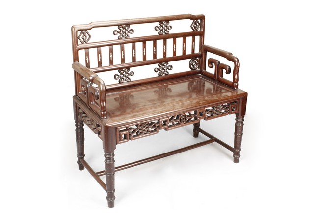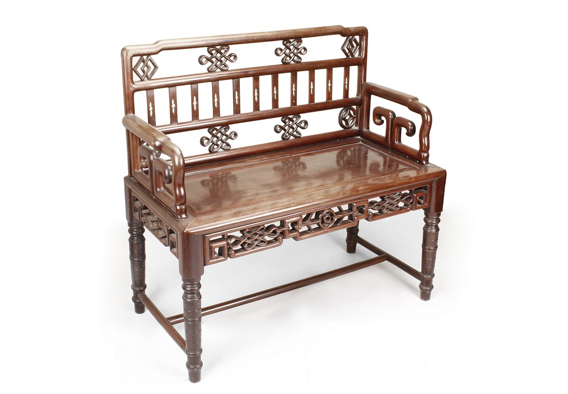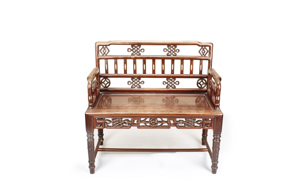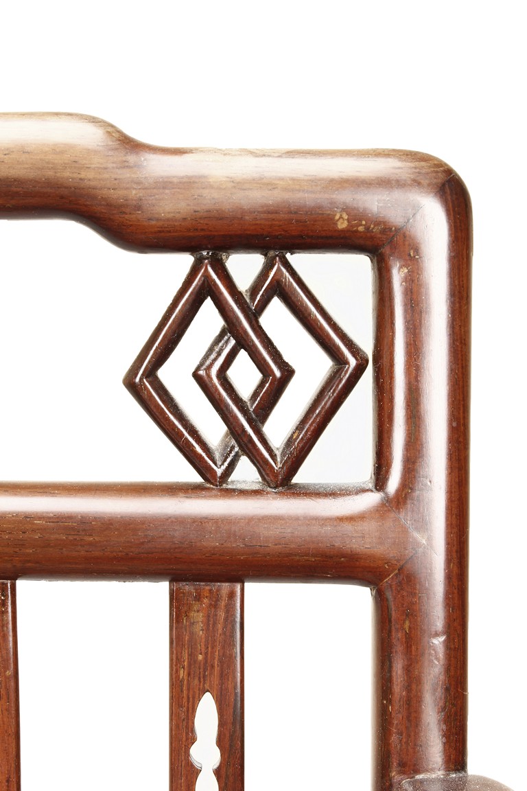 The back of this chair encloses an spindle-formed framework flanked by interlocking knots patterns and the arm rails enveloping an cloud motif above apron of similar knot design. It is raised by four cylindrical fluted legs. Republic period.