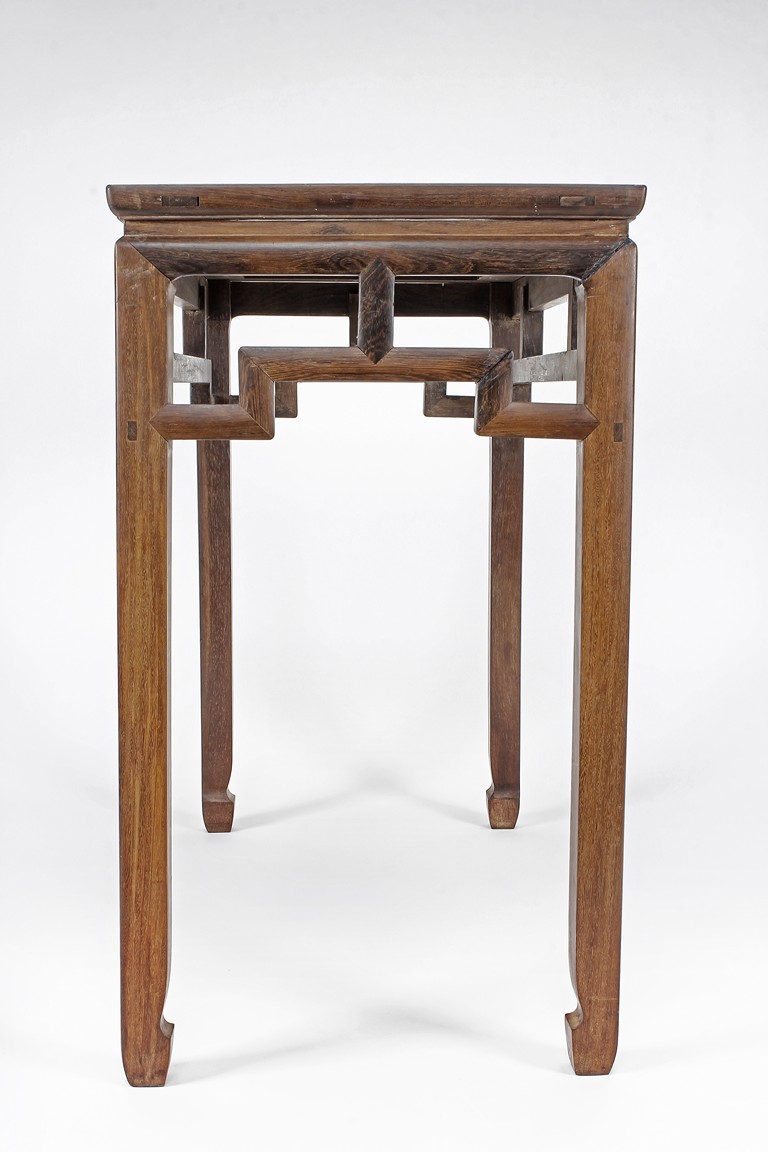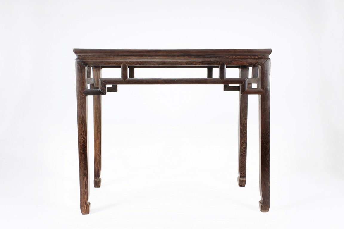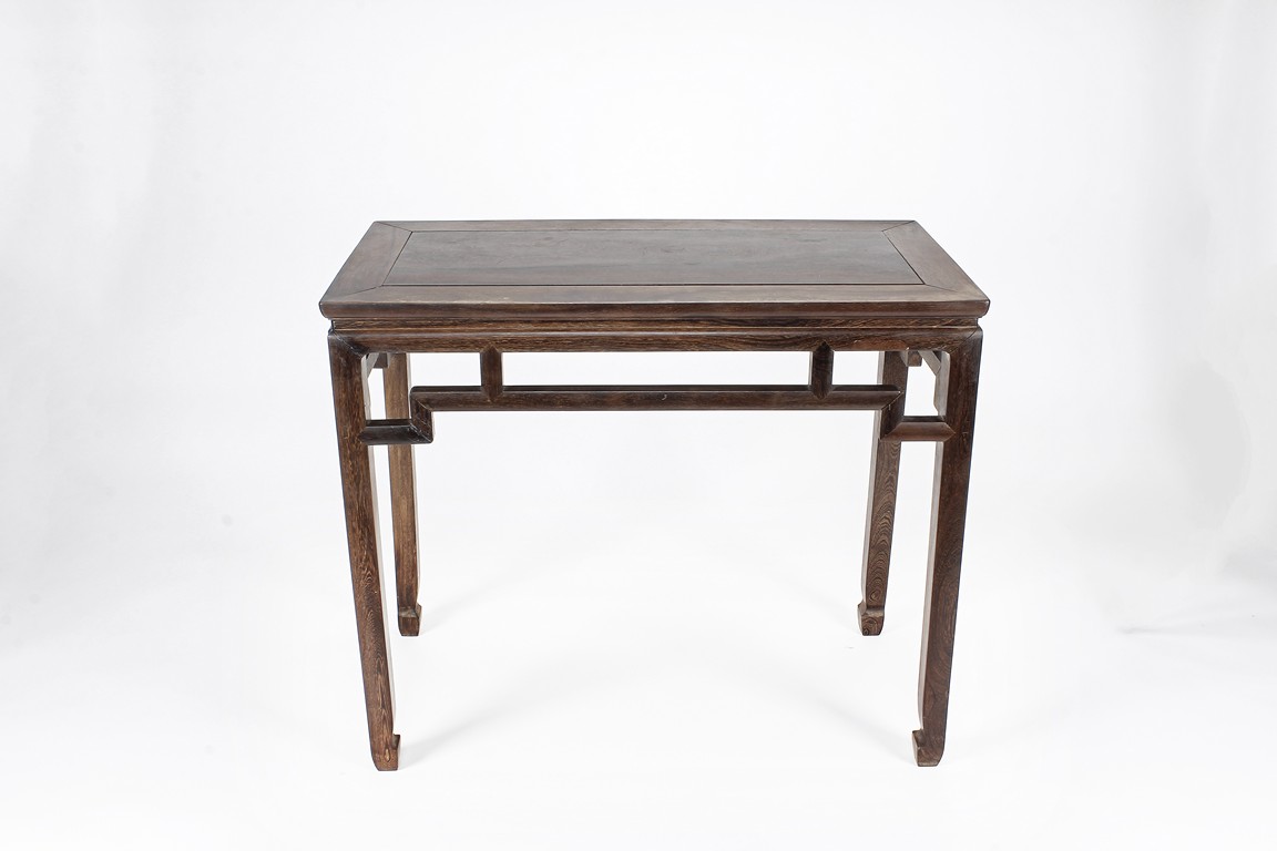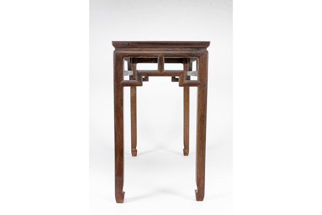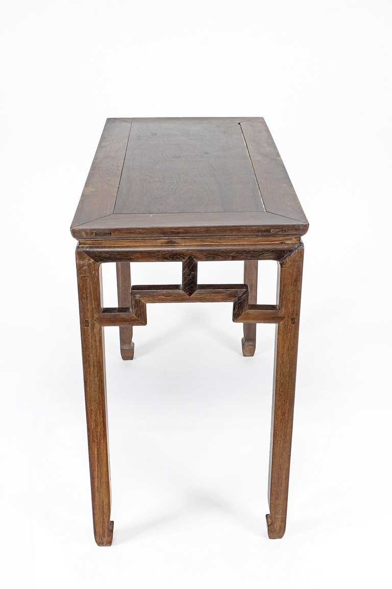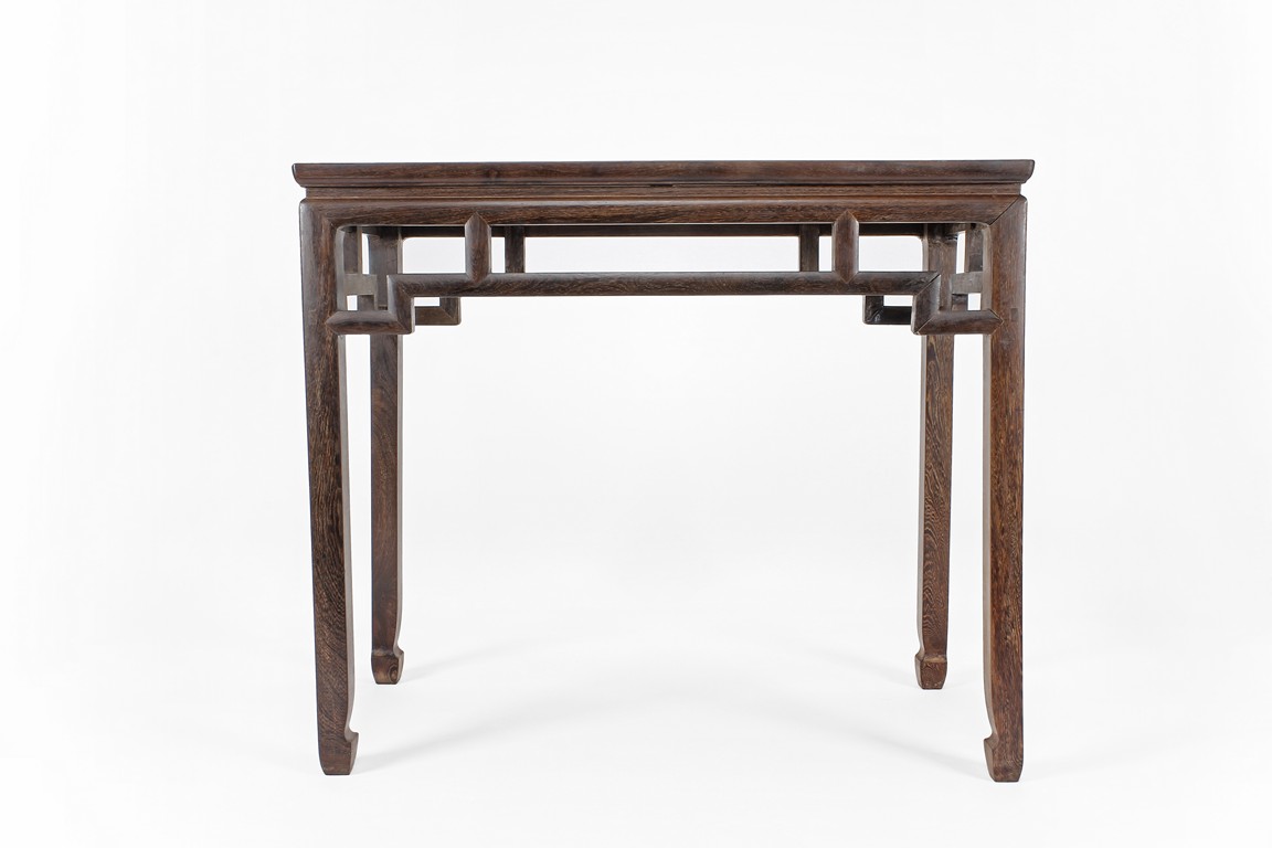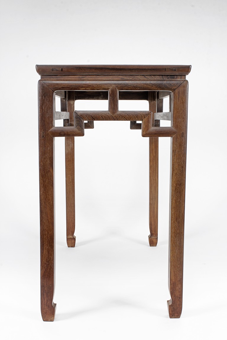 The rectangular top panel is set above a simple lattice pattern apron, the corner legs flush at right angles and are of rectangular section and end in roof feet. Qing Dynasty period.