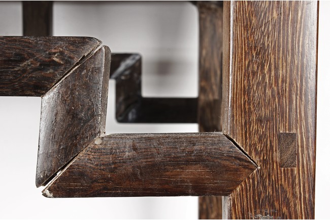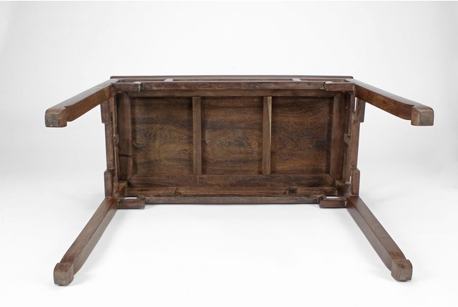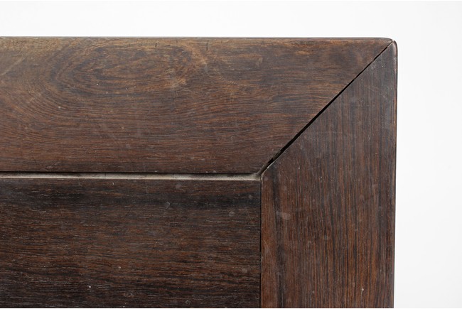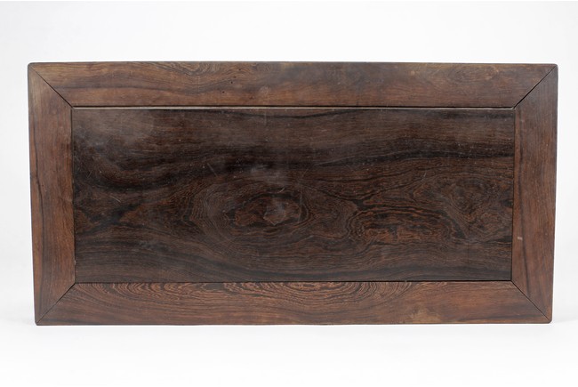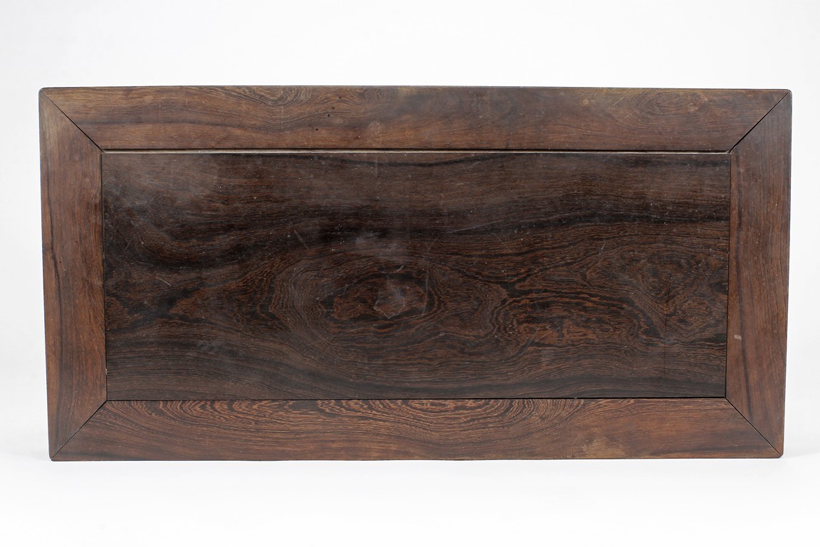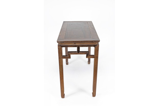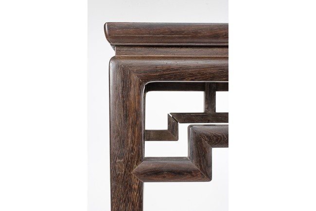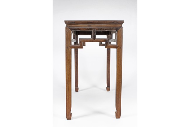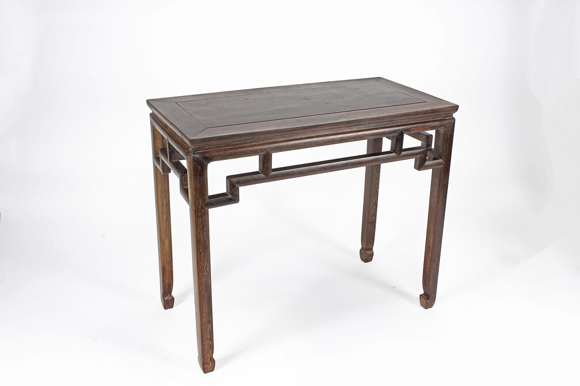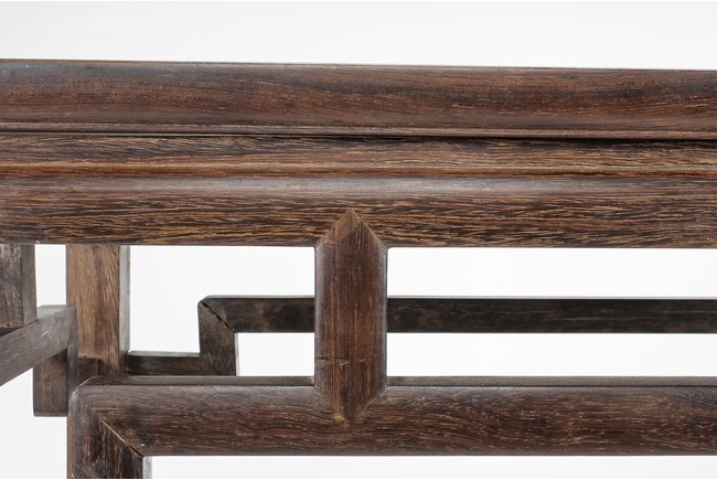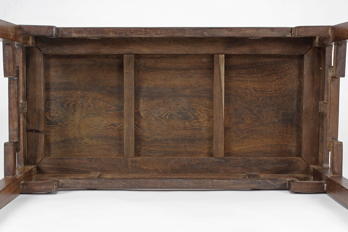 The rectangular top panel is set above a simple lattice pattern apron, the corner legs flush at right angles and are of rectangular section and end in roof feet. Qing Dynasty period.