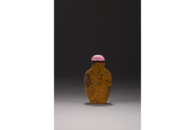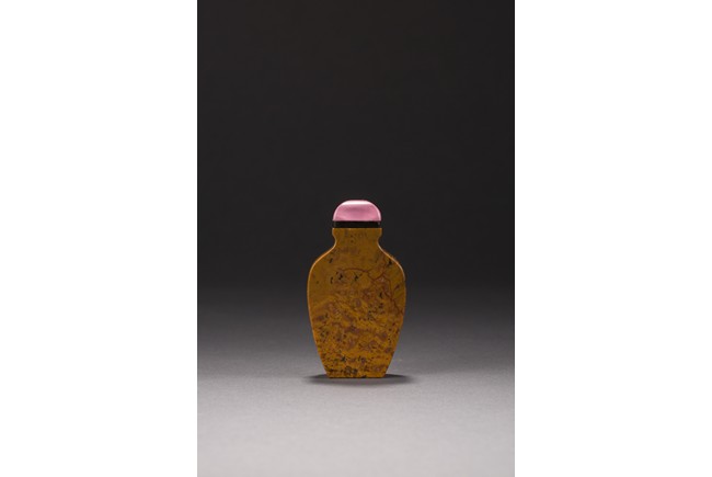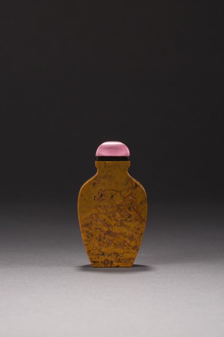 Of high shoulder, the flattened snuff bottle is modelled in the form of vase, the stone is of smooth and opaque ochre yellow tone with red veins. Qing Dynasty period.