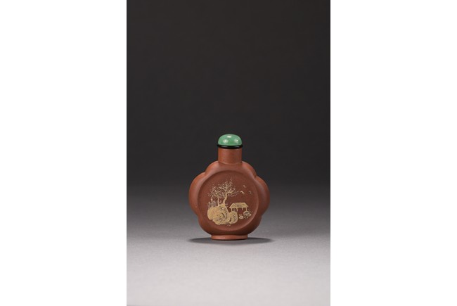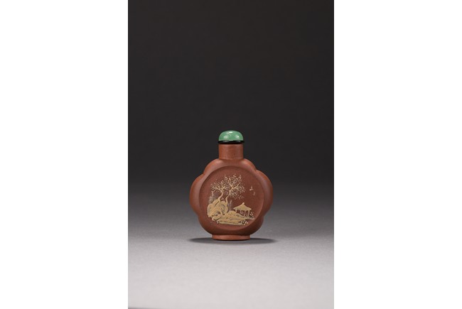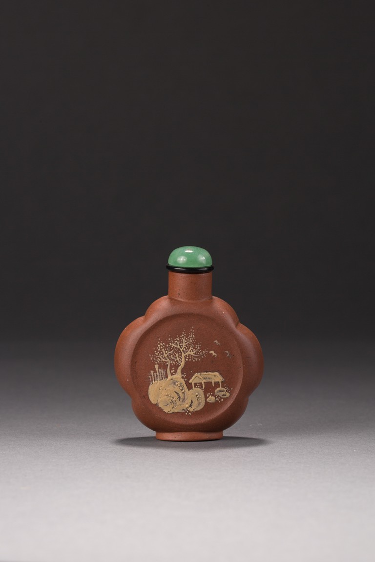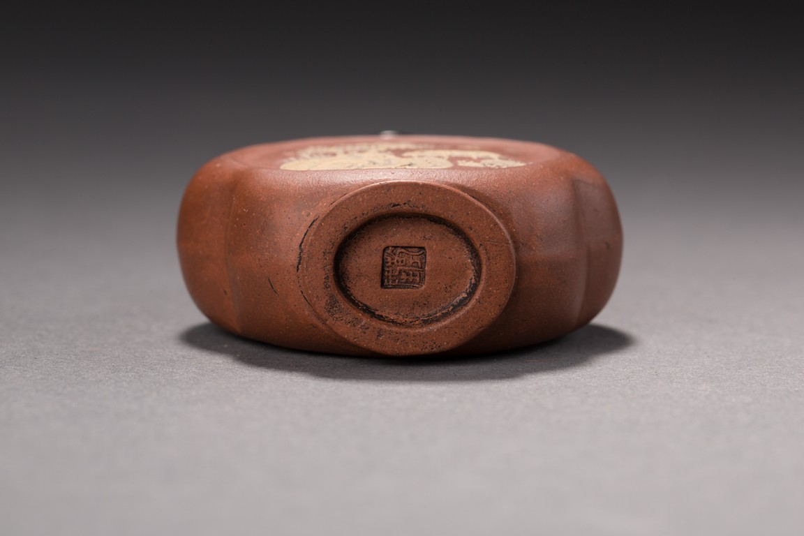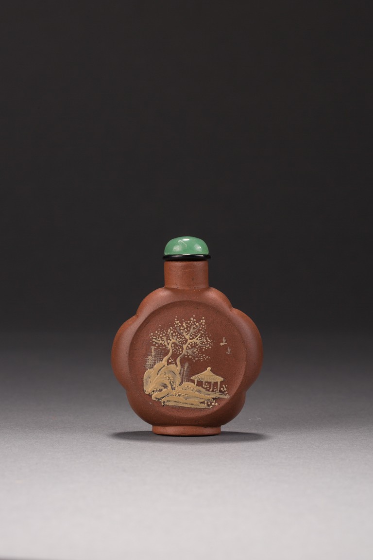 The Yixing flattened snuff bottle decorated with a landscape scene within the circular medallion on the body, the base impressed with a four character QIANLONG mark. Qing Dynasty period.