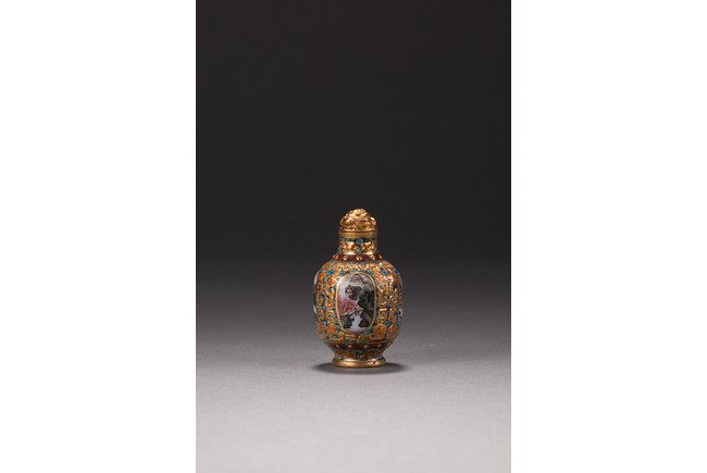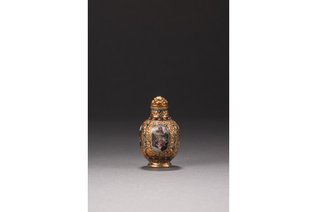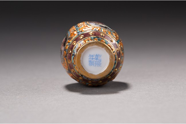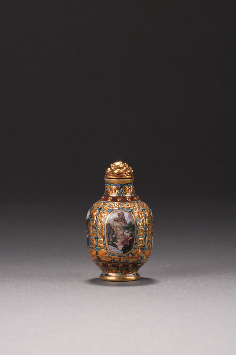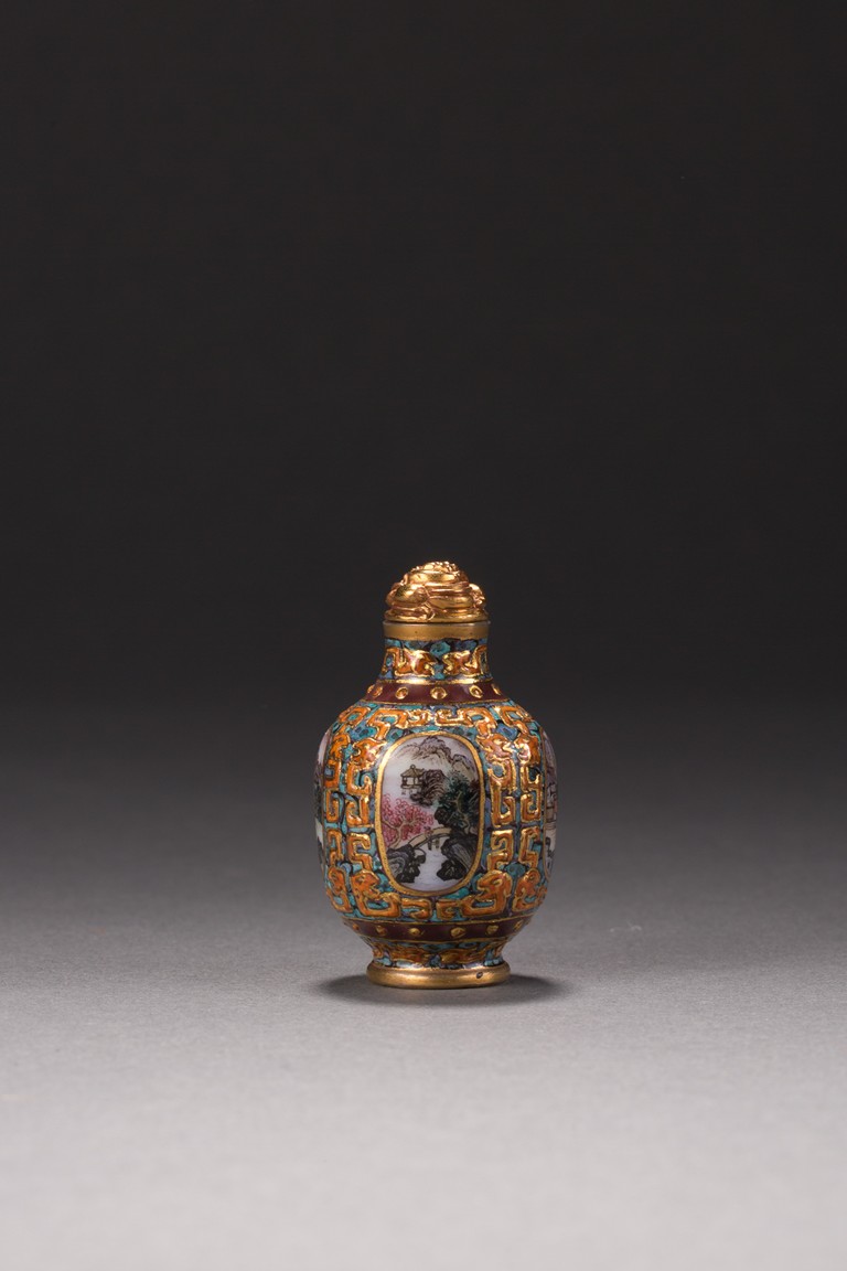 The snuff bottle finely painted with landscape scene enclosed in four oval cartouches separated by gilt-painted archaistic stylized chilong pattern reserved on turquoise tone ground, the base with four character QIANLONG mark.