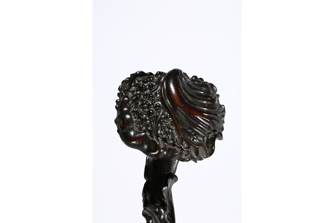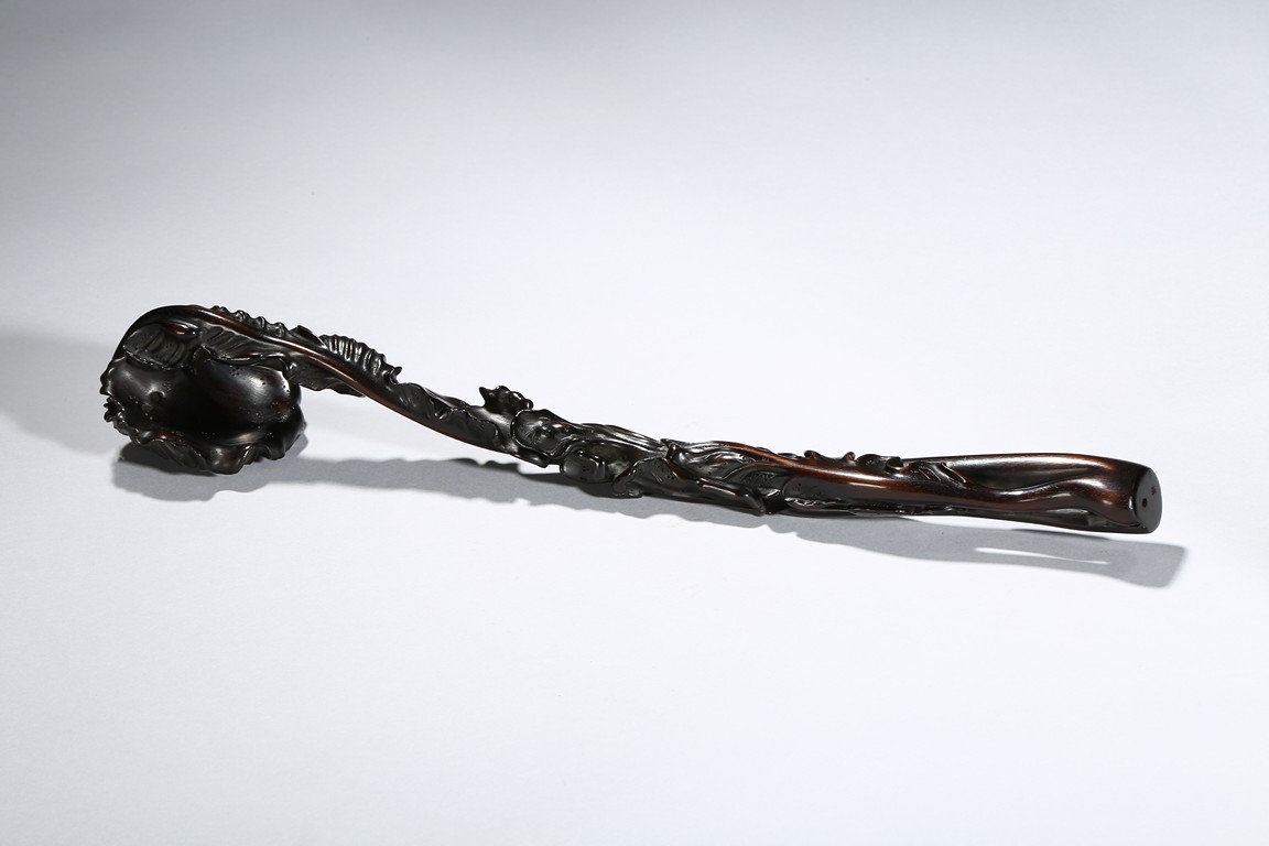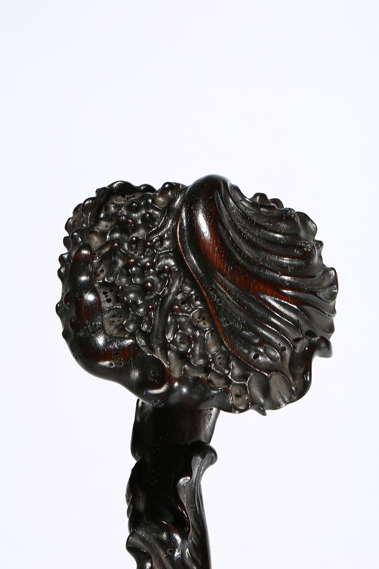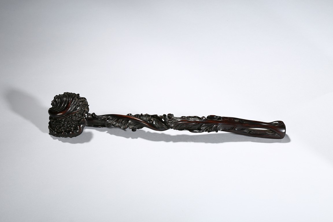 The ruyi scepter is overall carved in the model of large wrapped cabbage. The wood is of dark reddish tone with patina. Qing Dynasty period.