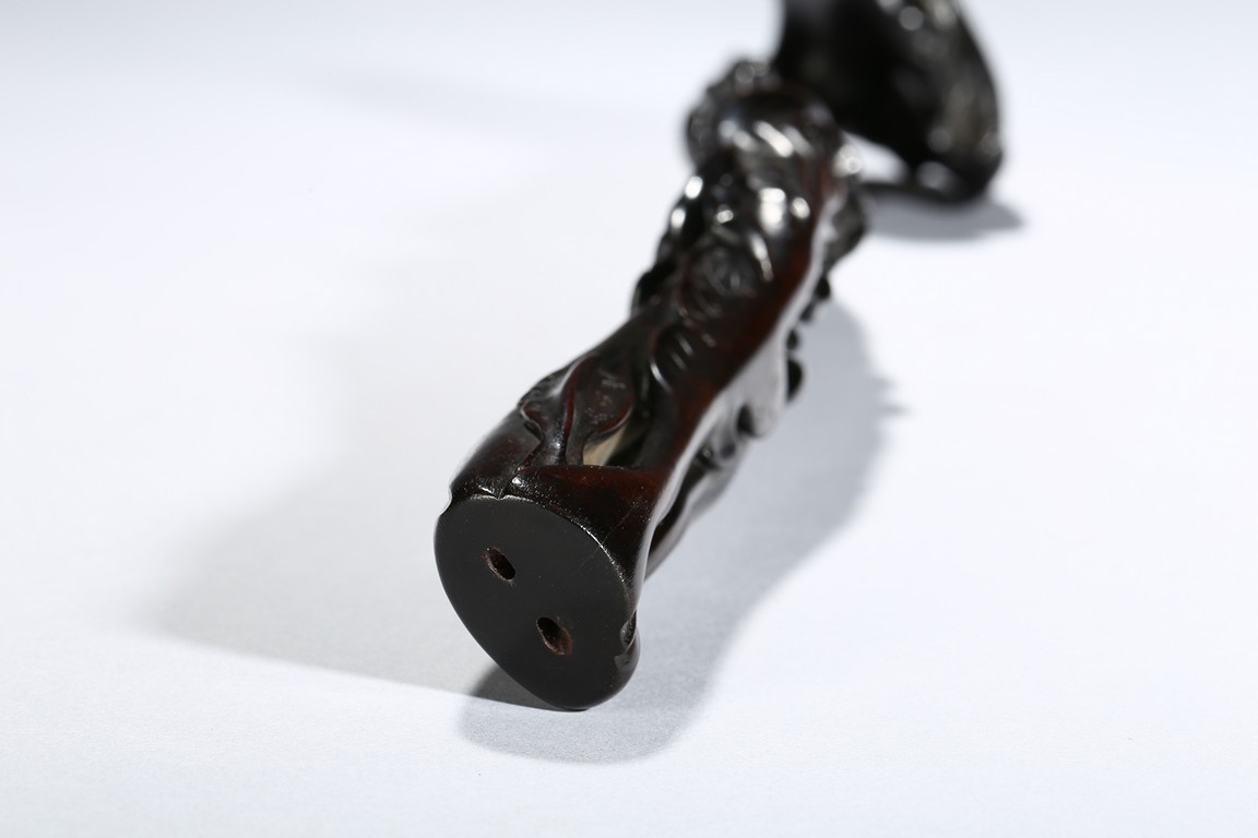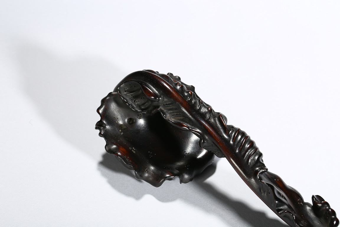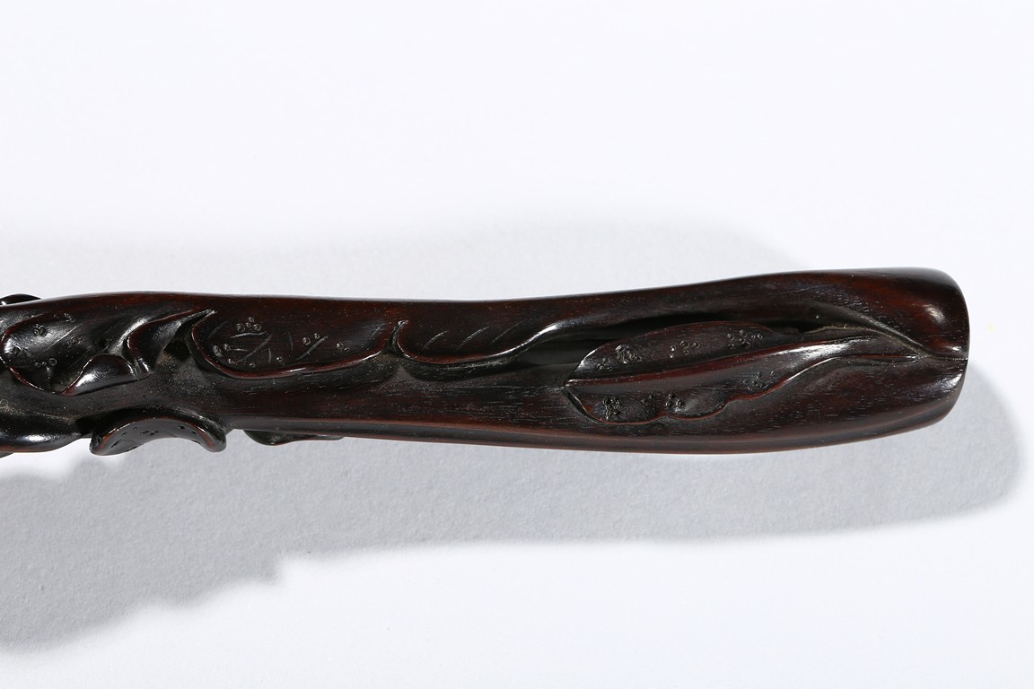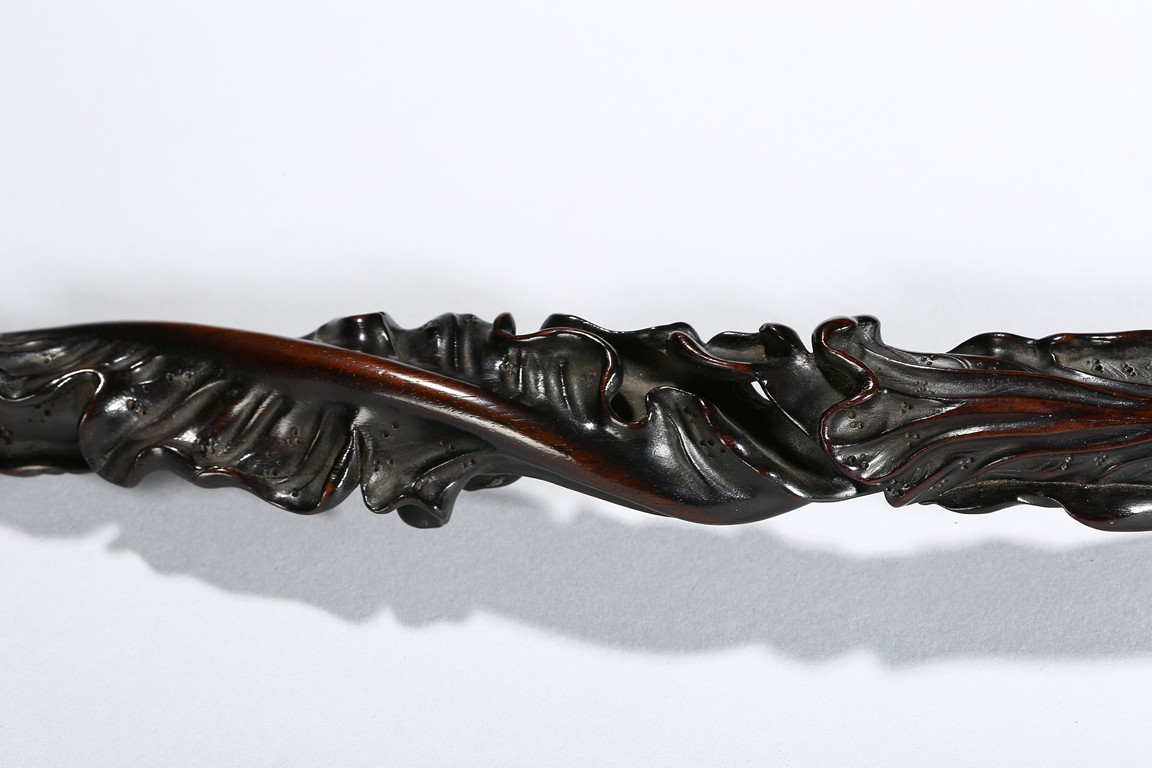 The ruyi scepter is overall carved in the model of large wrapped cabbage. The wood is of dark reddish tone with patina. Qing Dynasty period.