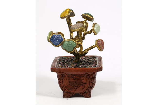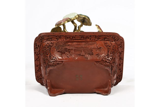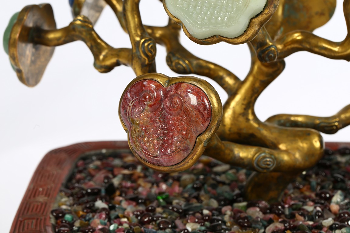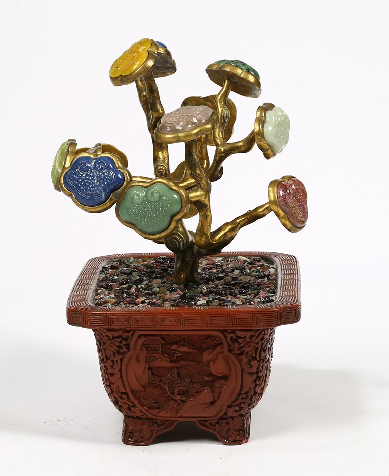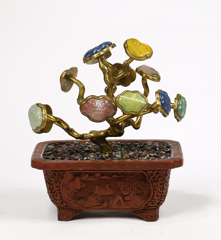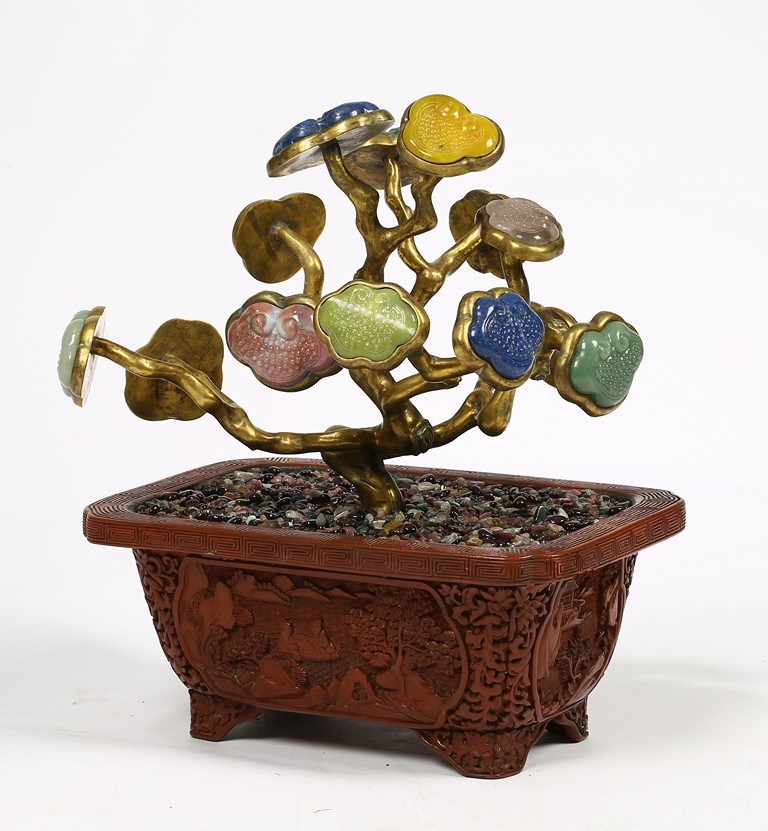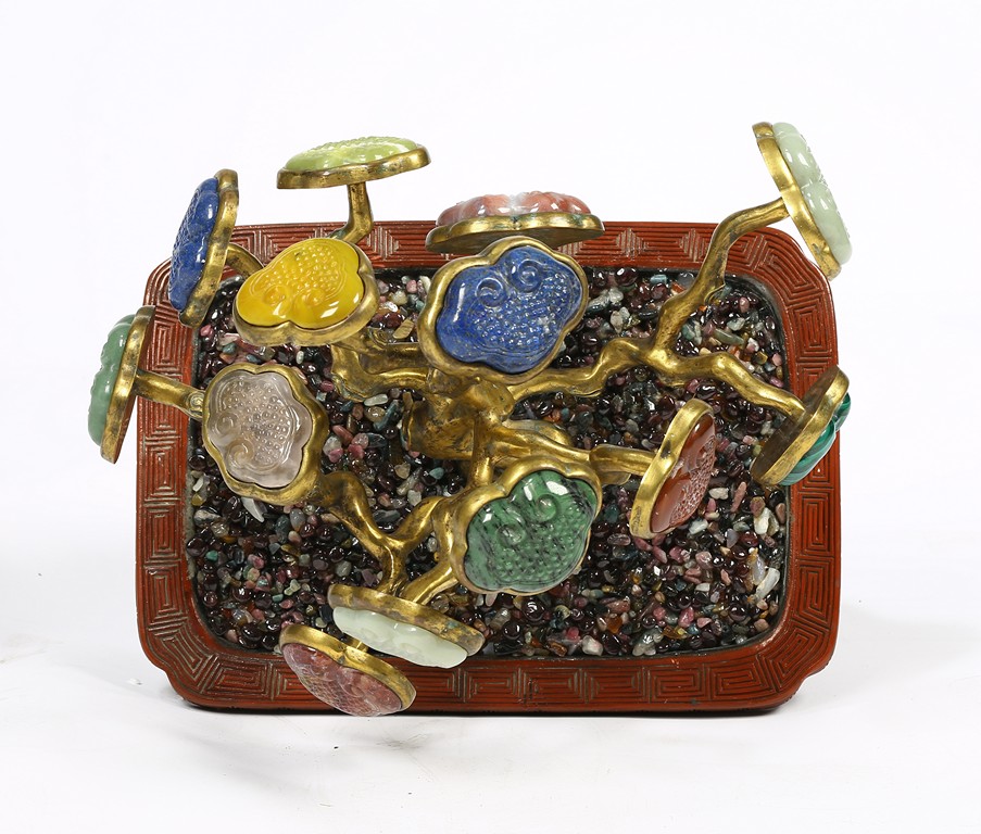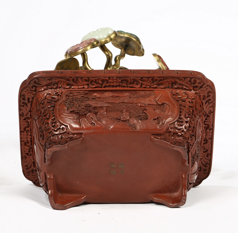 The rectangular jardiniere of cinnabar lacquer carved figures and landscape scene, raised on four foot decorated with scrolled pattern, the jardiniere planted with a gilt stem issuing lingzhi-head shaped buds, including white jade, spinach jade, lapis lazuli, agate, tourmaline, and other semi-precious gems. Qing Dynasty period.