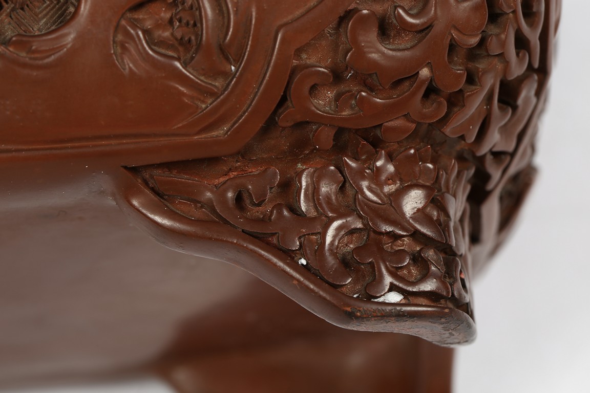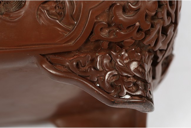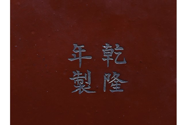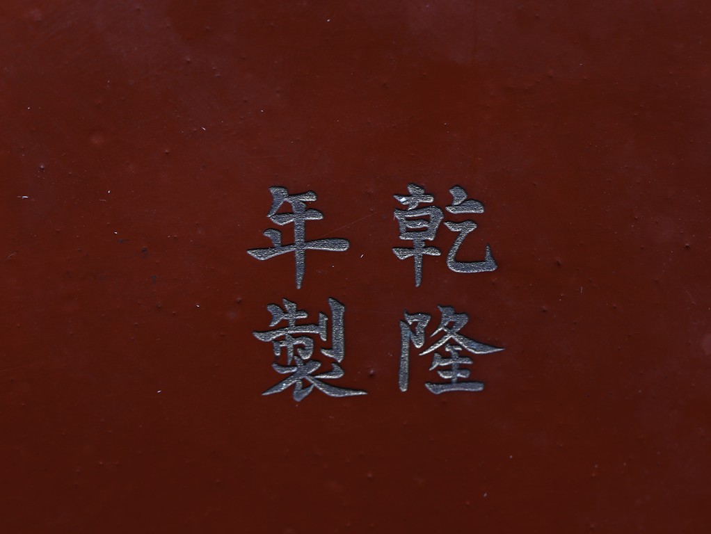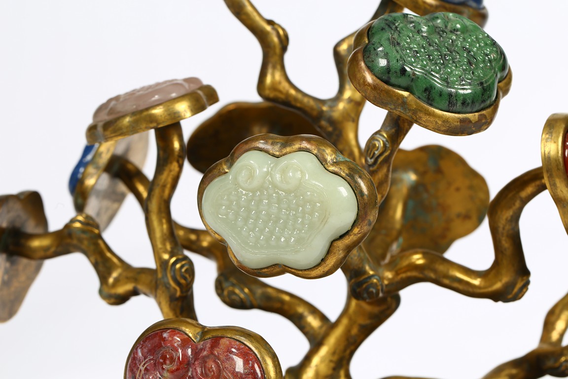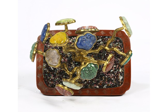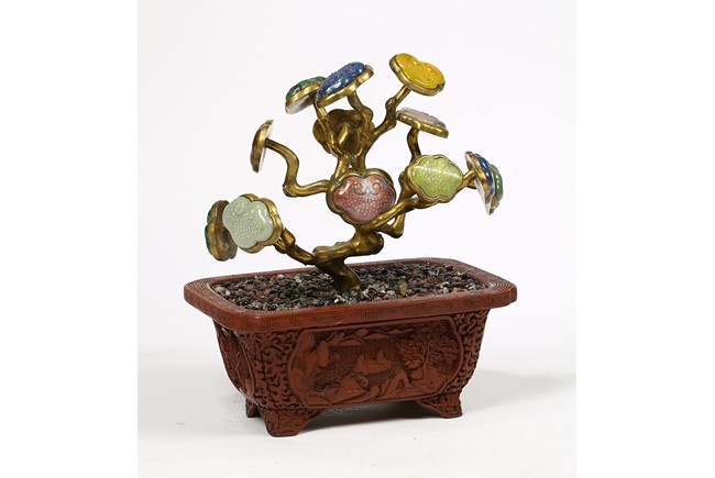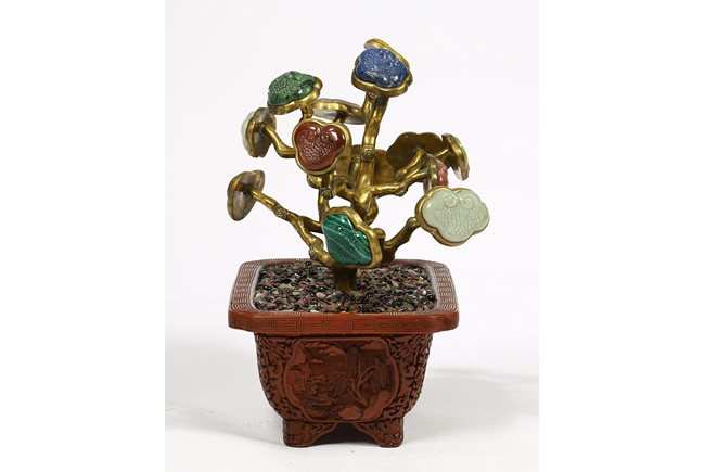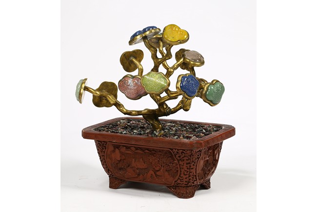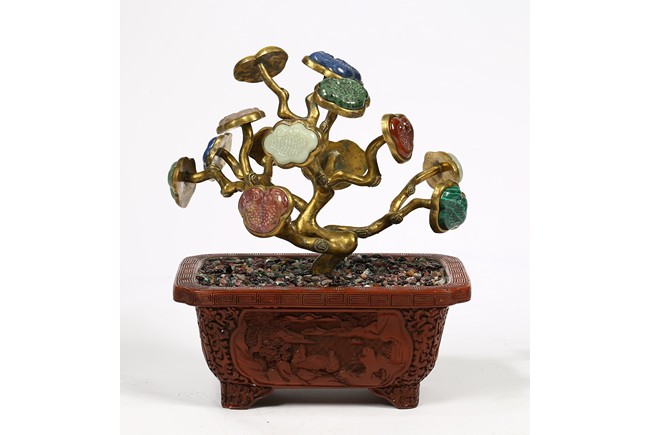 The rectangular jardiniere of cinnabar lacquer carved figures and landscape scene, raised on four foot decorated with scrolled pattern, the jardiniere planted with a gilt stem issuing lingzhi-head shaped buds, including white jade, spinach jade, lapis lazuli, agate, tourmaline, and other semi-precious gems. Qing Dynasty period.