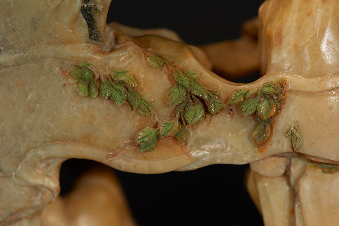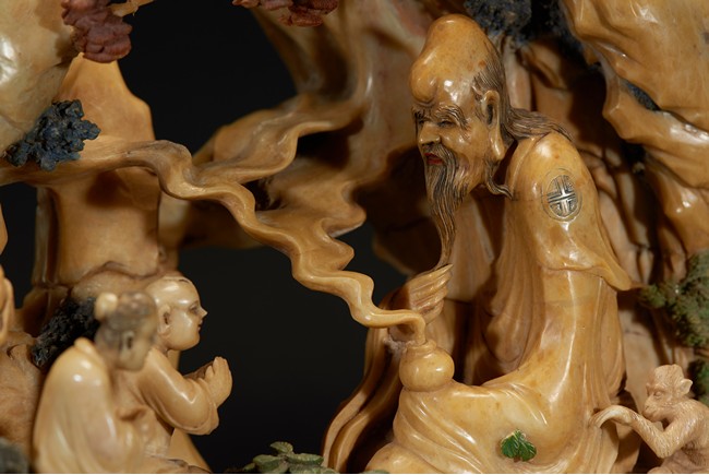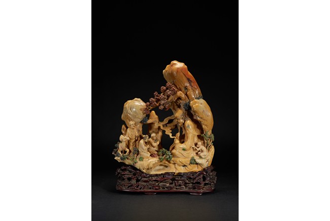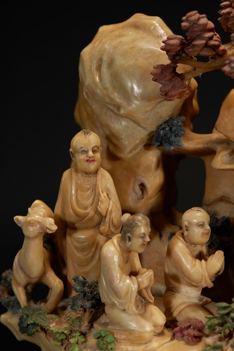 The shoushan stone boulder is skillfully carved depicting a seated elderly Taoist immortal being worshipped by two kneeled figures, a monk standing next with a deer, all set in a deep mountain setting with rugged rockwork, painted pine trees, and flowers, all set on a rosewood stand. Qing Dynasty period.