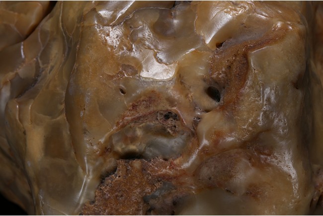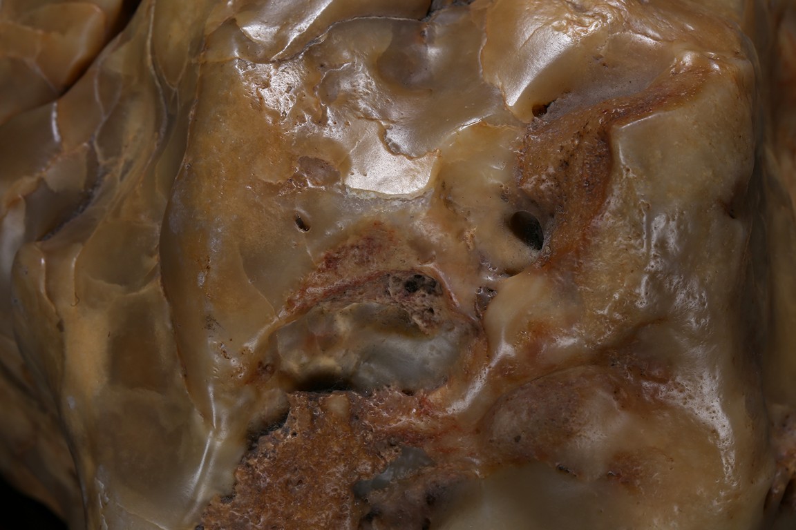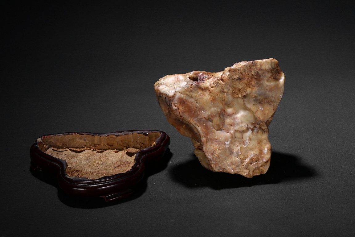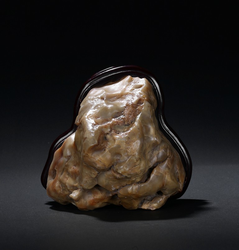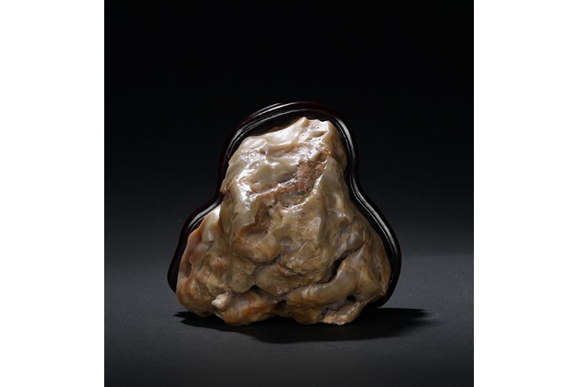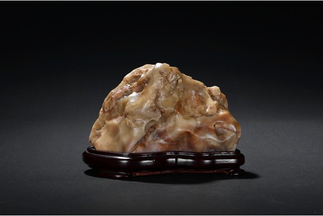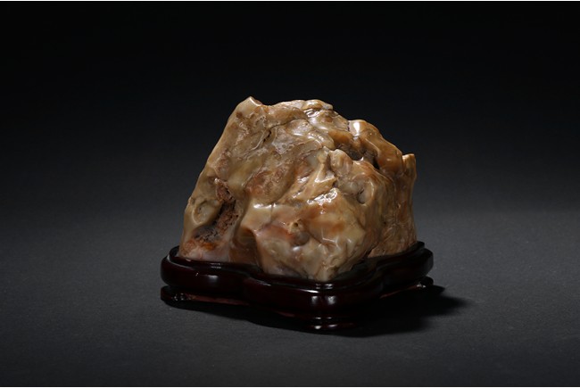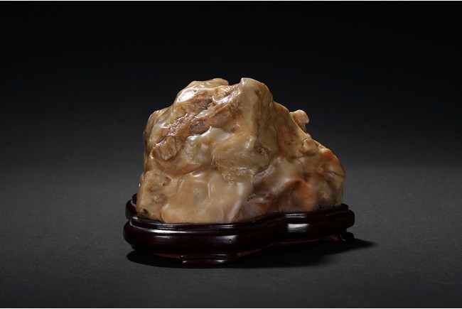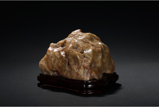 The boulder is of naturalistic form in resemblance to a mountain, the stone is of opaque yellow beige tone, all fitted on a wood stand.