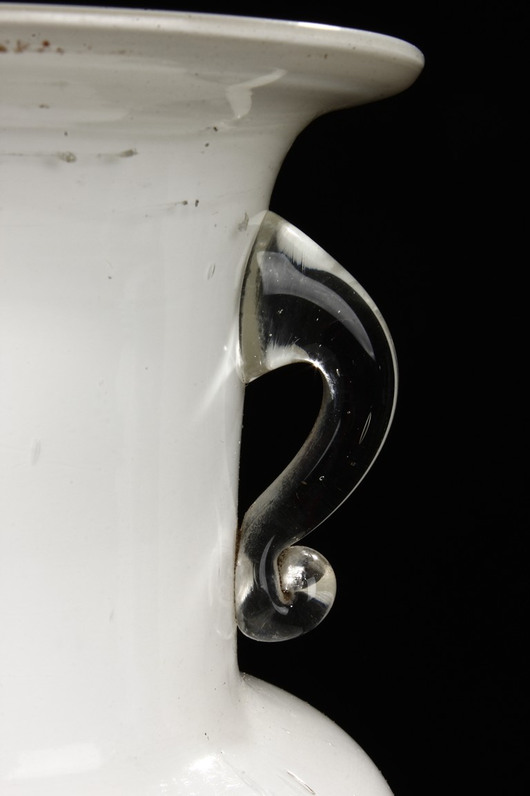Of elegant and slender form, the body made from white glass, supported by clear glass splayed foot, with a pair of clear glass handles on the neck, below the flaring rims. Republic period.