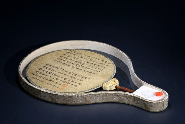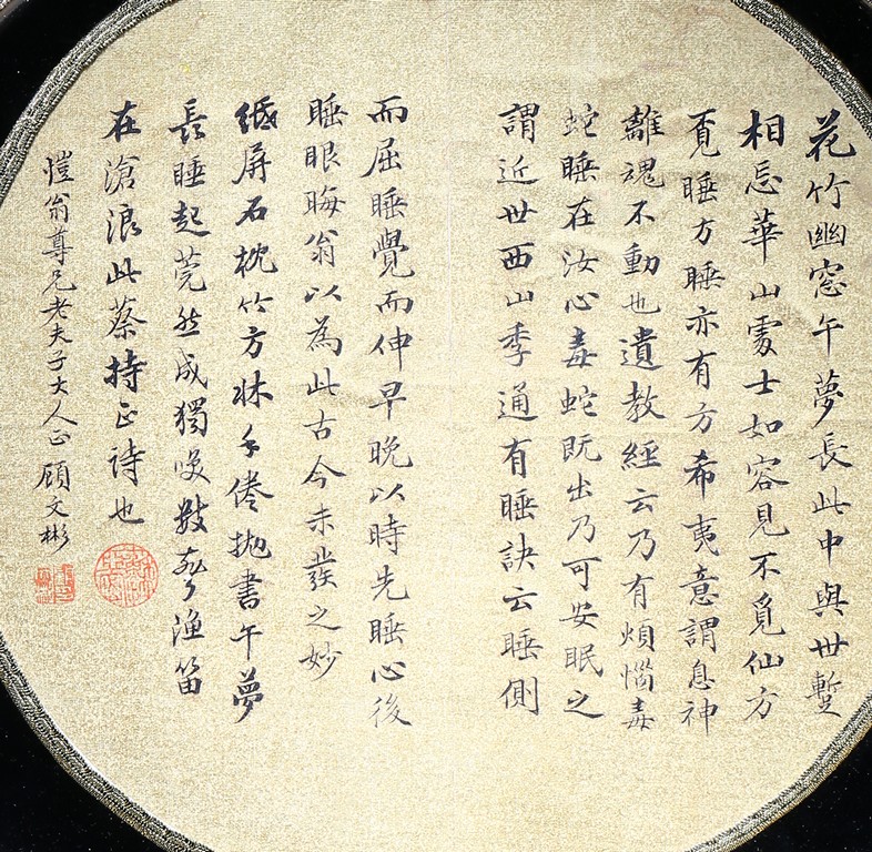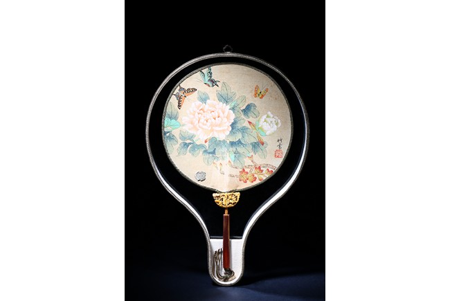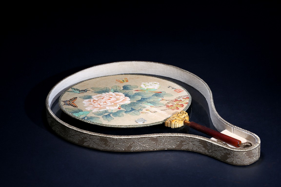 Color and ink on silk, one side with peony flowers and butterflies, the reverse with poem inscriptions, signed with Gu Wenbin and three seals, with fitted transparent cover box.