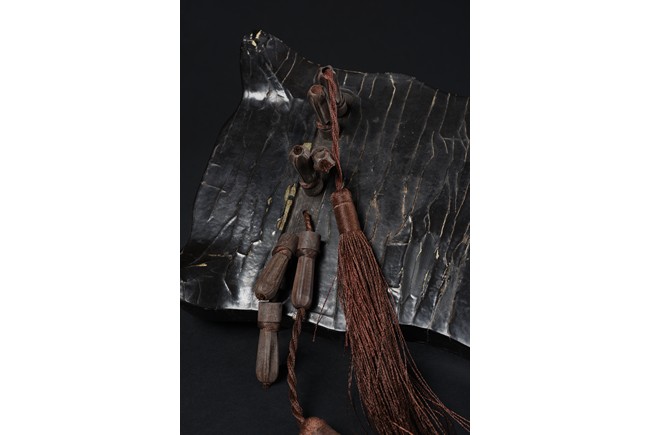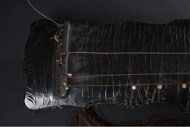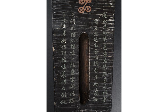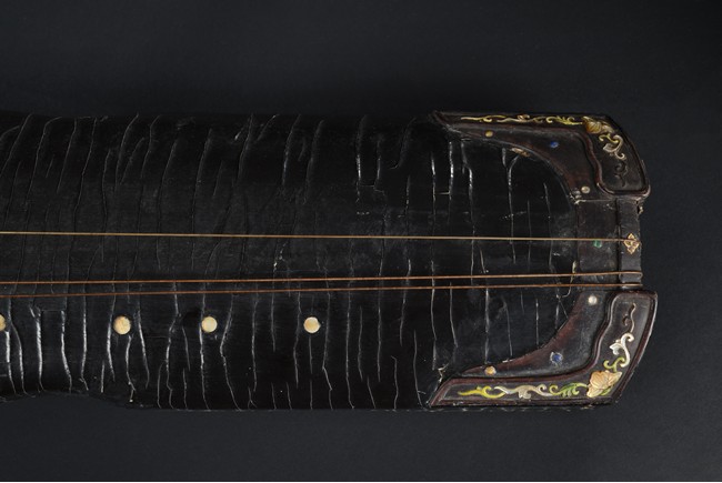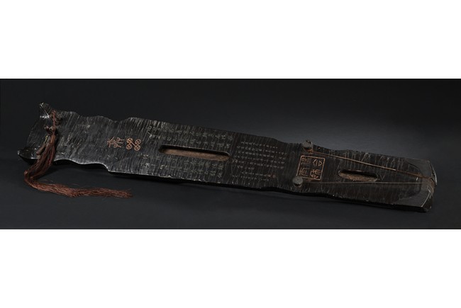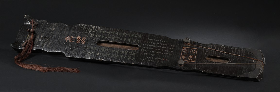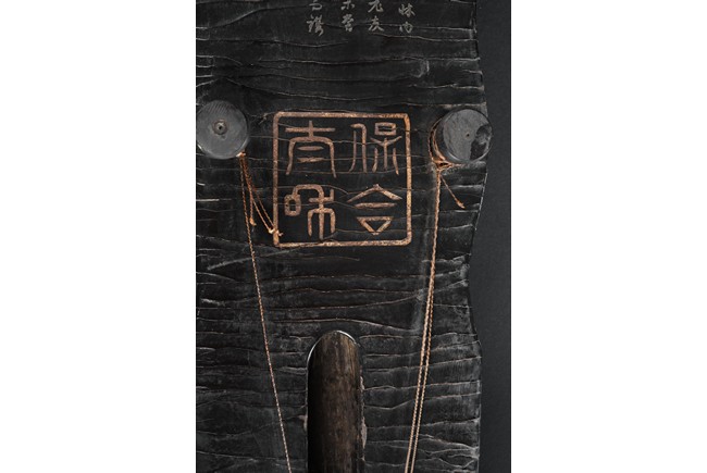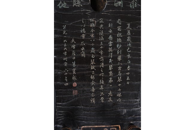 The surface of the long thin section of hollow lacquered wood mounted with three strings, the base incised with a two character inscription in seal script and two long colophons in running script with seal marks, all surfaces exhibiting an even vertical cracquelure. Qing Dynasty period.