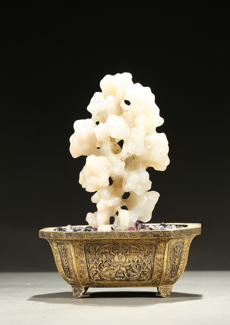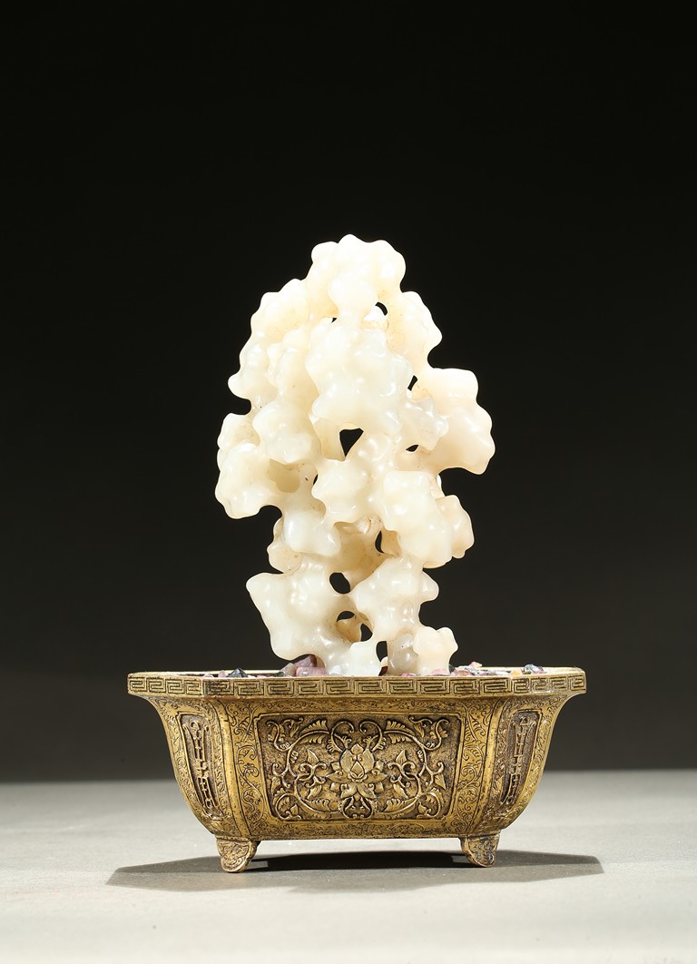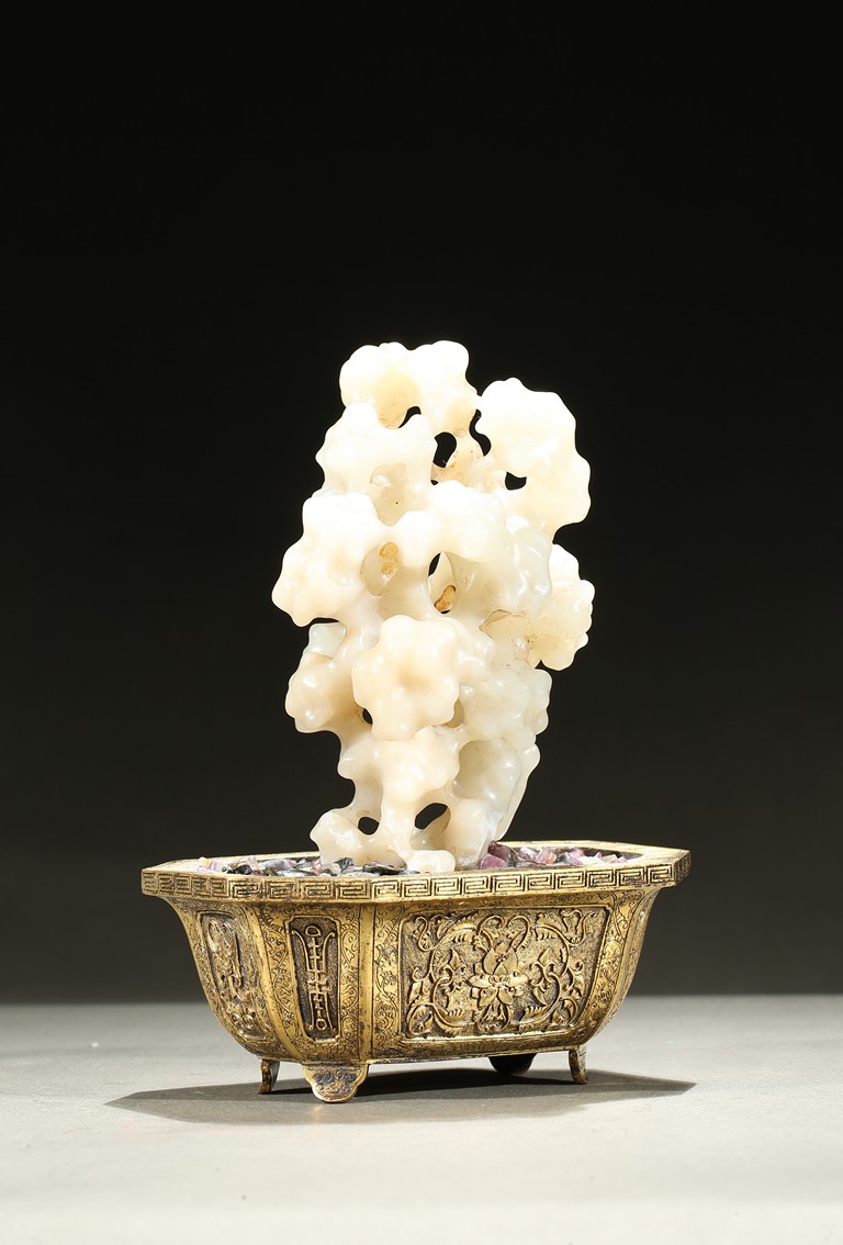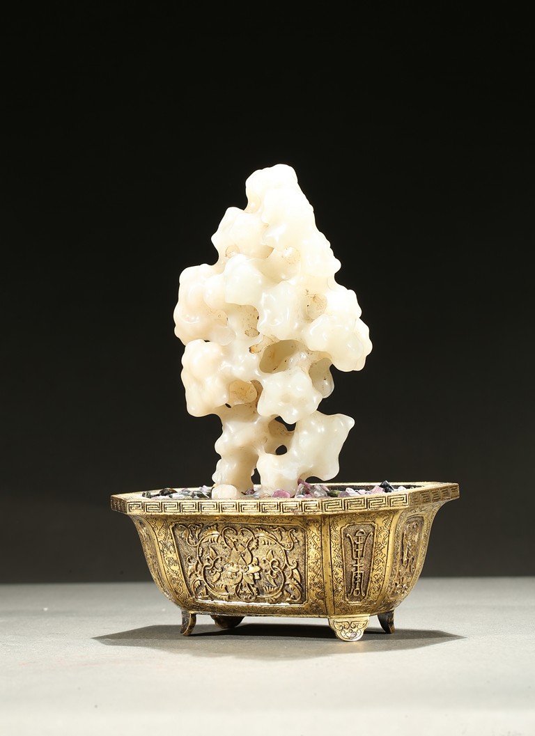 盆景是自然景致的縮影,素有“無聲的詩,立體的畫”之譽。清代宮廷陳設所用盆景大多是以金玉珠寶制作的像生盆景,以襯托宮廷生活環境的堂皇富麗。清宮盆景大部分是由內務府造辦處的鑲嵌作制作的,其點景多用特定題材,通過像征、寓意、諧音來投合統治者的喜好。 此件盆景口沿飾回紋一周,外壁以鏨花作地,配以西洋藤蔓花朵及壽字紋,具有中西合璧的風格,盆內栽仿賞石白玉山子,用料大方,玉質溫潤。整件盆景寓意祥瑞,保存完好,殊為難得,為清代宮廷盆景中的精品。 來源:紐約私人藏家 Provenance: Private collection, New York