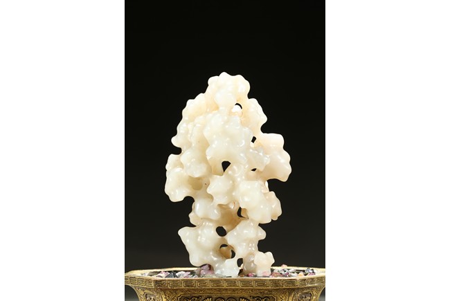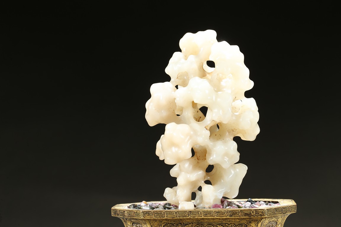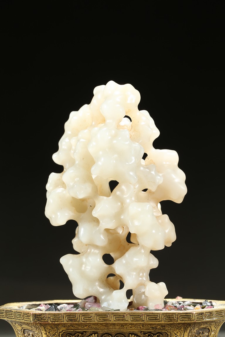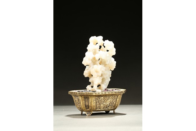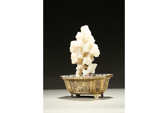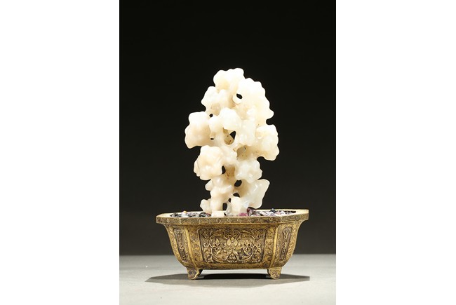 盆景是自然景致的縮影,素有“無聲的詩,立體的畫”之譽。清代宮廷陳設所用盆景大多是以金玉珠寶制作的像生盆景,以襯托宮廷生活環境的堂皇富麗。清宮盆景大部分是由內務府造辦處的鑲嵌作制作的,其點景多用特定題材,通過像征、寓意、諧音來投合統治者的喜好。 此件盆景口沿飾回紋一周,外壁以鏨花作地,配以西洋藤蔓花朵及壽字紋,具有中西合璧的風格,盆內栽仿賞石白玉山子,用料大方,玉質溫潤。整件盆景寓意祥瑞,保存完好,殊為難得,為清代宮廷盆景中的精品。 來源:紐約私人藏家 Provenance: Private collection, New York