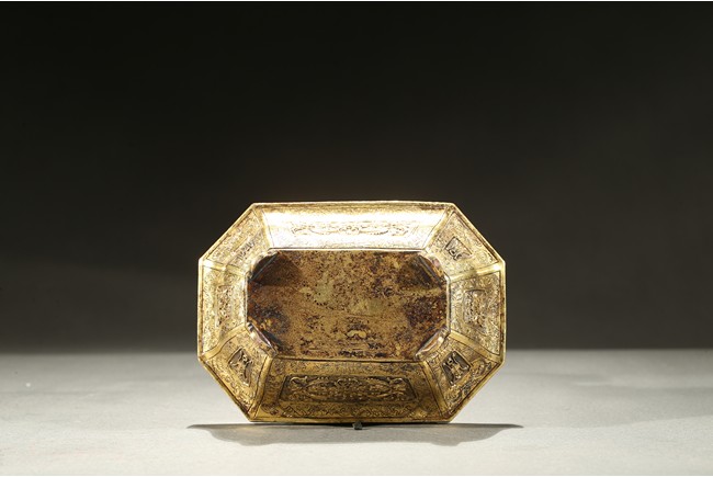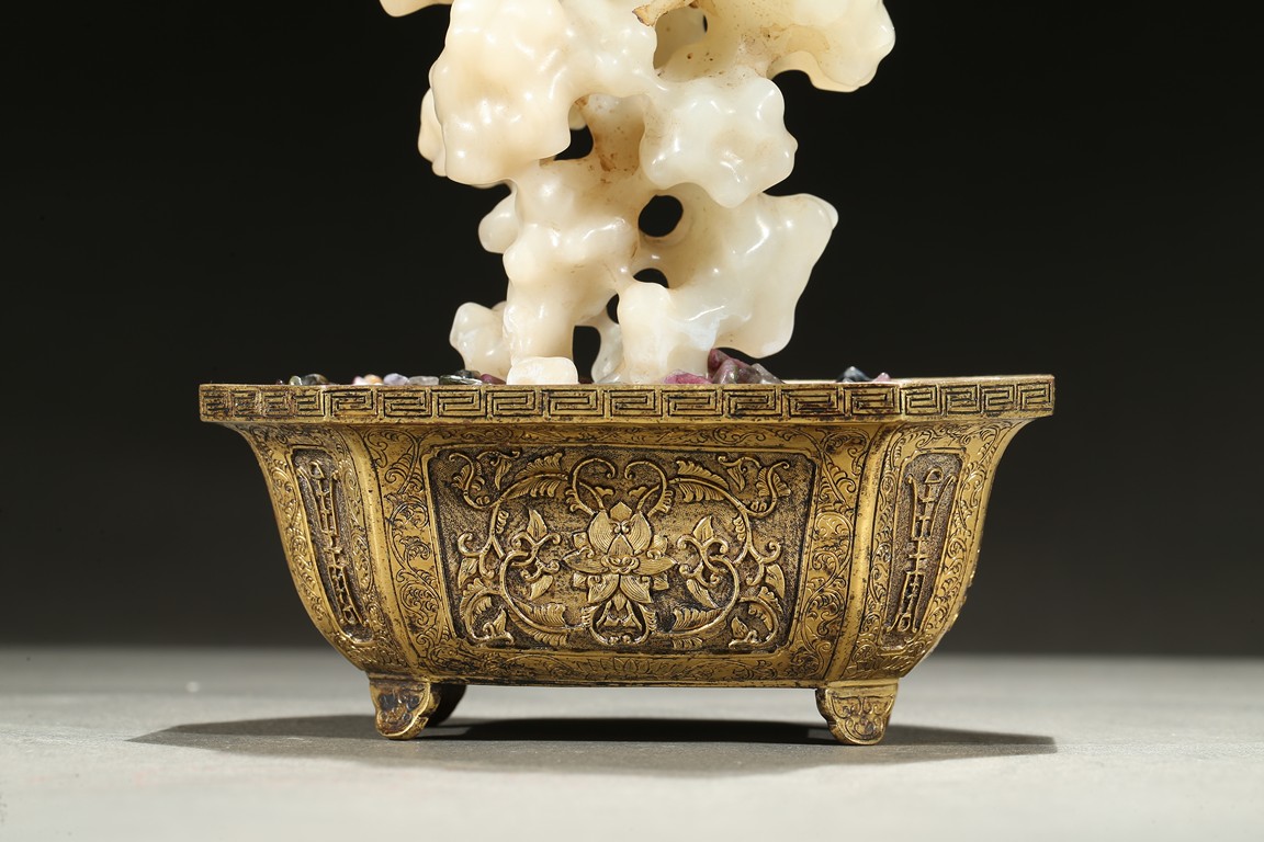 The jardiniere is of rectangular section with canted corners, the front and back side finely cast with rectangular panel enclosing lotus spray, against the gilded ground further incised with foliate scrolls, all supported on four ruyi-shaped feet, the jardiniere 'planted' with an irregular upright scholar's rock. Mid-Qing Dynasty period.