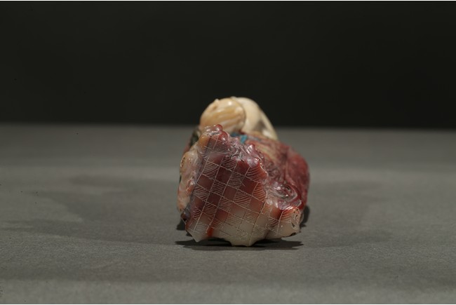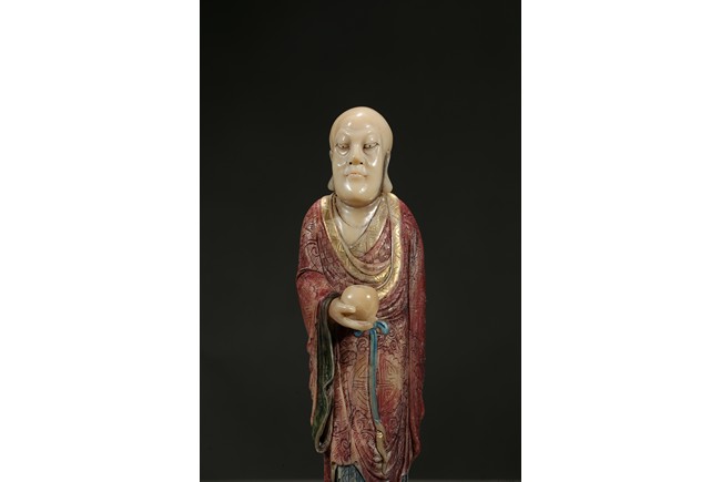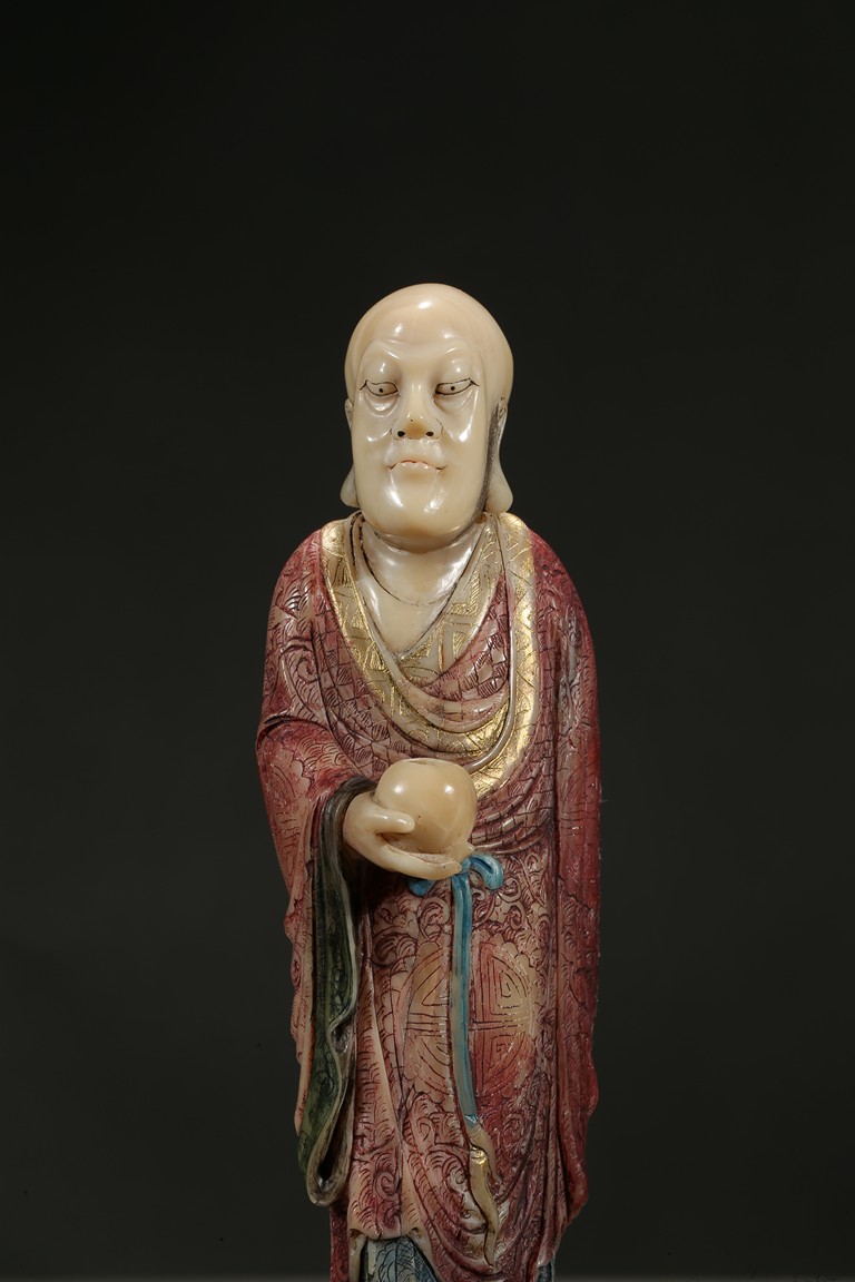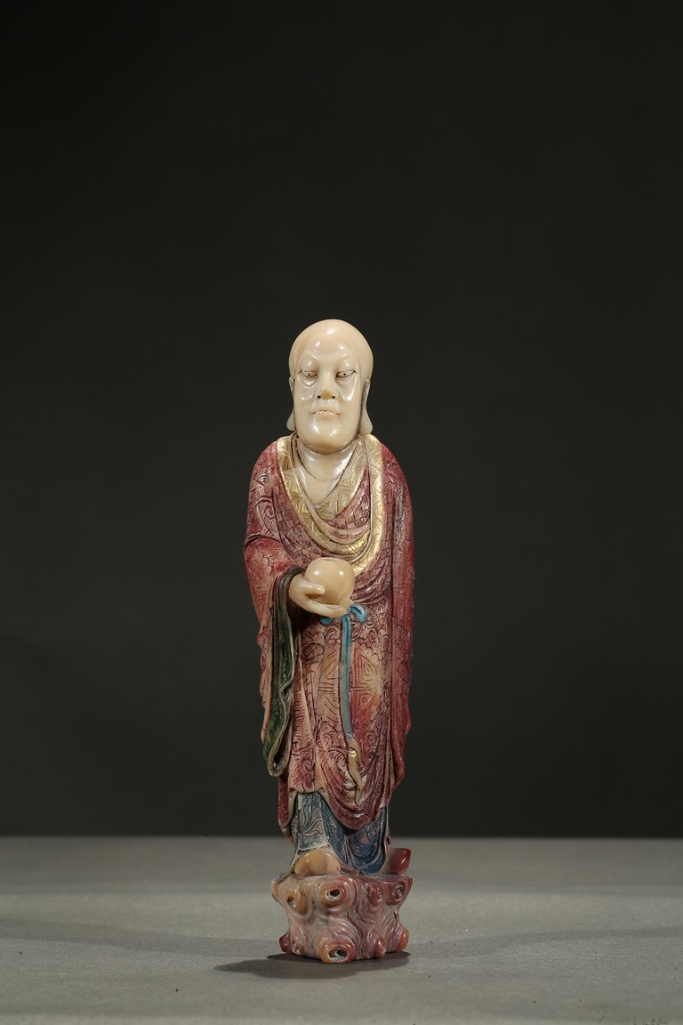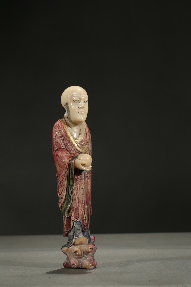 The figure is modelled standing with one hand holding a bowl. He is carved wearing long flowing robes, detailed with incised floral designs. Qing Dynasty period.