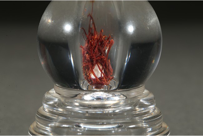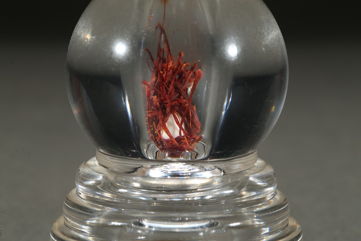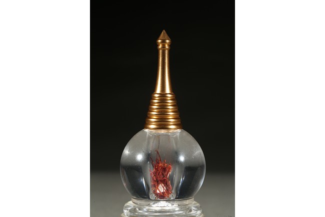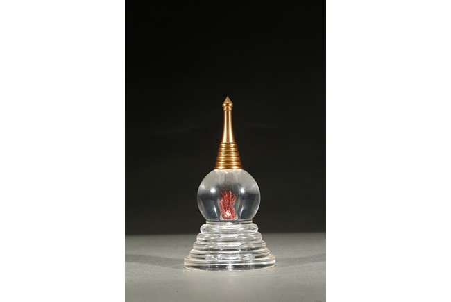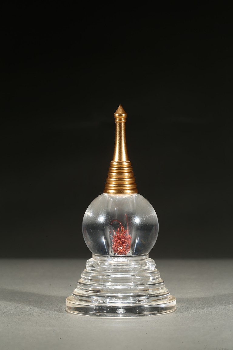 The globular body supported on a stepped five tier base, rising to a tapering gilt-painted 'firing cone' encircled by six ribes, further surmounted by a pointed finial. The stupa containing a sarira and Tibetan saffron.