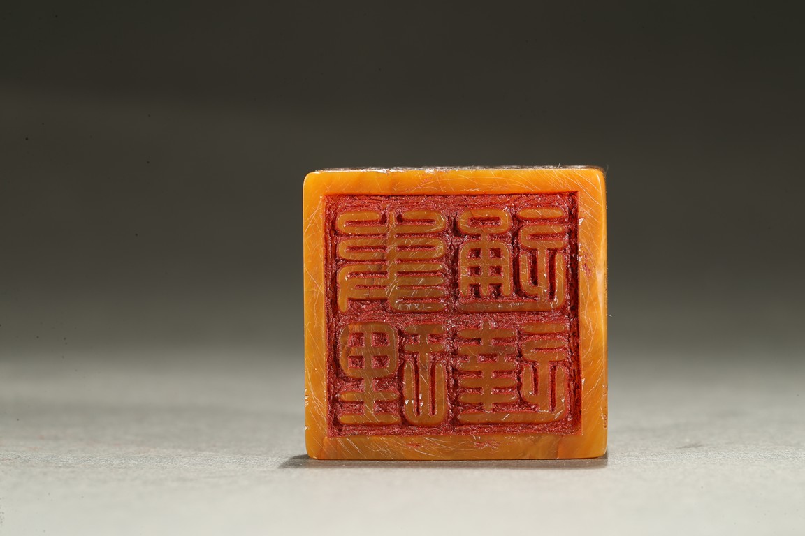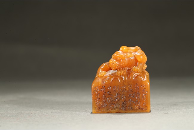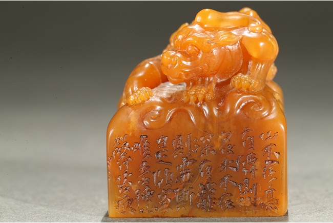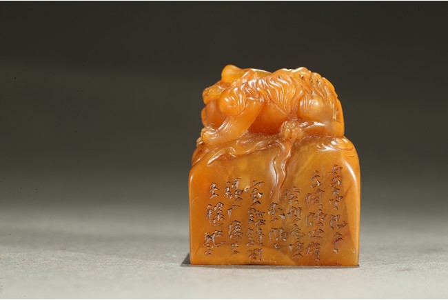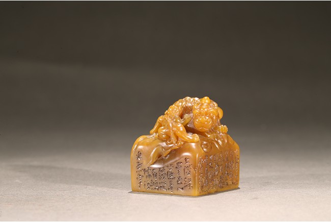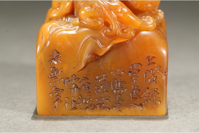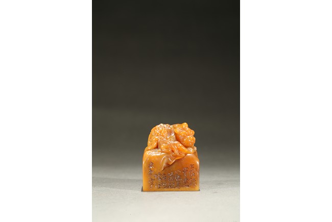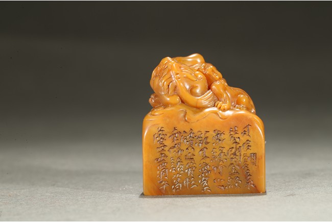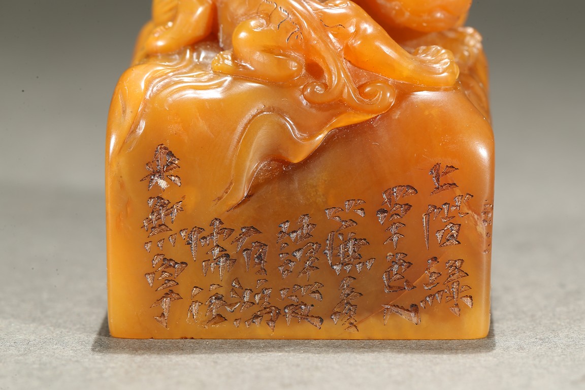 The large seal surmounted with a large recumbent buddhist lion with body curled and its large powerful head turned to the side, the raised spine and tail delicately picked out with scrolling lock, the cub clambering playfully on the larger beast's body, the side inscribed with poetic inscriptions, the seal surface carved with four characters. Qing Dynasty period.