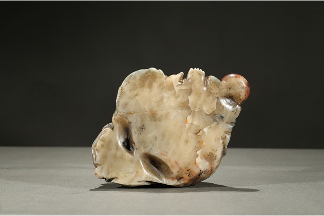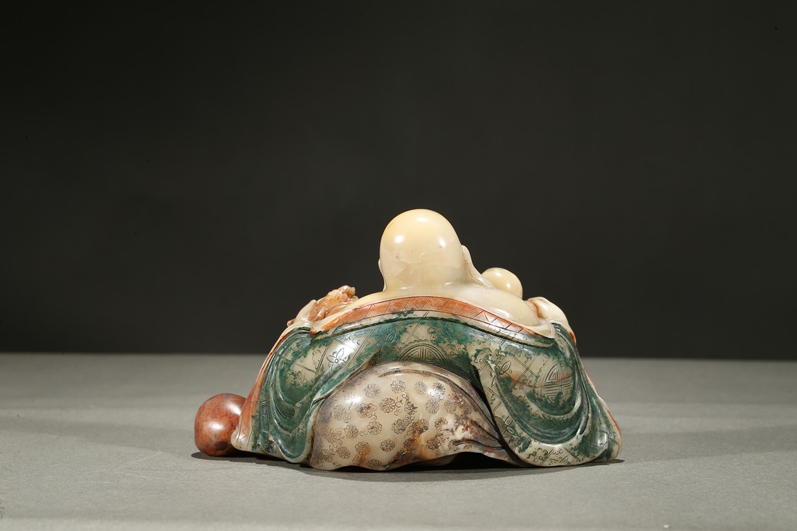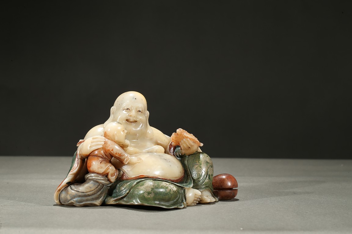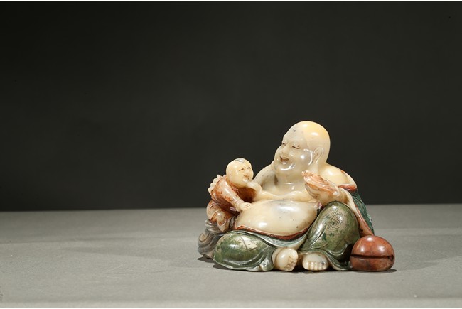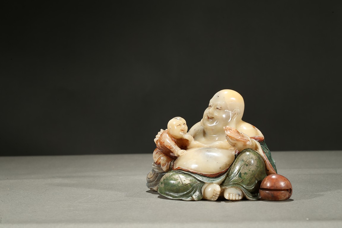 The luohan is shown seated holding a young boy on his right hand, wearing large painted and incised robe exposing his belly, face with joyful expression.
