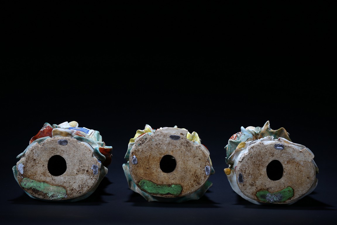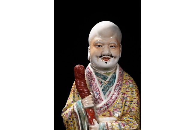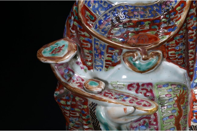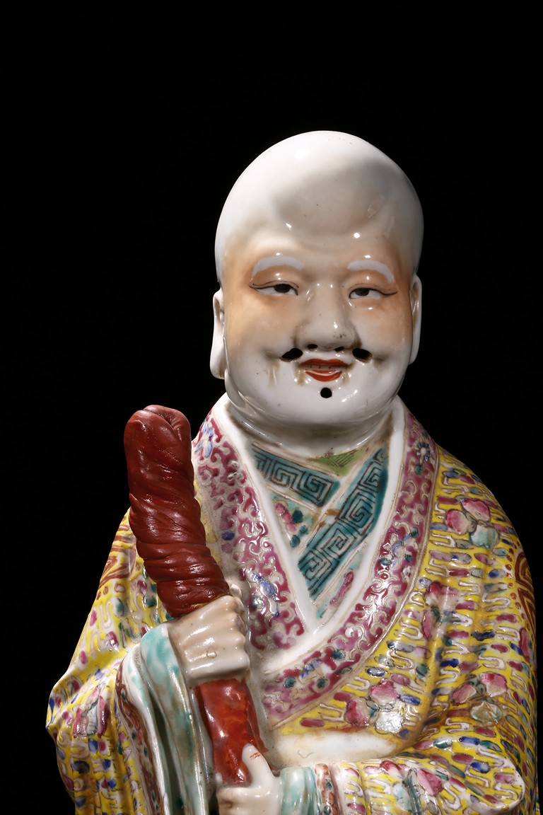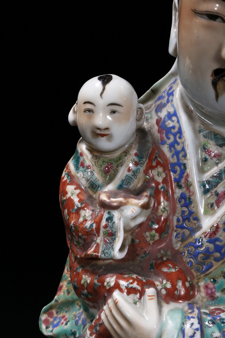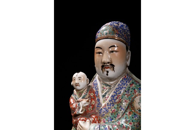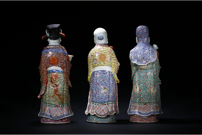Depicting Shou (longevity) as a bald and white-bearded old man with the staff, Fu (wealth) lifting a baby who grasps a gold ingot and Lu (official status) holding a scepter in his left hand and grasping his official's belt with his right hand (Lu's bonnet lacking crossbar). Late Qing Dynasty period.