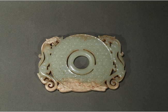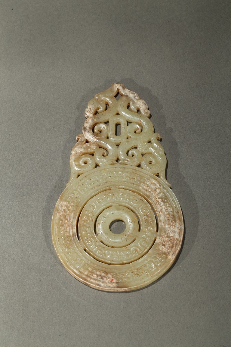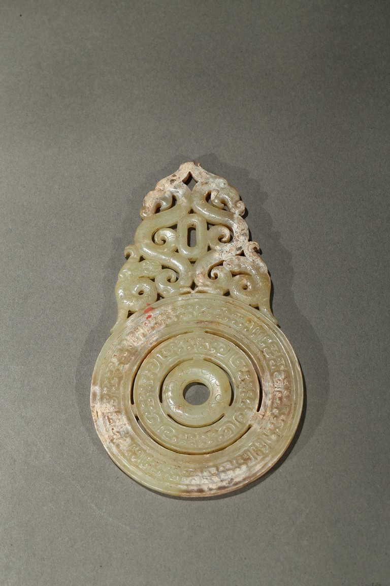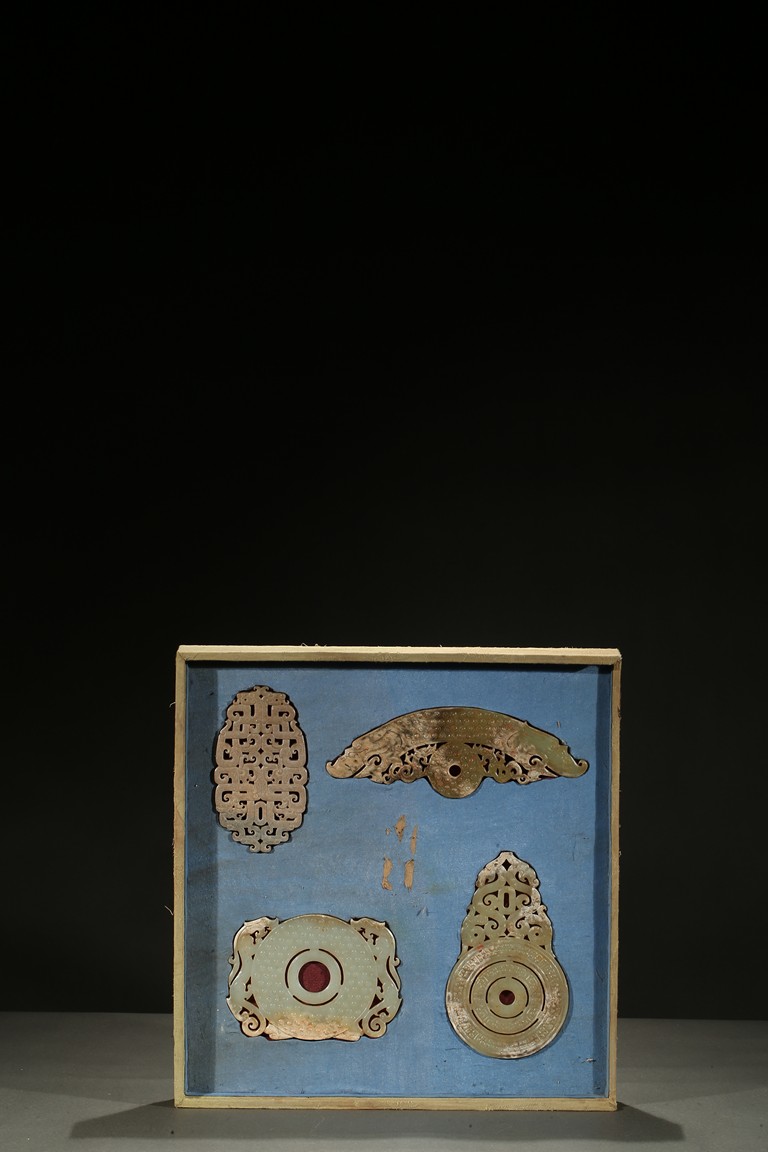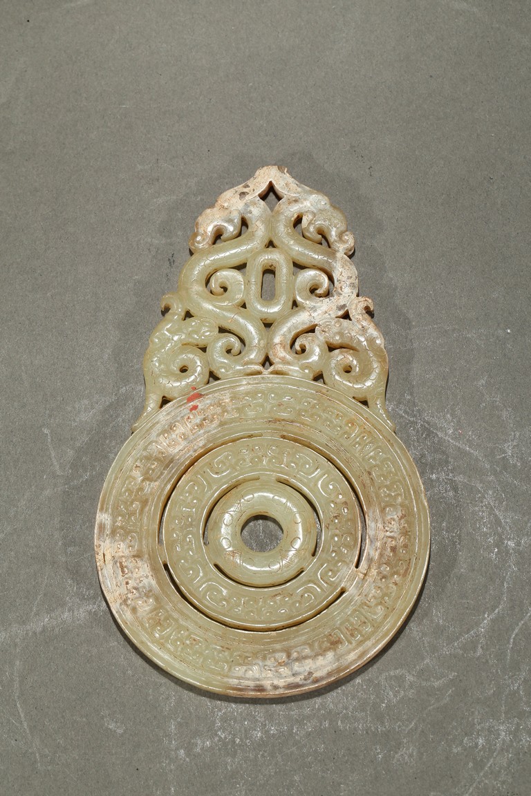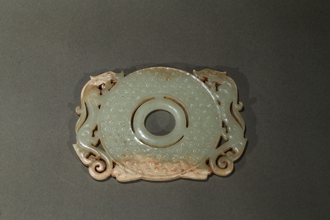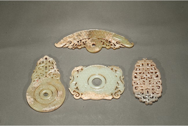 Consisting of four jade ornaments, including two jade discs, an openwork reticulated jade pendant, and a two-sided mythical beast head jade pendant. Han Dynasty period.