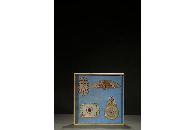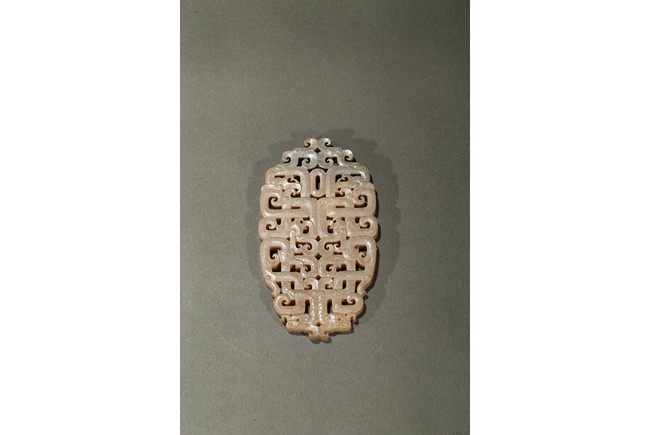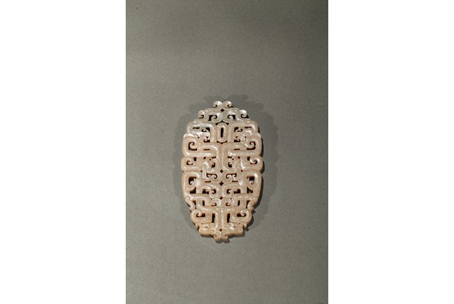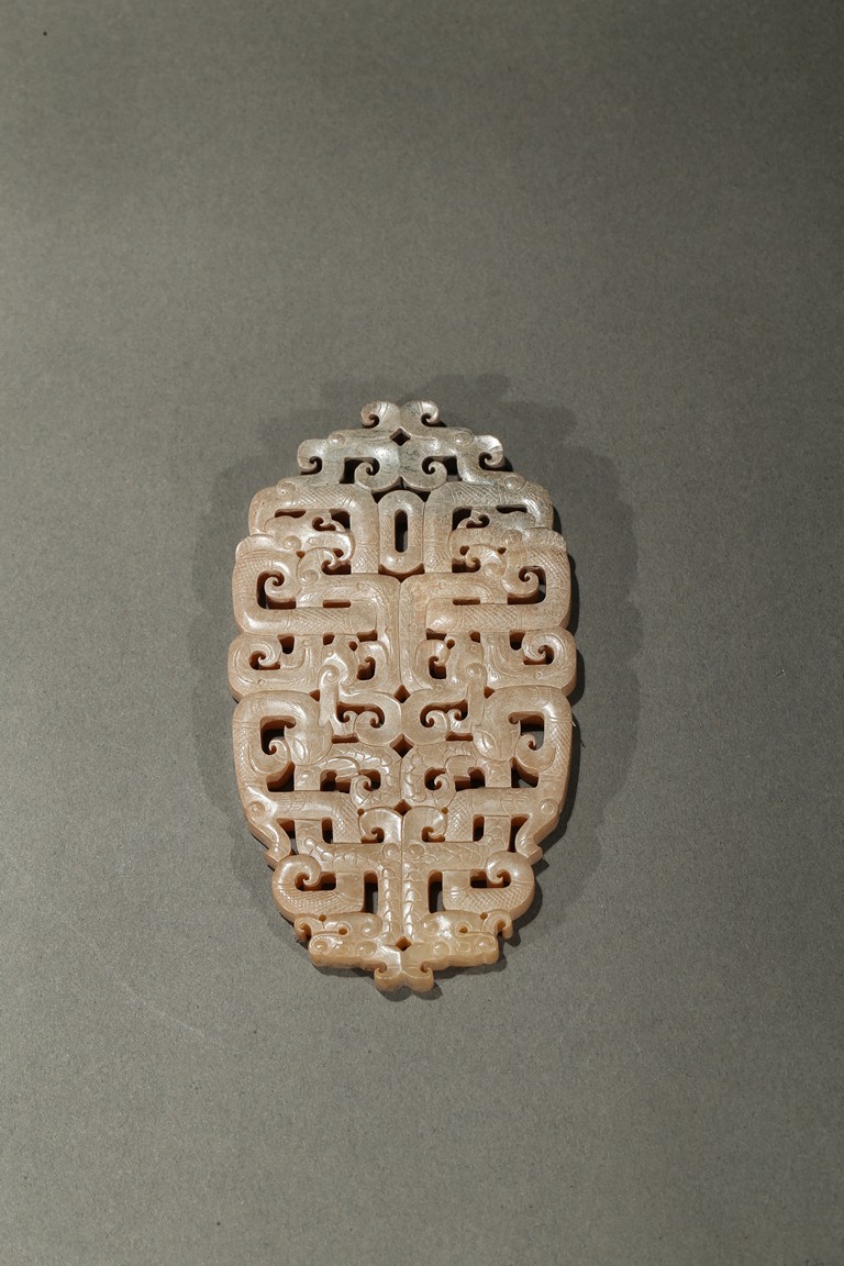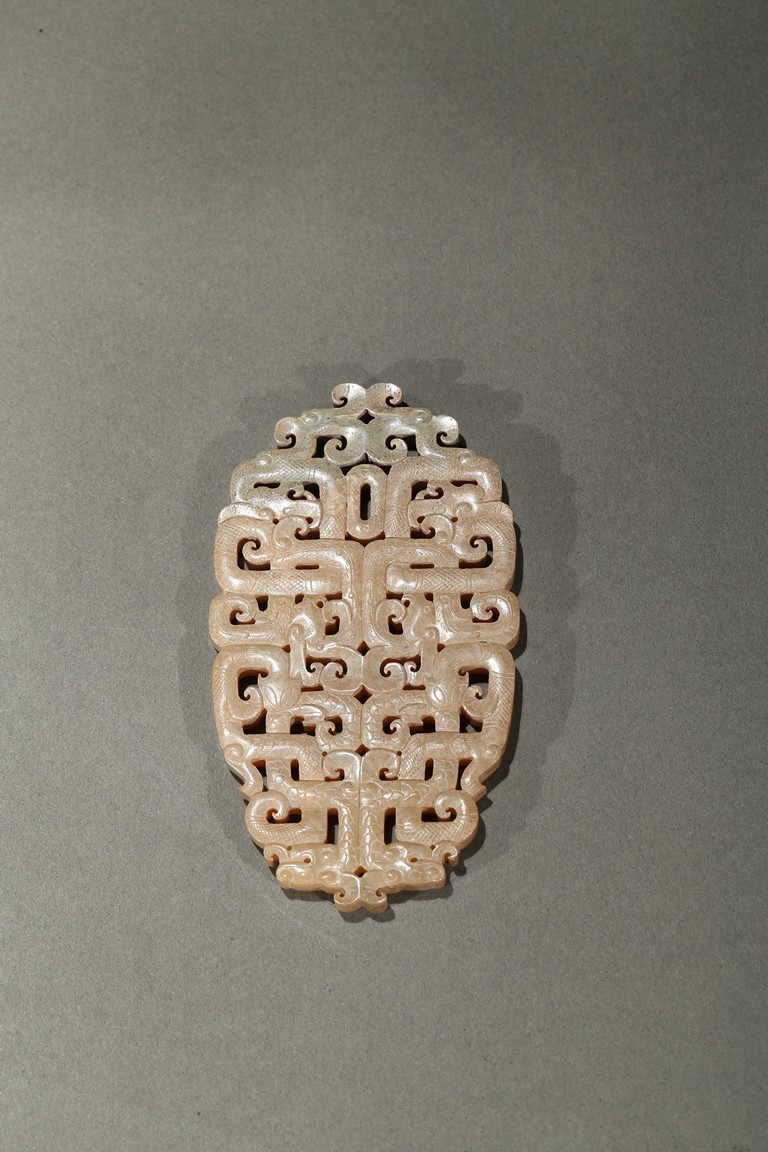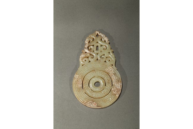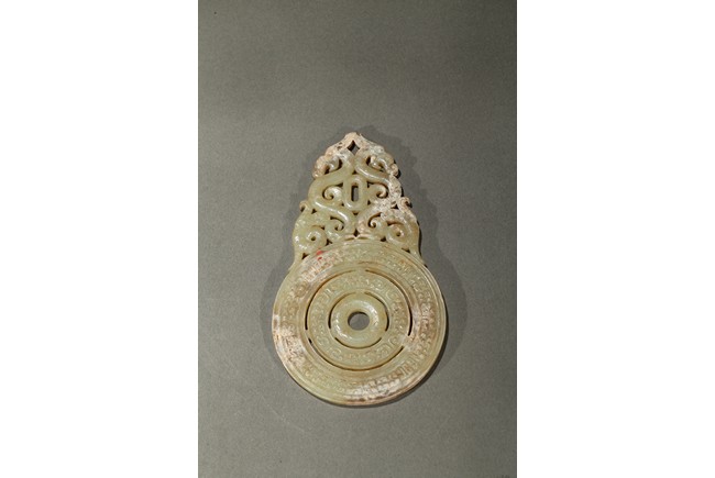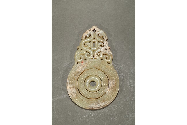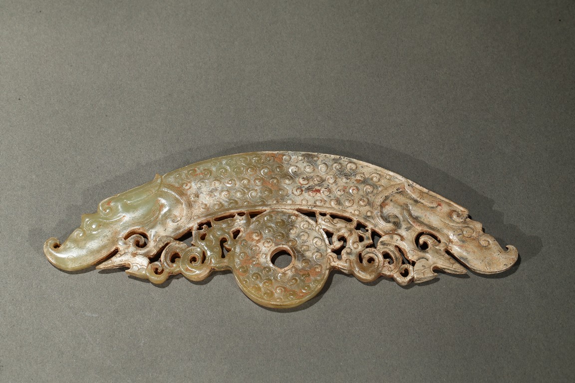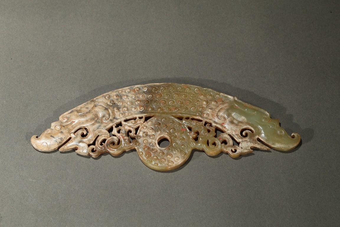 Consisting of four jade ornaments, including two jade discs, an openwork reticulated jade pendant, and a two-sided mythical beast head jade pendant. Han Dynasty period.