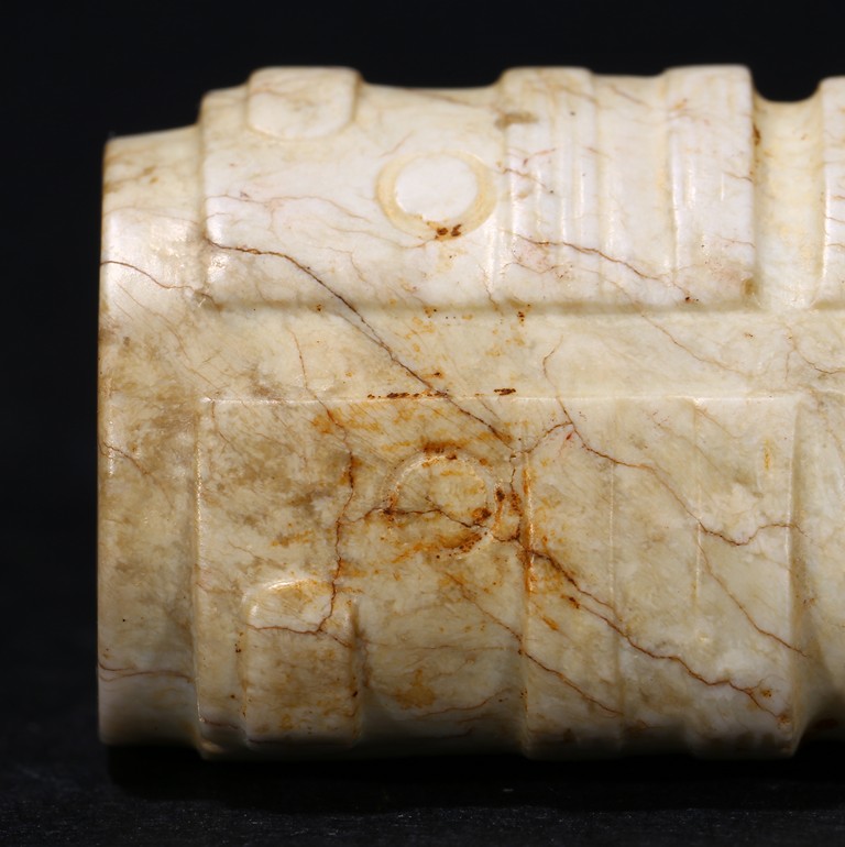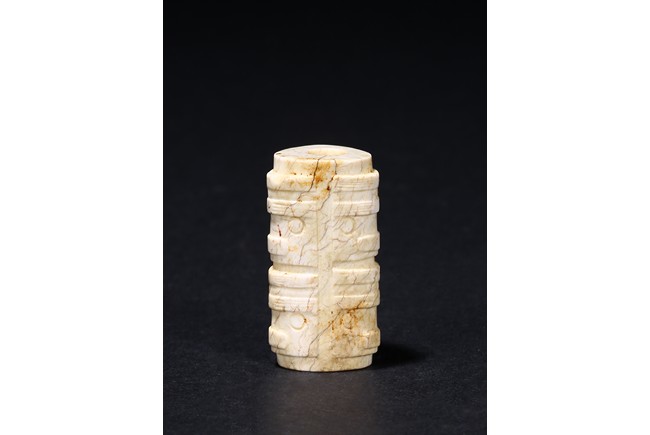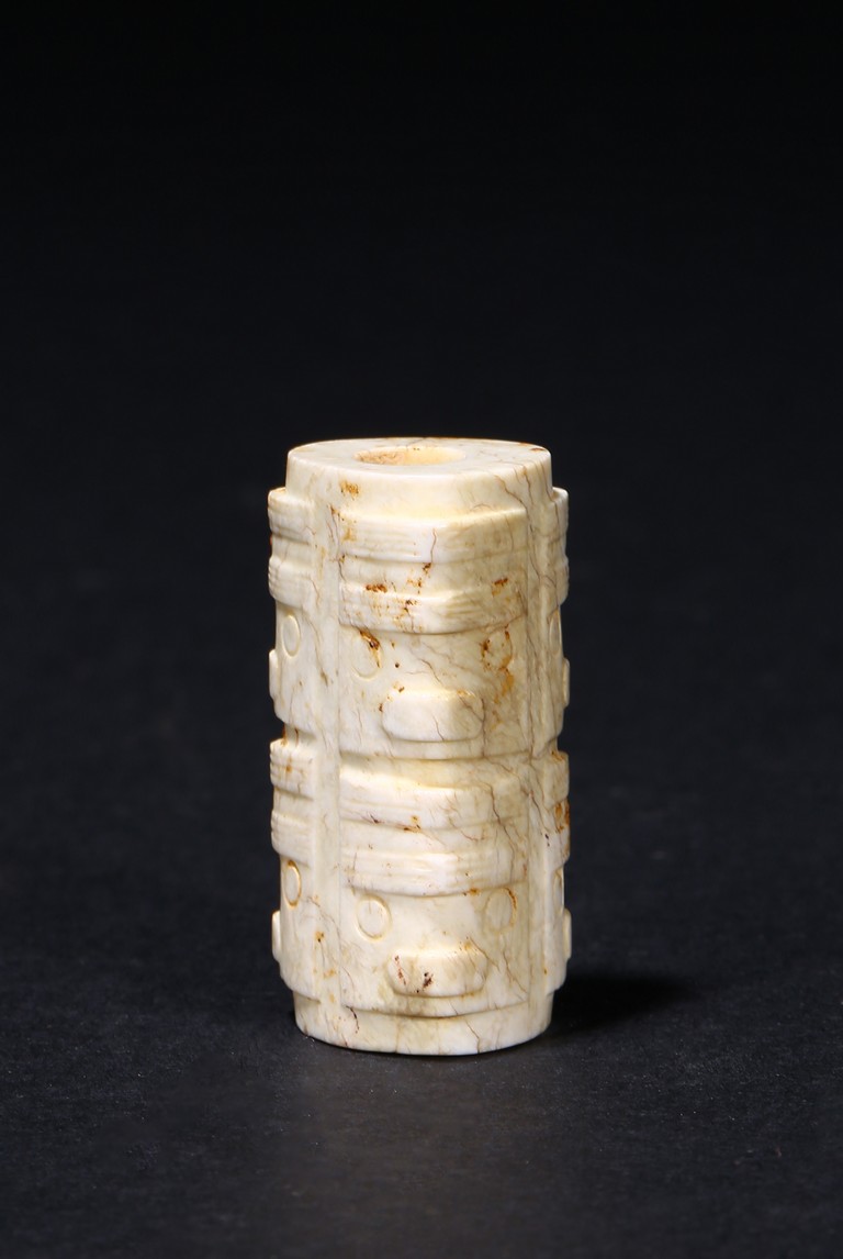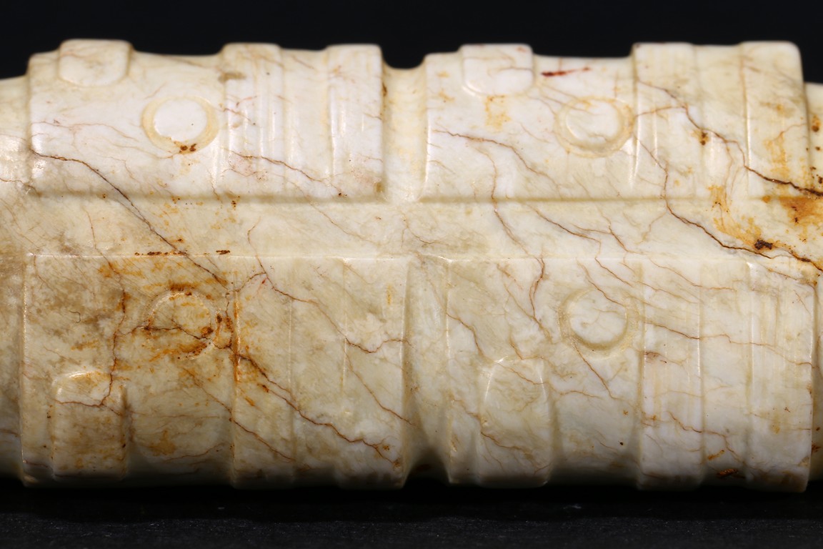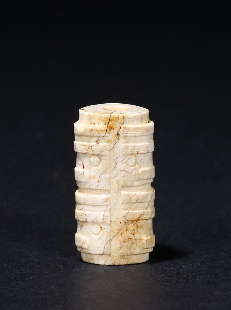 Of triangular cylindrical form, finely incised around the sides with two registers of taotie masks, the stone of a warm white tone. Liangzhu Culture.