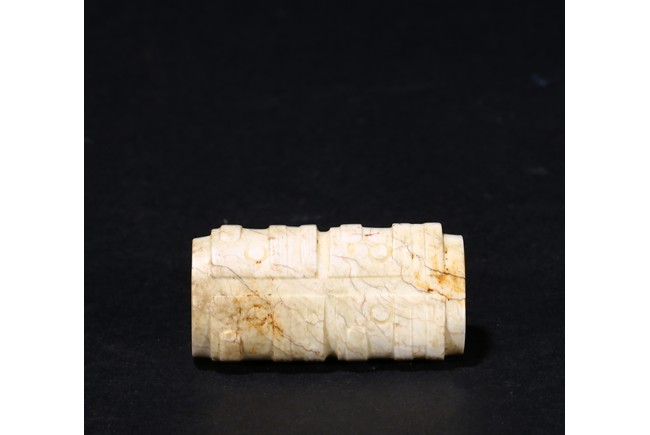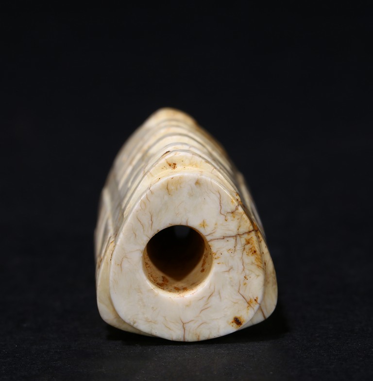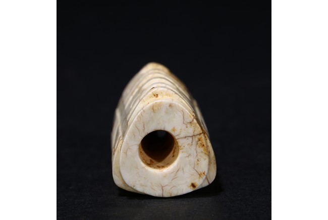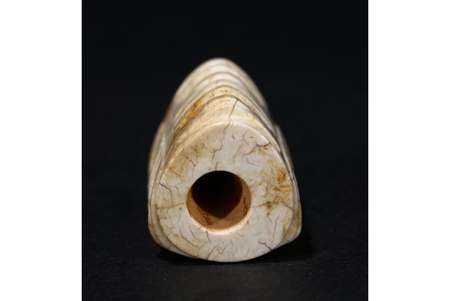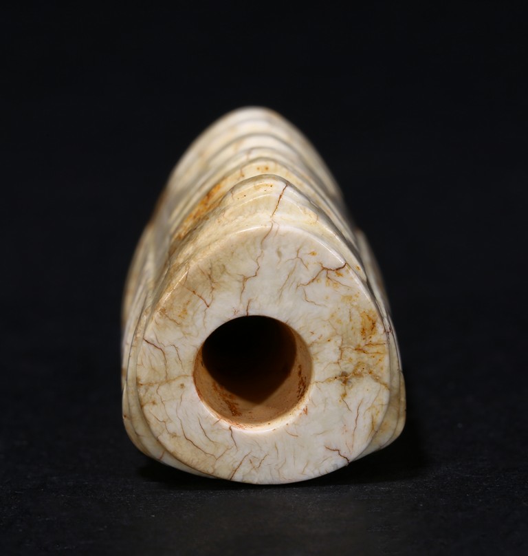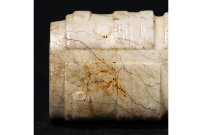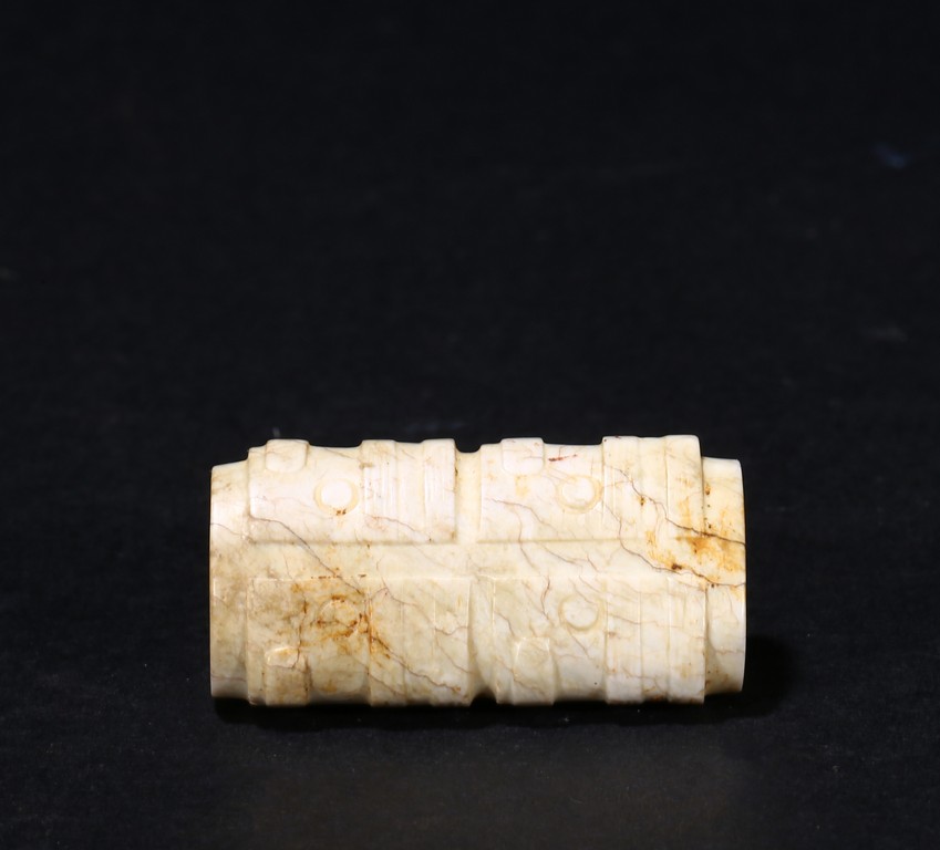 Of triangular cylindrical form, finely incised around the sides with two registers of taotie masks, the stone of a warm white tone. Liangzhu Culture.