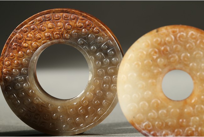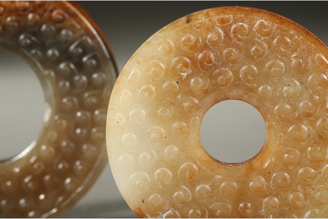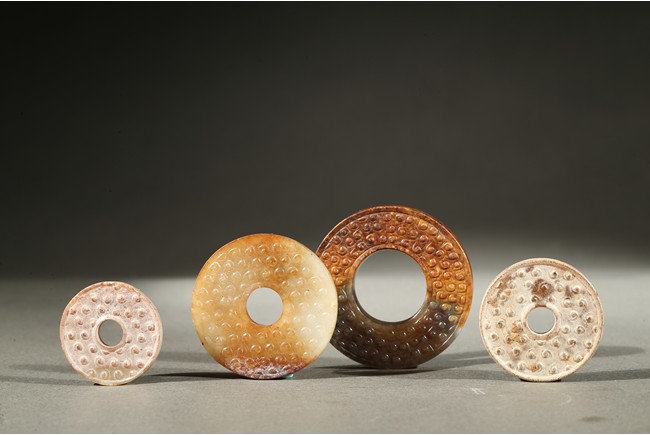 The group includes a ltwo calcified discs, a celadon and russet jade disc, and a white and russet jade disc, all carved with raised spiral pattern. Eastern Zhou/Han Dynasty period.