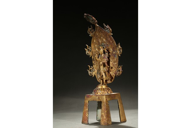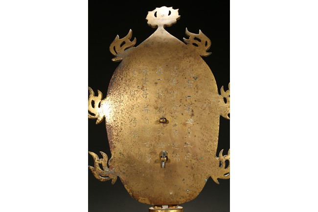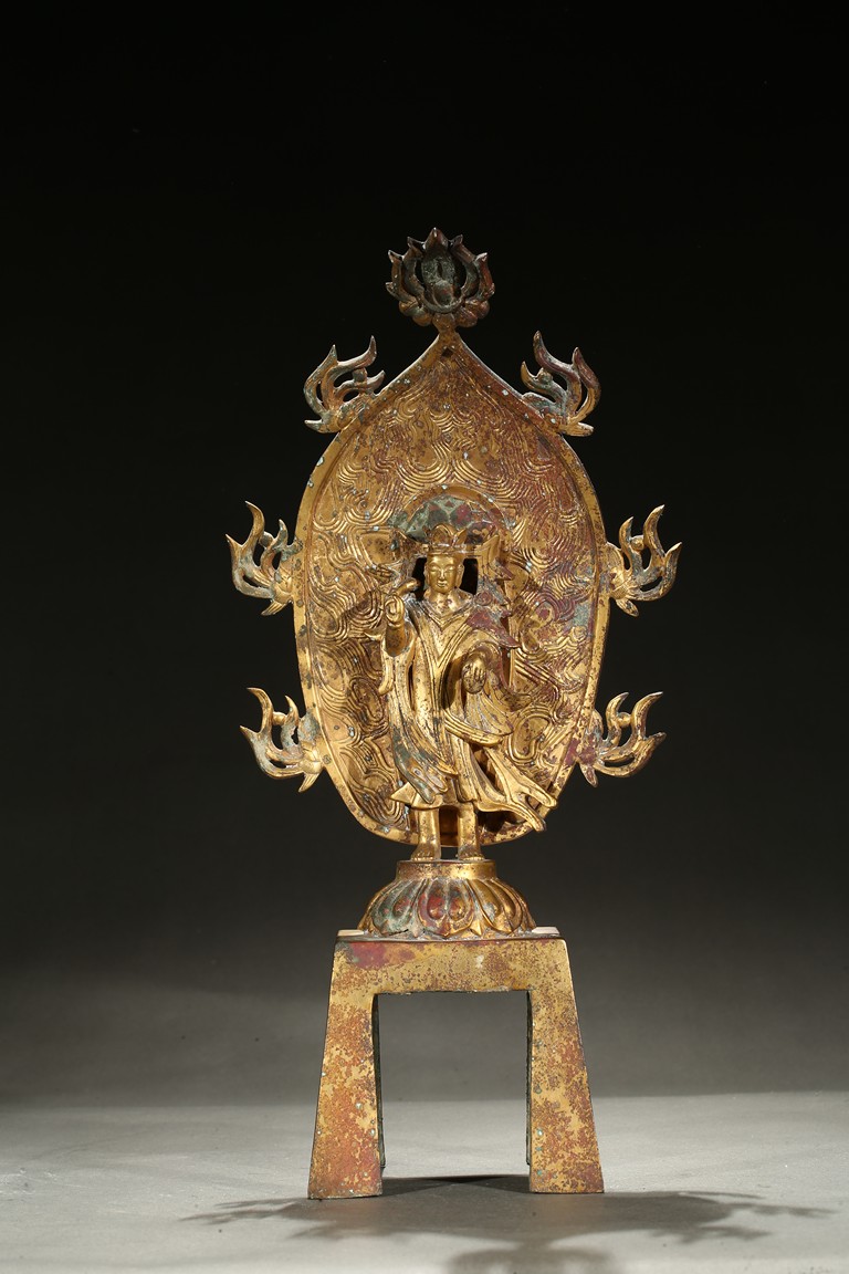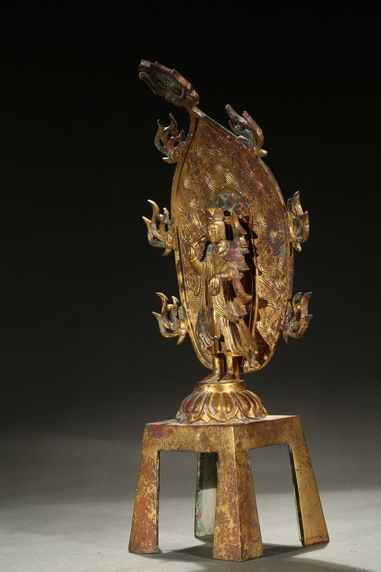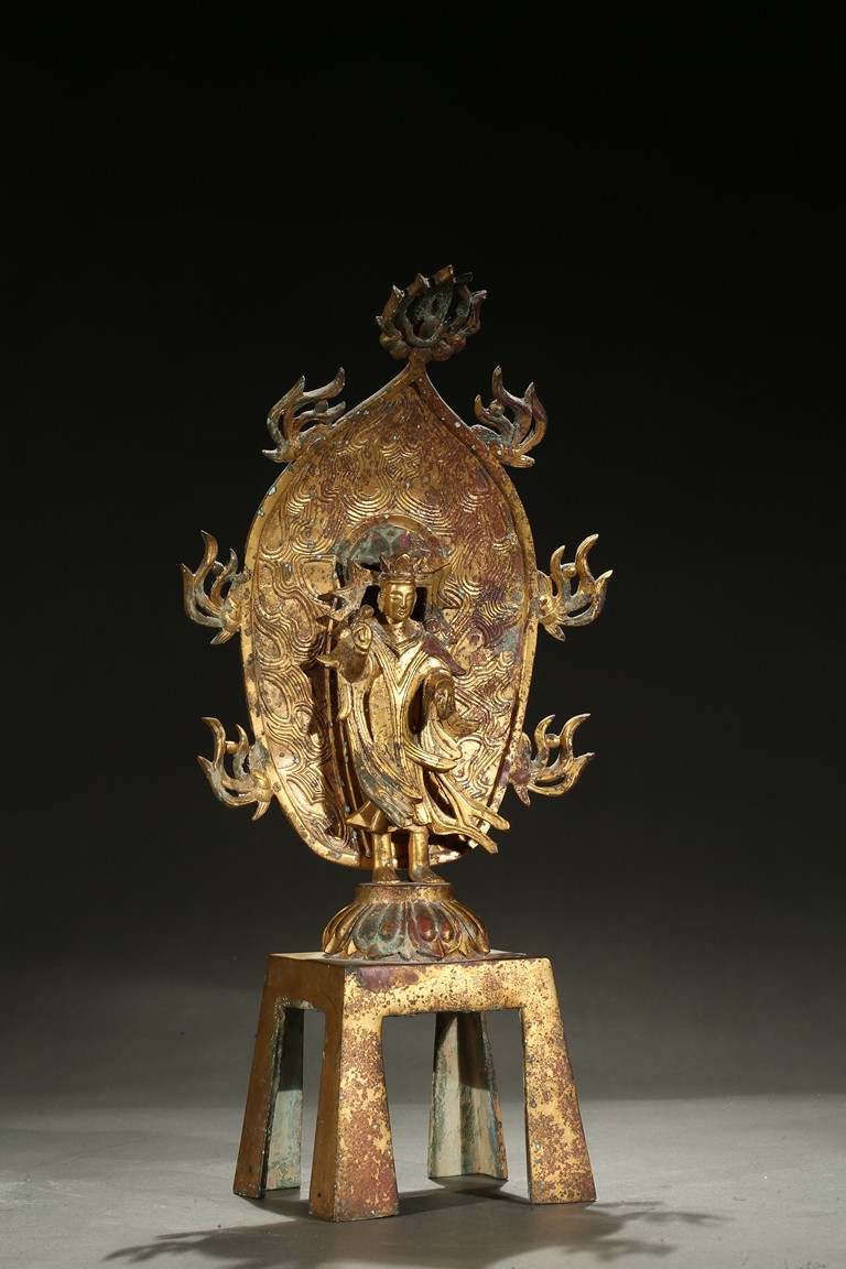 Cast standing upon a lotus throne, back against a finely detailed mandorla framed by flaming decorations, shown right hand holding a lotus stem, wearing dhoti with voluminous folds, face with serene expression, the reverse with possibly later added inscriptions. Northern Wei Dynasty period or later.