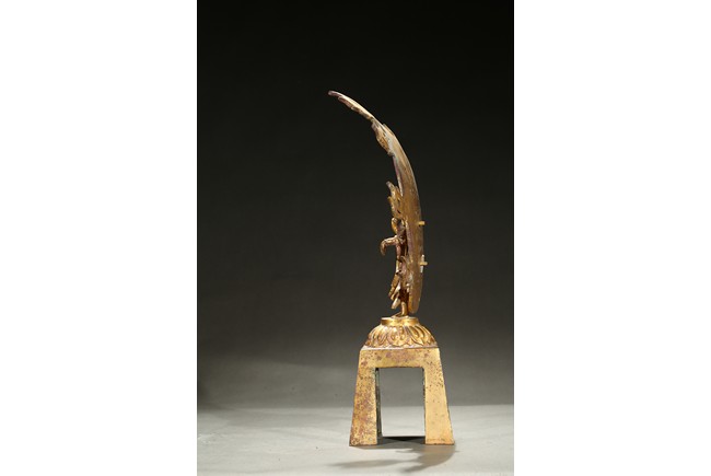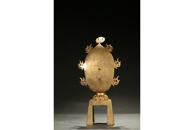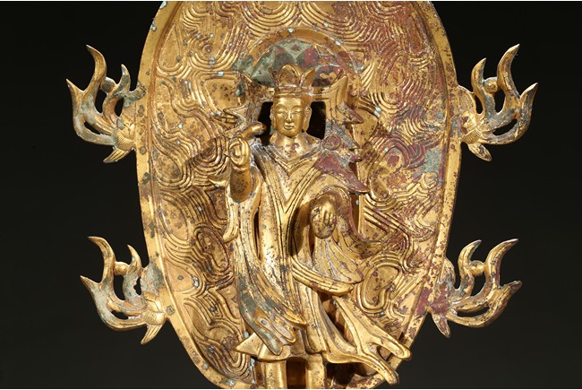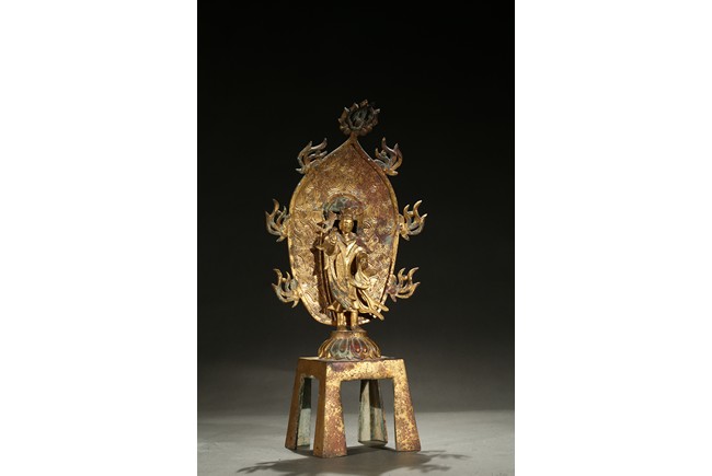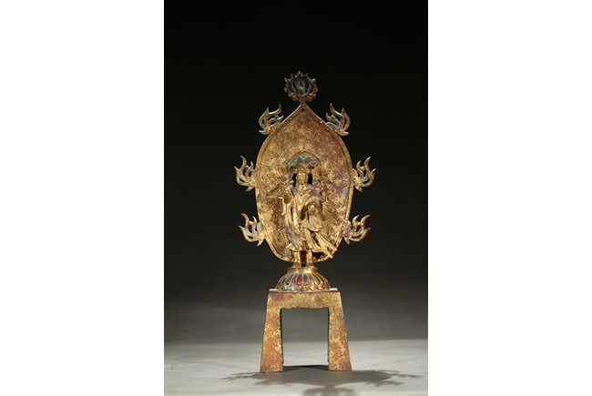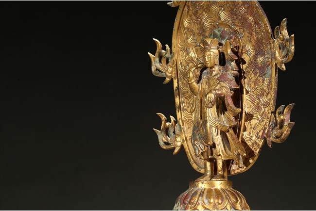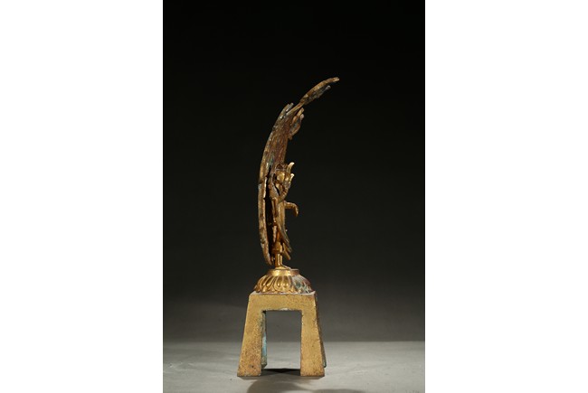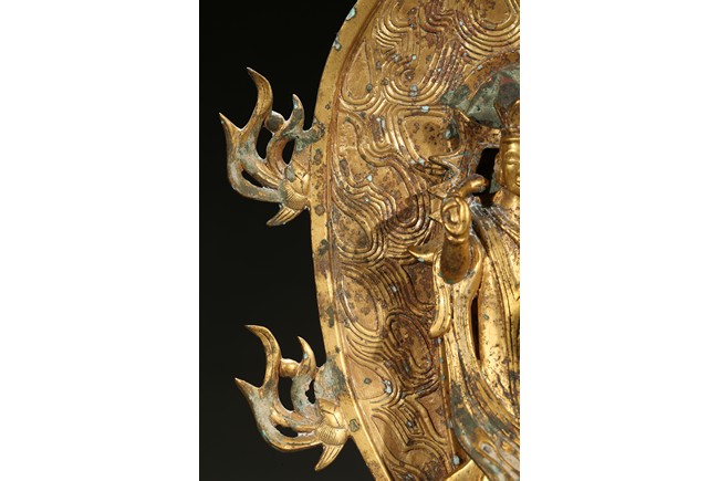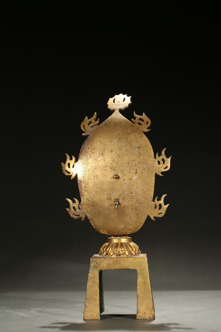 Cast standing upon a lotus throne, back against a finely detailed mandorla framed by flaming decorations, shown right hand holding a lotus stem, wearing dhoti with voluminous folds, face with serene expression, the reverse with possibly later added inscriptions. Northern Wei Dynasty period or later.
