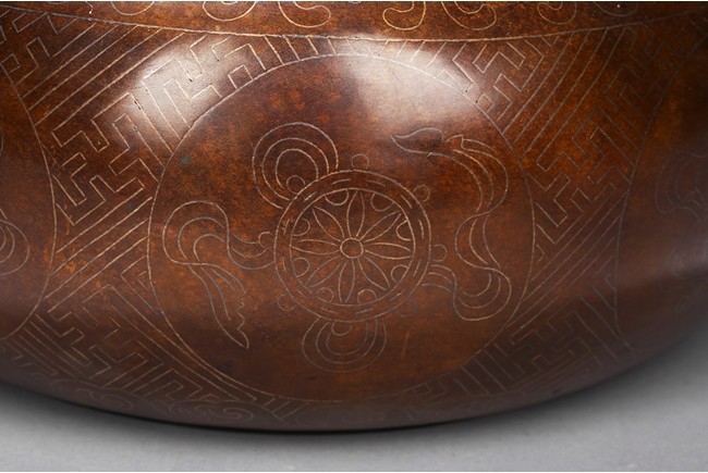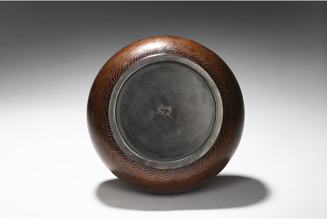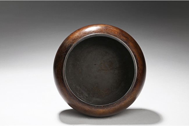 Of compressed globular form, the body inlaid with silver wire around the exterior the eight auspicious emblems enclosed in mendallion, the base with two character shi sou mark. Qing Dynasty period.