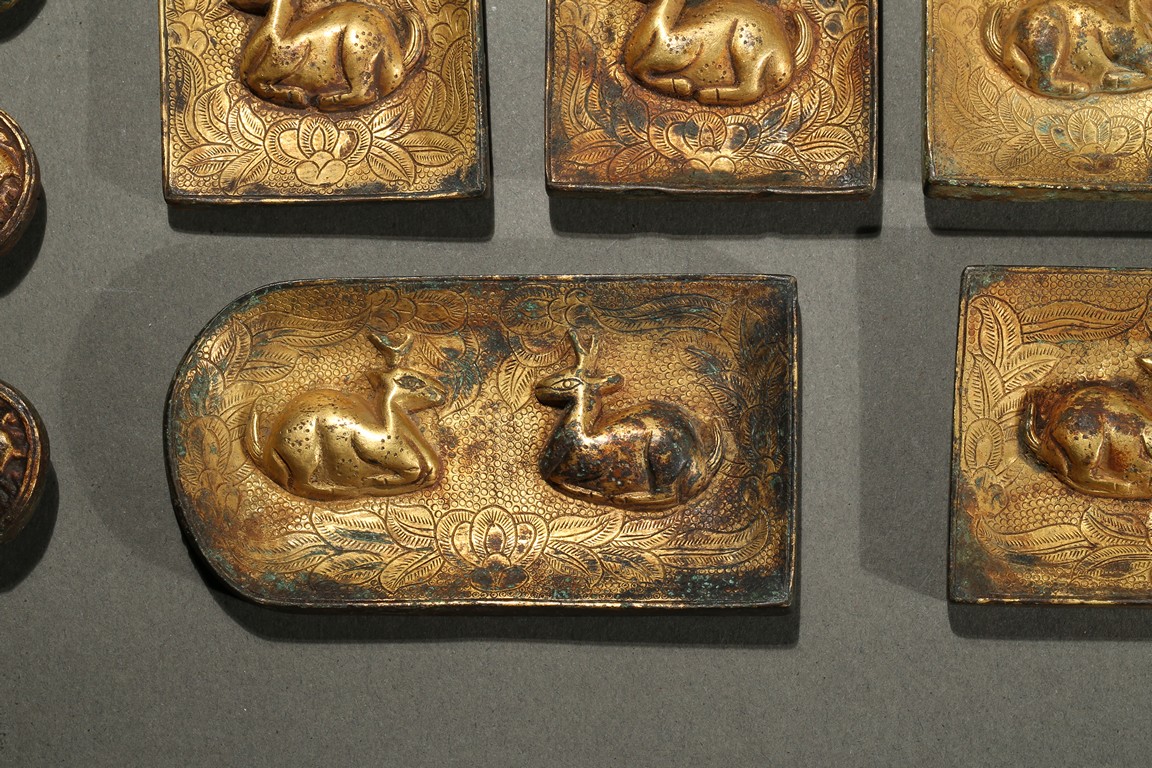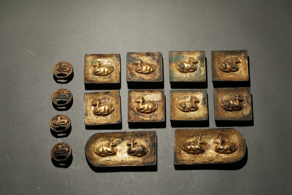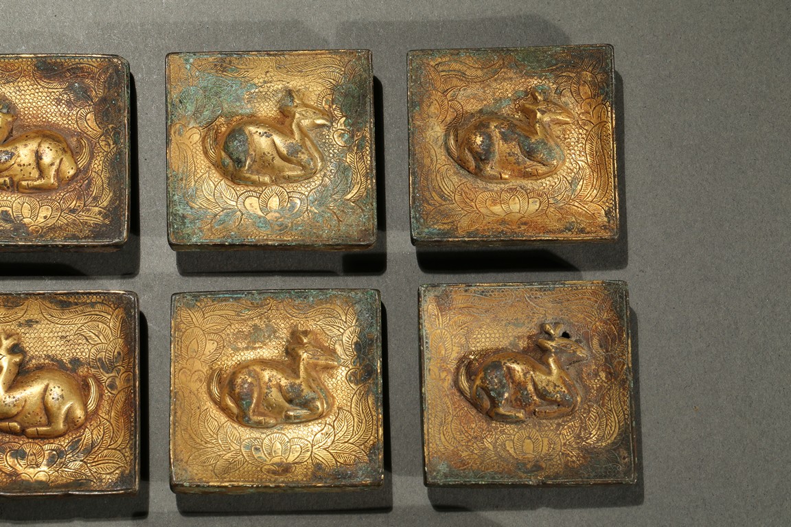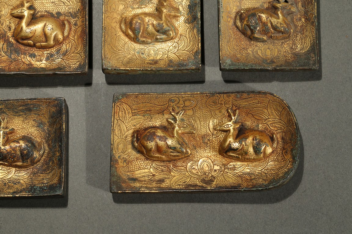 Consisting of eight square plaques, each worked in repousee with seated deer in relief, with finely incised floral ground; two rounded rectangular plaques with a deer pair; and four circular ornaments with similar deer design. Western Han Dynasty period.