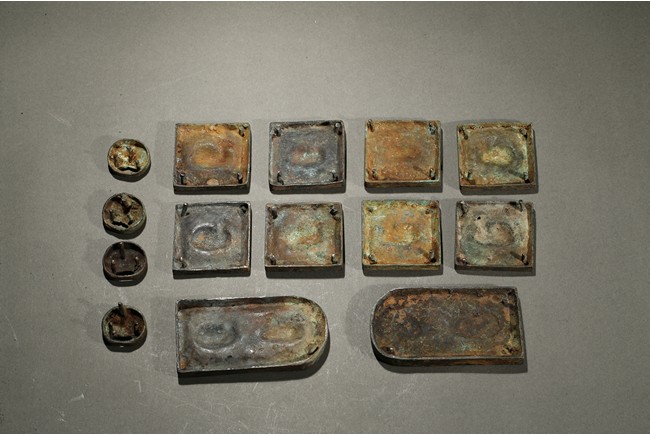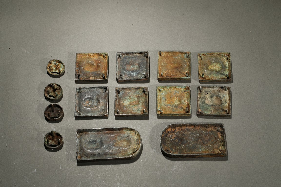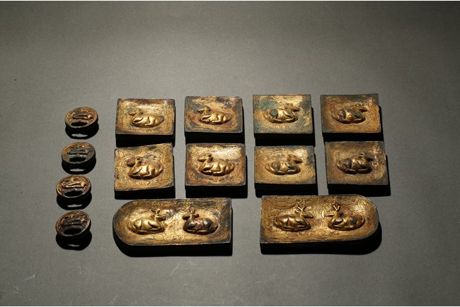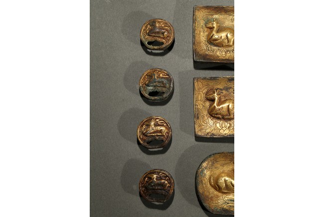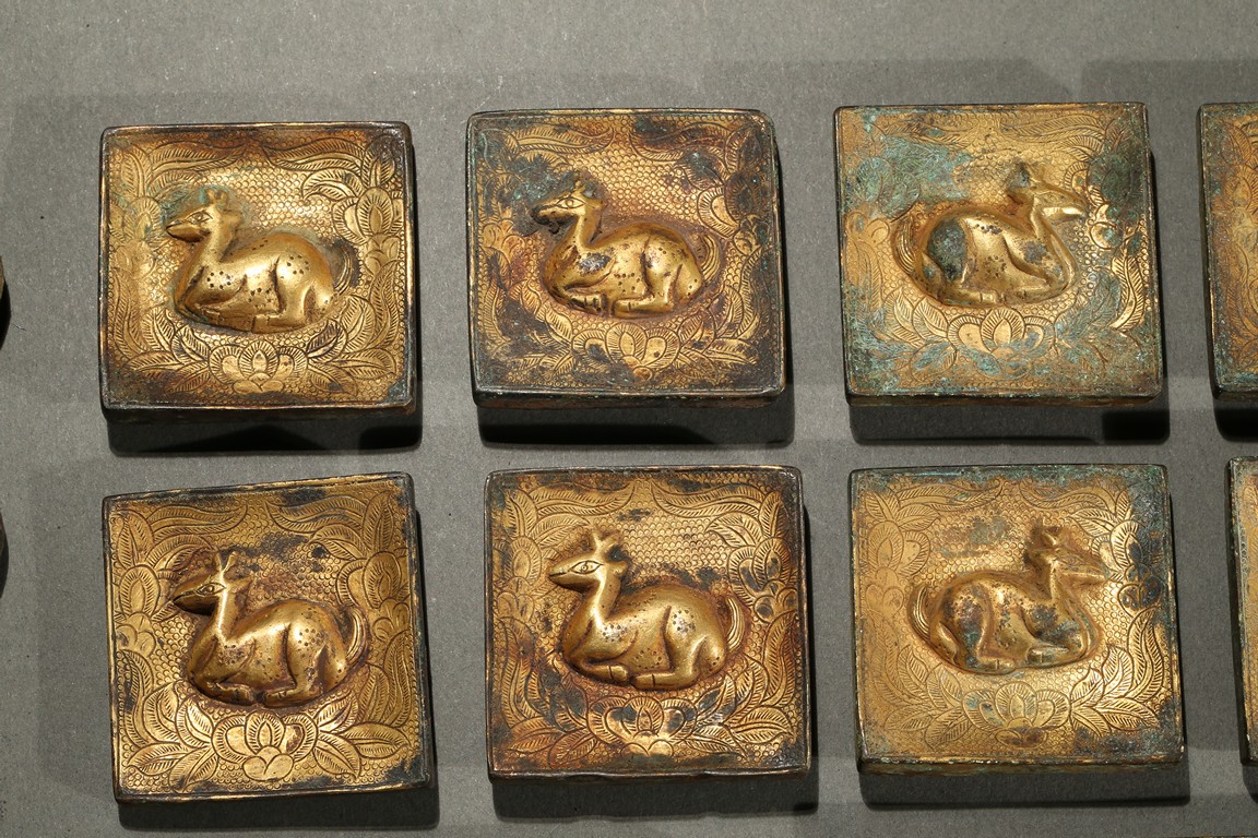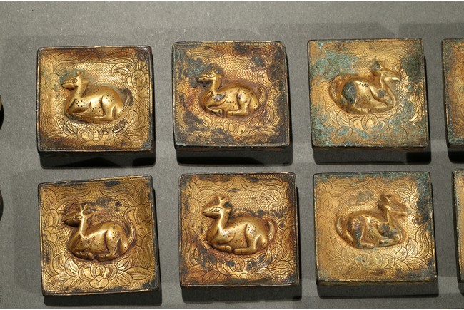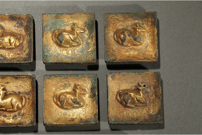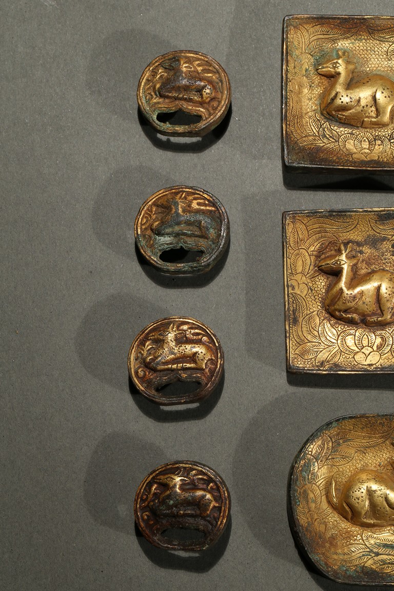 Consisting of eight square plaques, each worked in repousee with seated deer in relief, with finely incised floral ground; two rounded rectangular plaques with a deer pair; and four circular ornaments with similar deer design. Western Han Dynasty period.