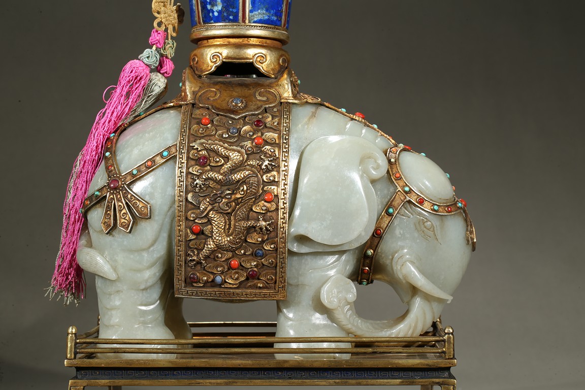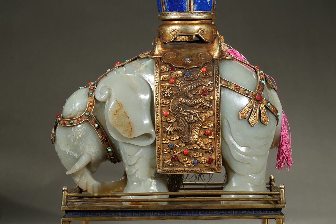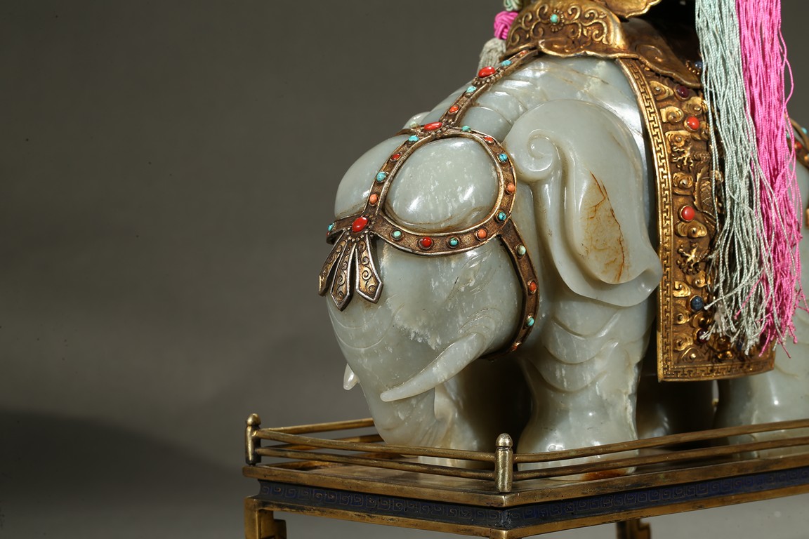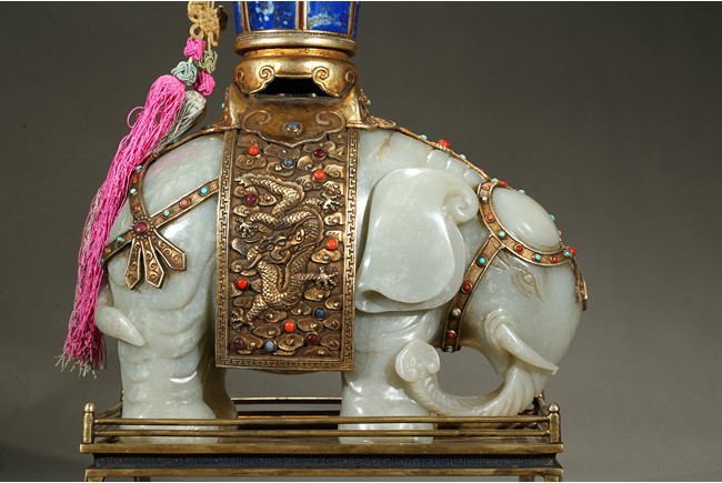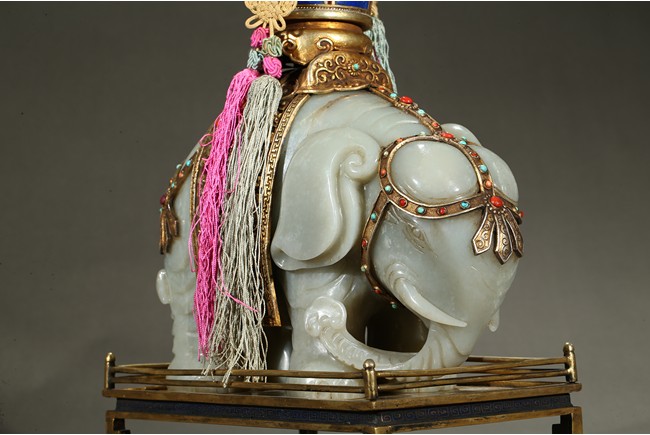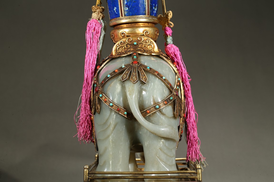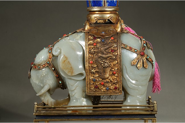 此青白玉太平有像擺件做工精細,造型準確,體形碩大,保存完整,實為難得。器主體為象形,背馱青金石瓶。大象體態渾圓,神情憨態可掬,身配瓔珞、綰具,背上搭一錦袱,上放鞍韉,寶瓶置於鞍上。像背上所置鞍韉、寶瓶為銅鎏金裝飾,圖樣繁覆而不亂,鑲紅寶,珊瑚,綠松,青金石等,華美異常。寶瓶插嵌靈芝,靈芝頭嵌瑪瑙,碧璽。“太平有像”,寓意天下太平,五谷豐登。此件用料奢華,工藝繁縟,制作精細,栩栩如生,令人嘆為觀止,一器之成必將費時日久,人力物力不可計數,堪稱案供神品。