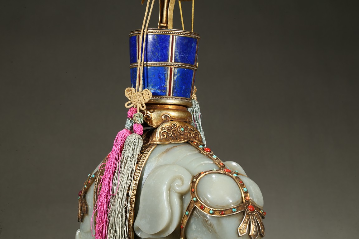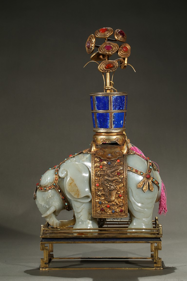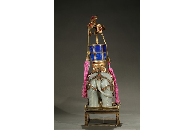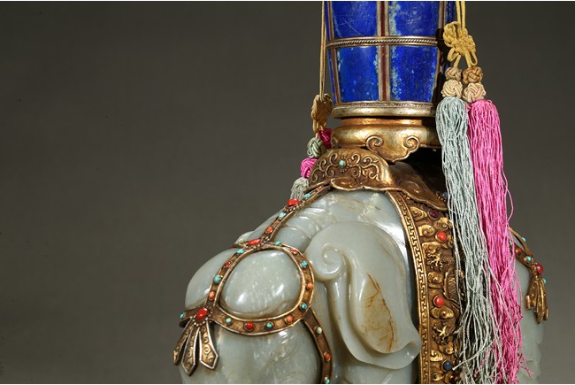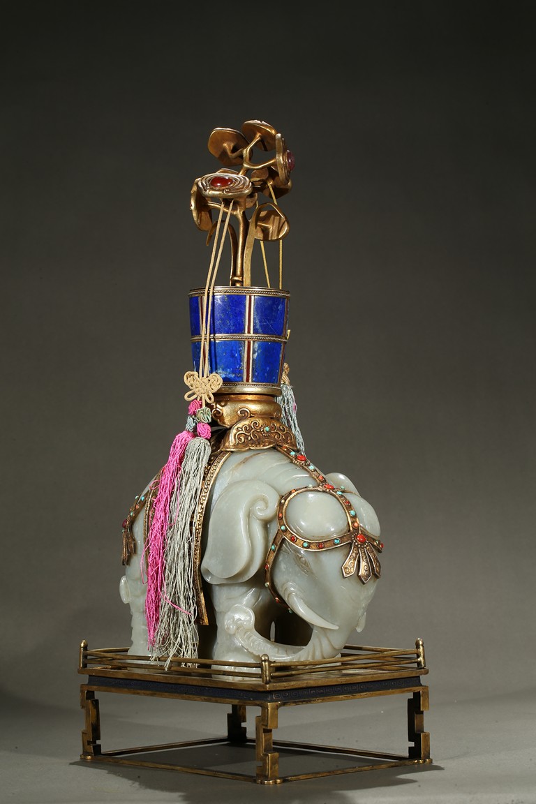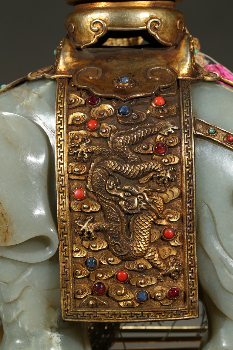 此青白玉太平有像擺件做工精細,造型準確,體形碩大,保存完整,實為難得。器主體為象形,背馱青金石瓶。大象體態渾圓,神情憨態可掬,身配瓔珞、綰具,背上搭一錦袱,上放鞍韉,寶瓶置於鞍上。像背上所置鞍韉、寶瓶為銅鎏金裝飾,圖樣繁覆而不亂,鑲紅寶,珊瑚,綠松,青金石等,華美異常。寶瓶插嵌靈芝,靈芝頭嵌瑪瑙,碧璽。“太平有像”,寓意天下太平,五谷豐登。此件用料奢華,工藝繁縟,制作精細,栩栩如生,令人嘆為觀止,一器之成必將費時日久,人力物力不可計數,堪稱案供神品。